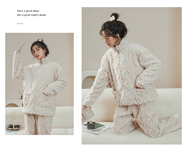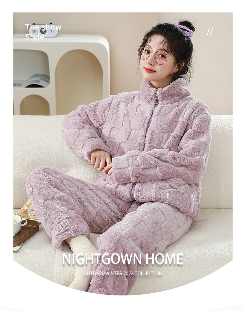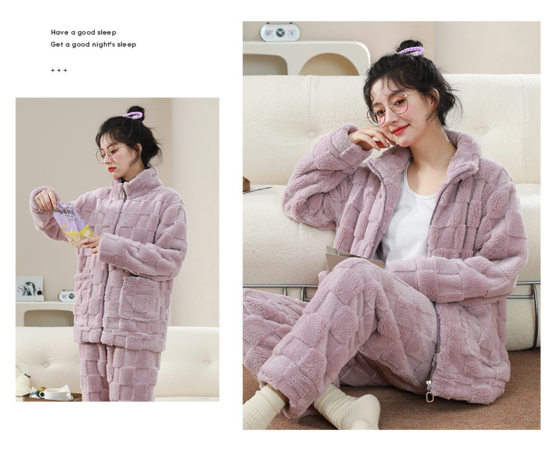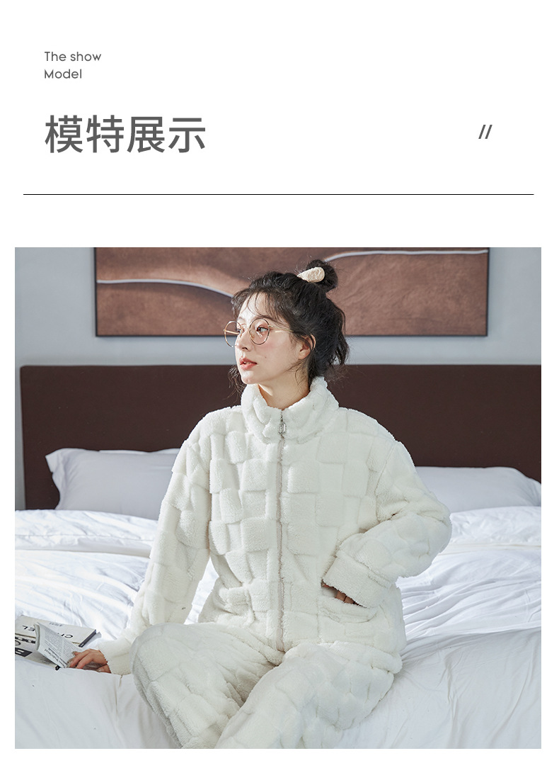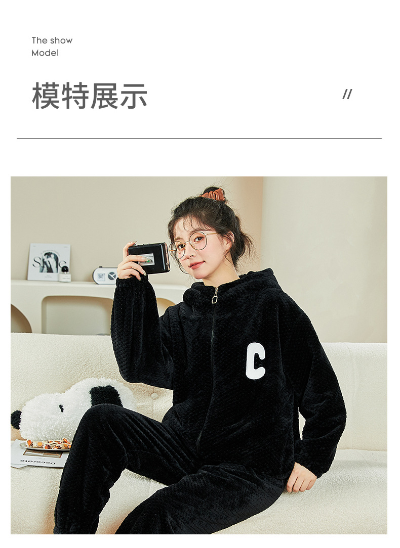 【可外穿睡衣女】秋冬季 法兰绒加厚立领 连帽拉链珊瑚绒家居服套装