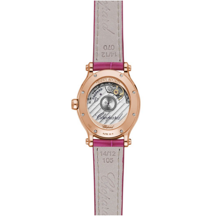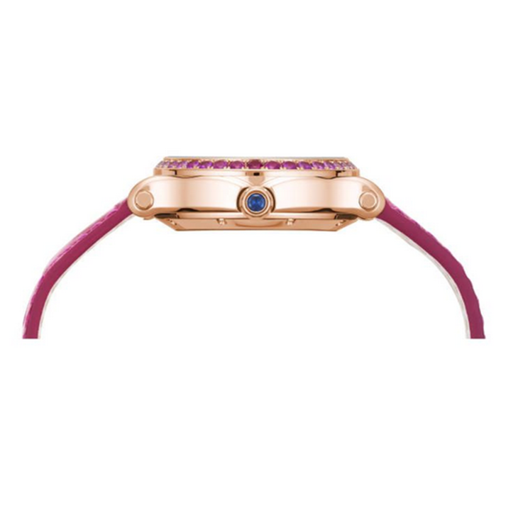 镜面材质 | 蓝宝石水晶玻璃 | 表盘 | 18K玫瑰金椭圆形镶粉红色宝石表壳 银色珍珠贝母与玑镂纹饰表盘 罗马文及条形时标 7钻-钻石0.05克拉 透底 |