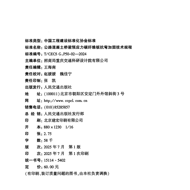 书名:公路混凝土桥梁预应力碳纤维板抗弯加固技术规程(T/CECS G:P50-02—2024)