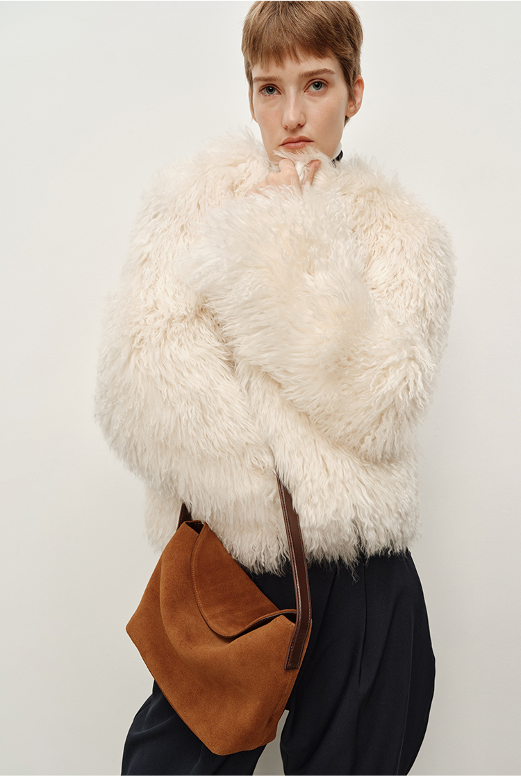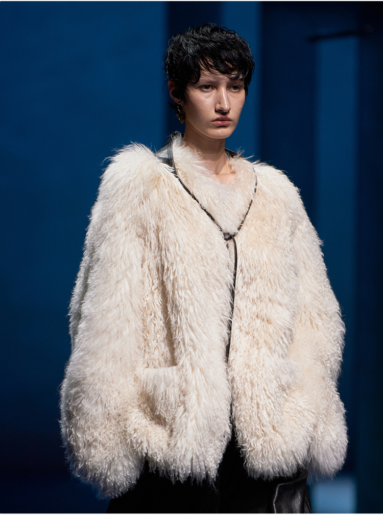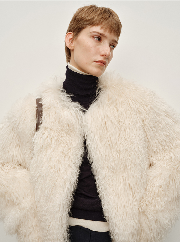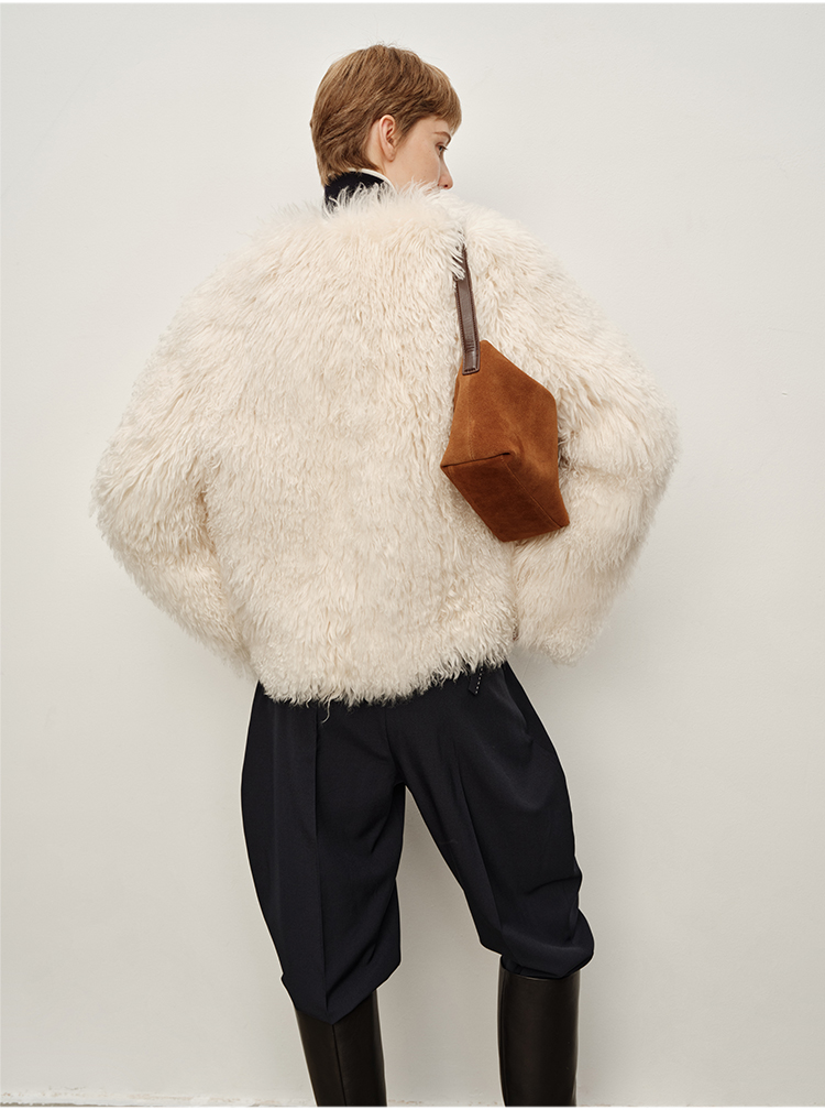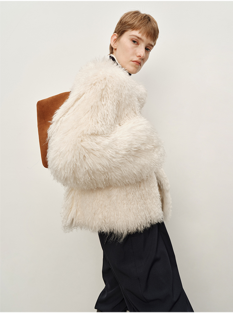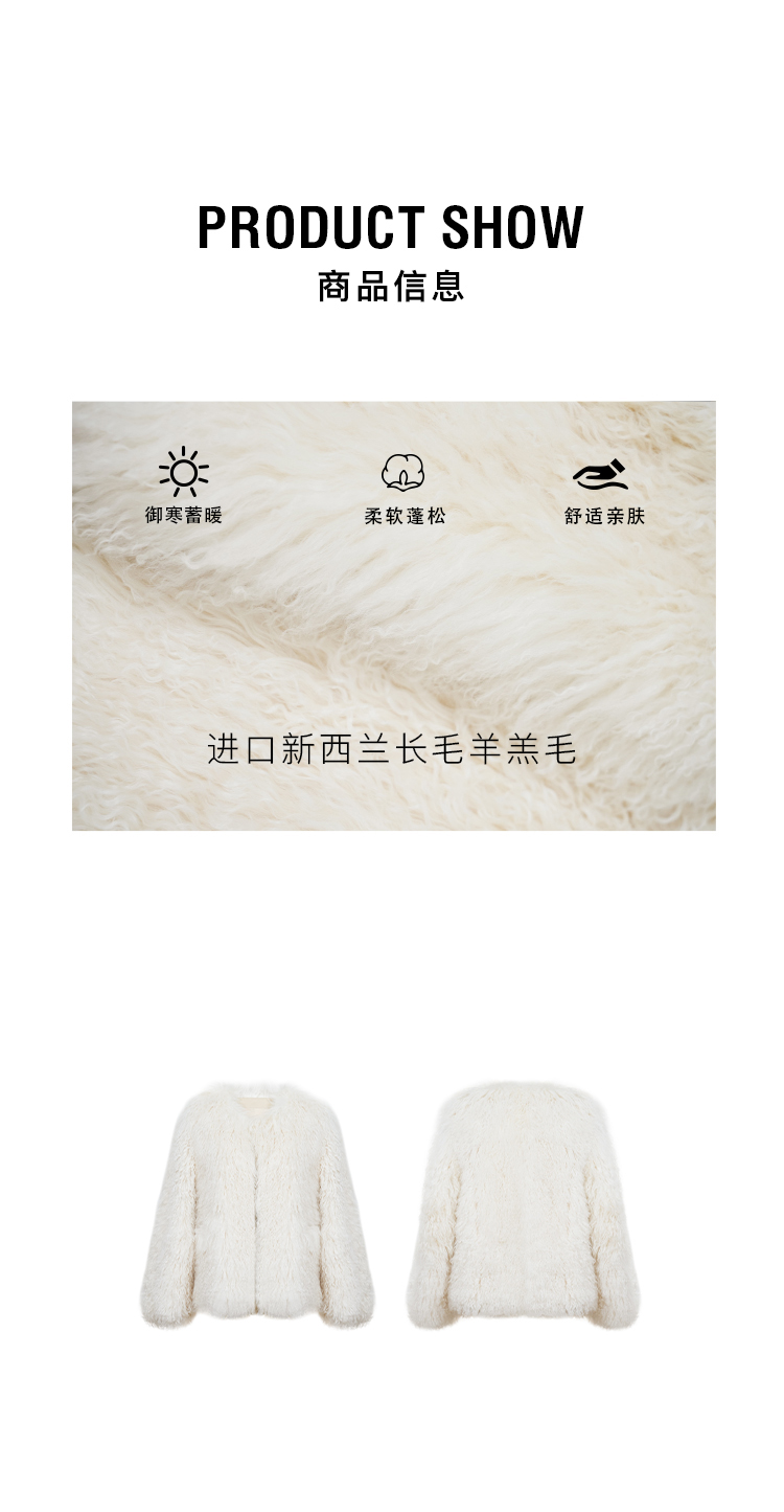 HIDEMI 进口新西兰长毛羊羔毛环保未染色皮毛一体外套 自然白