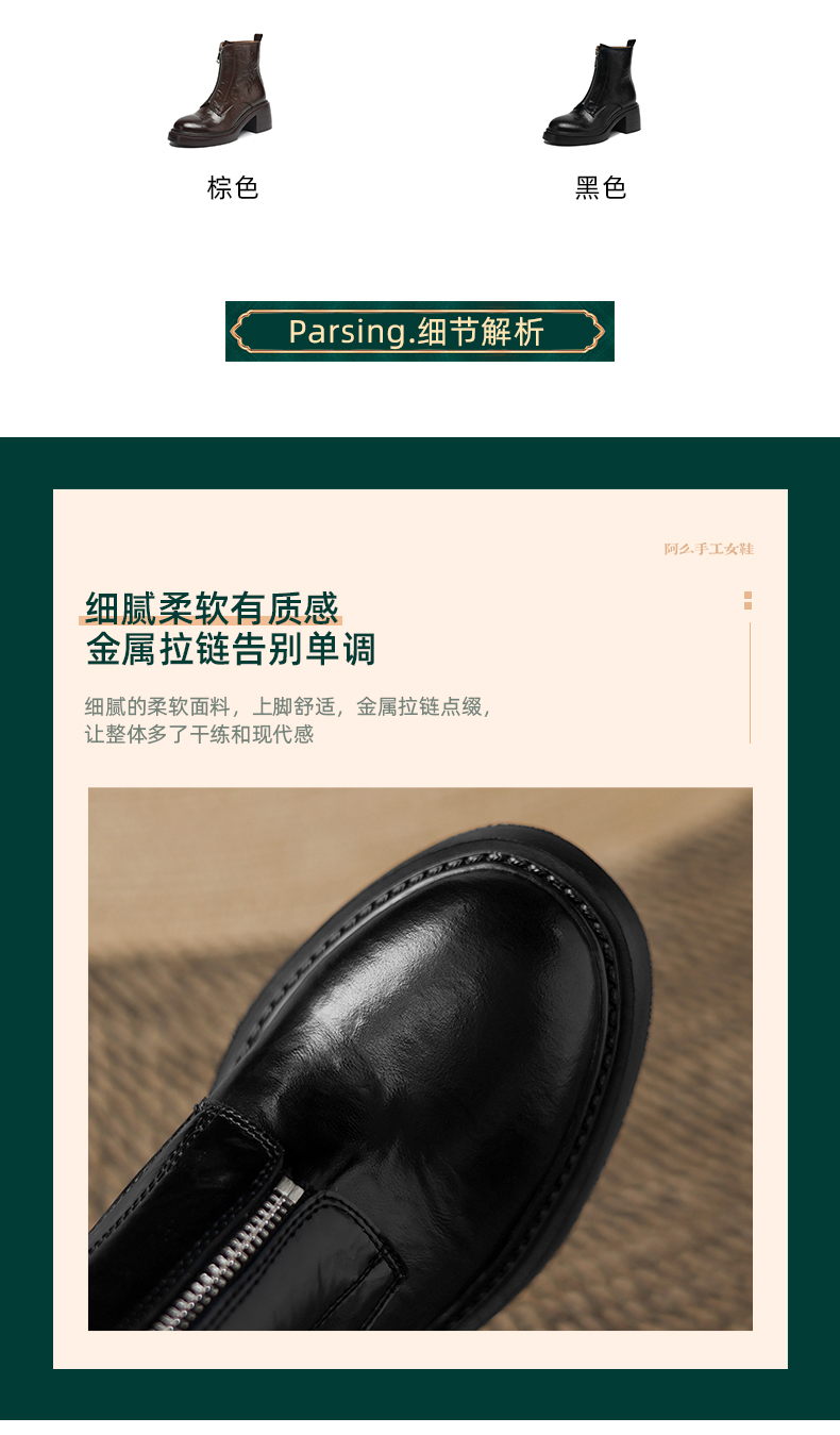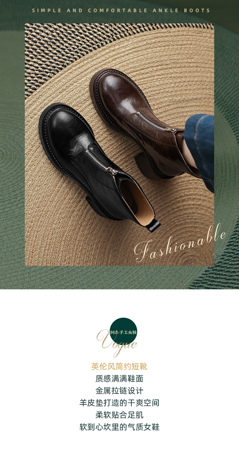 阿么手工女鞋前拉链棕色小短靴女2025新款冬季粗跟通勤靴子6.5CM