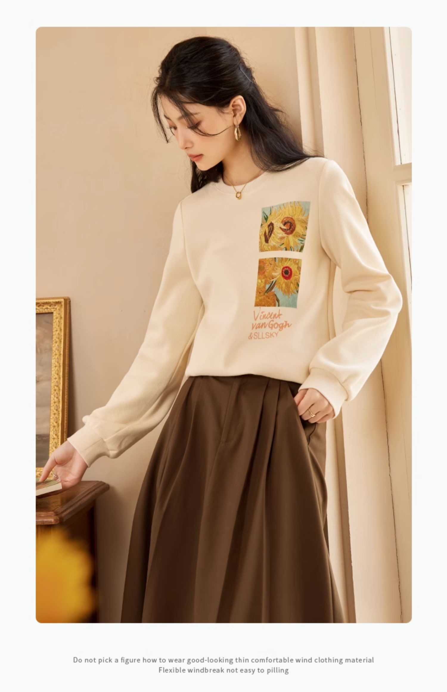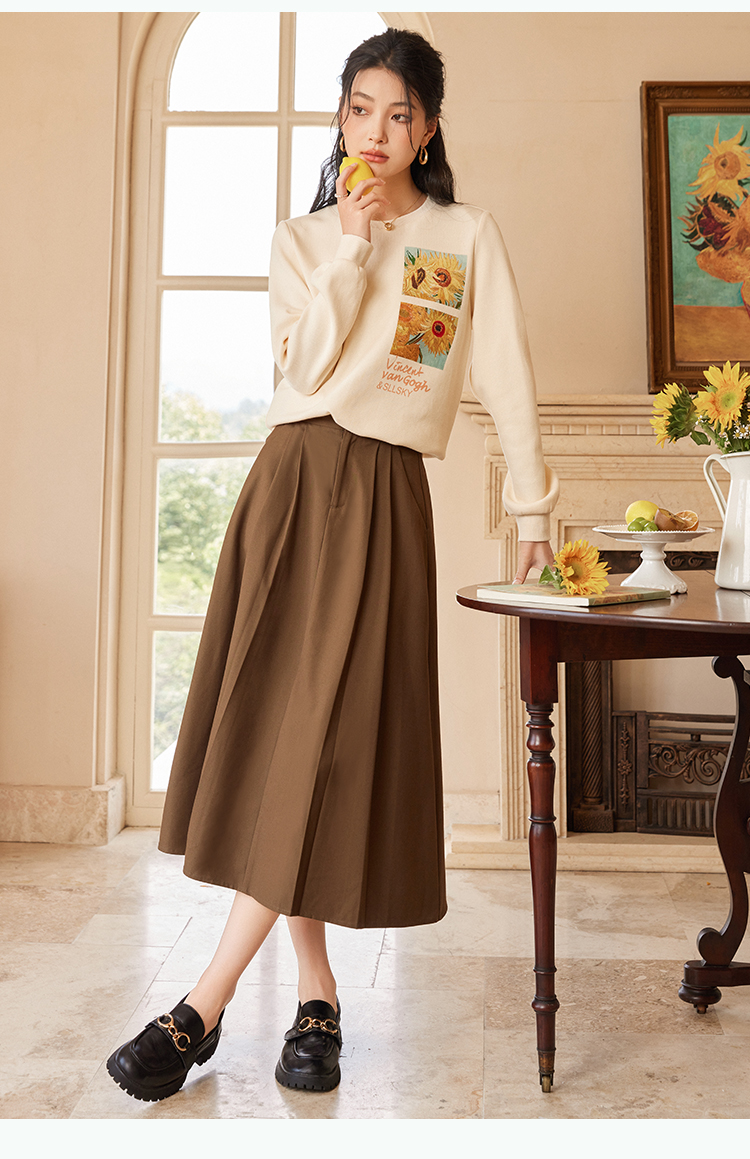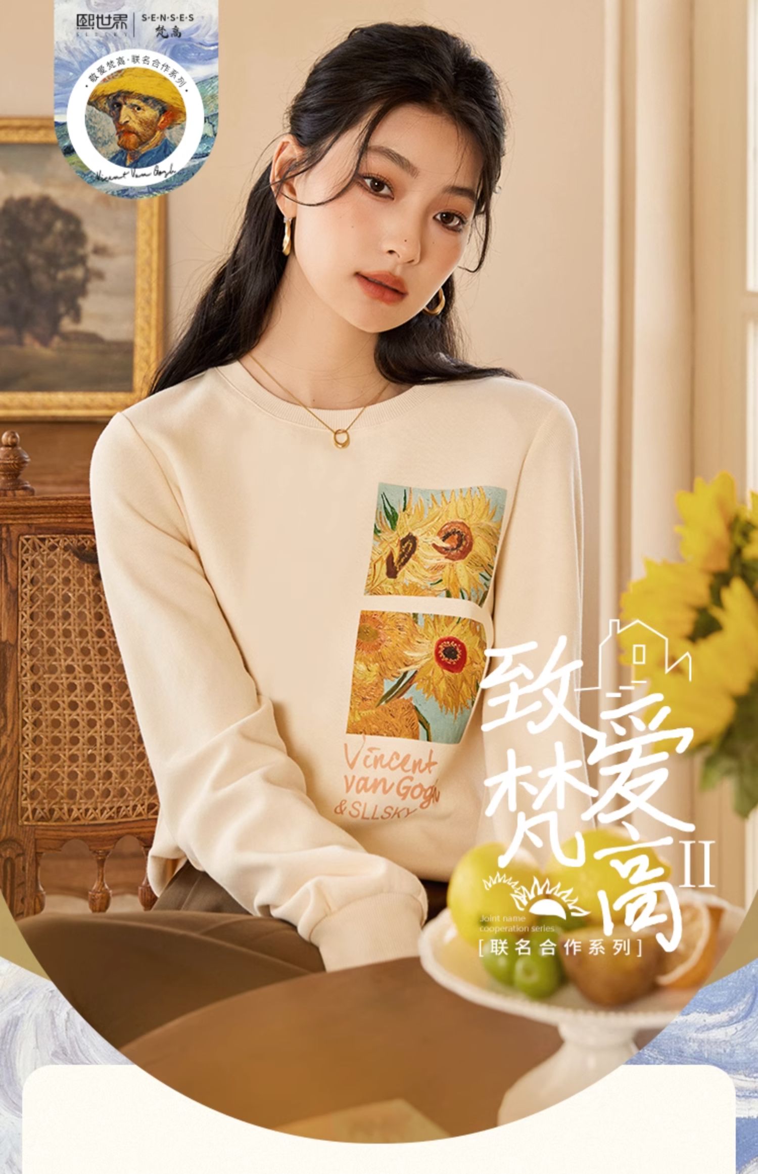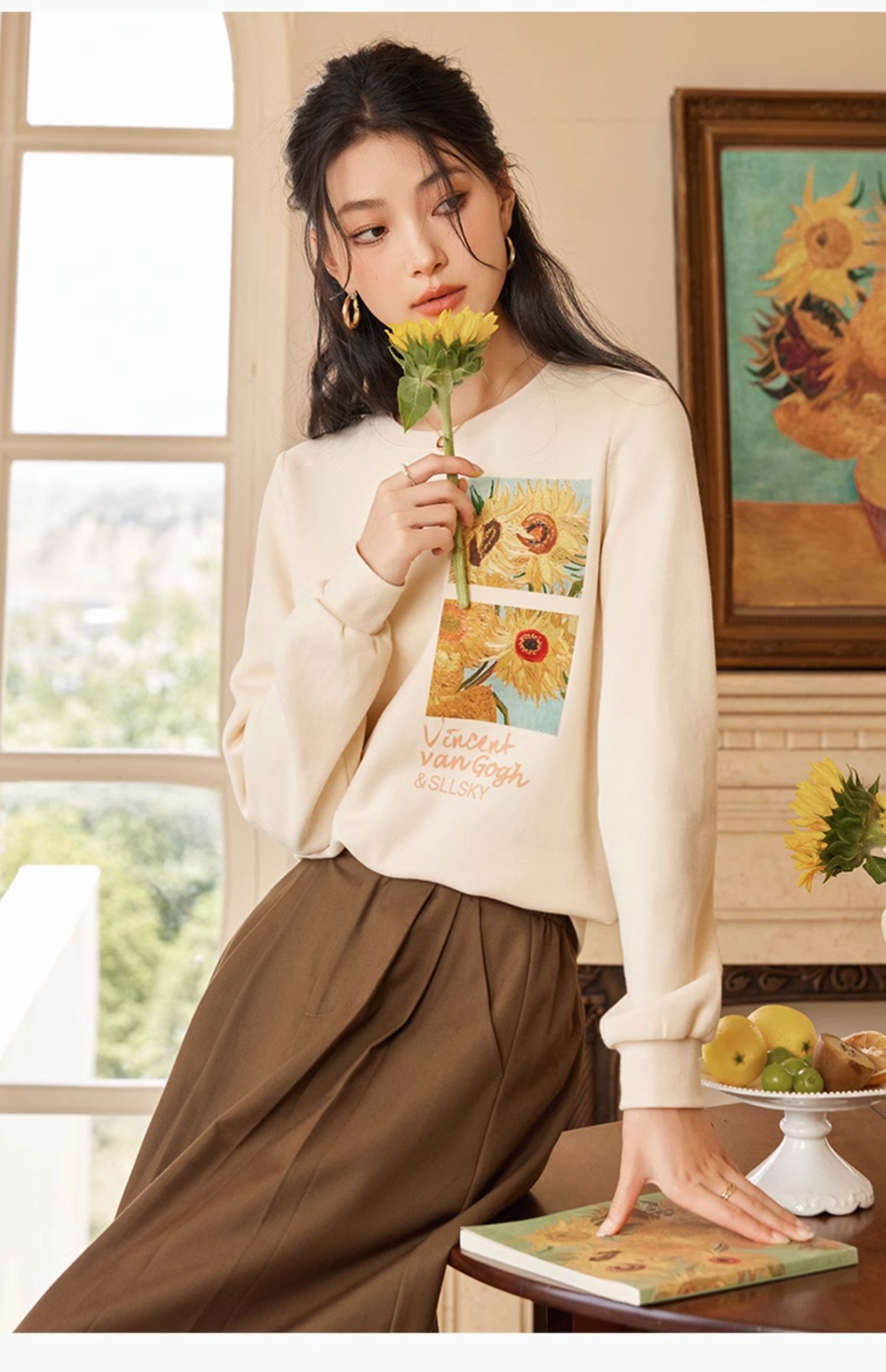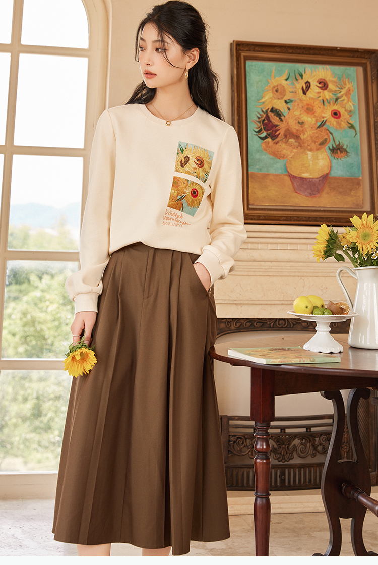 【59元福袋不支持退换】梵高联名熙世界向日葵印花圆领卫衣女2024秋秋宽松慵懒无帽套头上衣