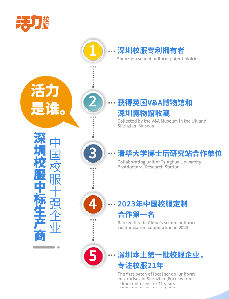 活力校服由深圳市中南活力实业股份有限公司创建的品牌,深圳二十一年老品牌,教育局中标企业;主营深圳校服、广州校服、东莞校服、佛山校服、肇庆校服、江苏校服、鞋袜、学生床上用品等学生课桌椅一站式教育领域产品