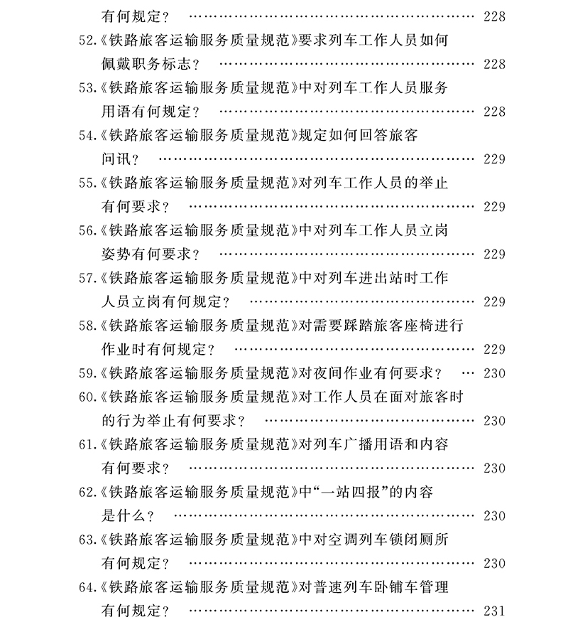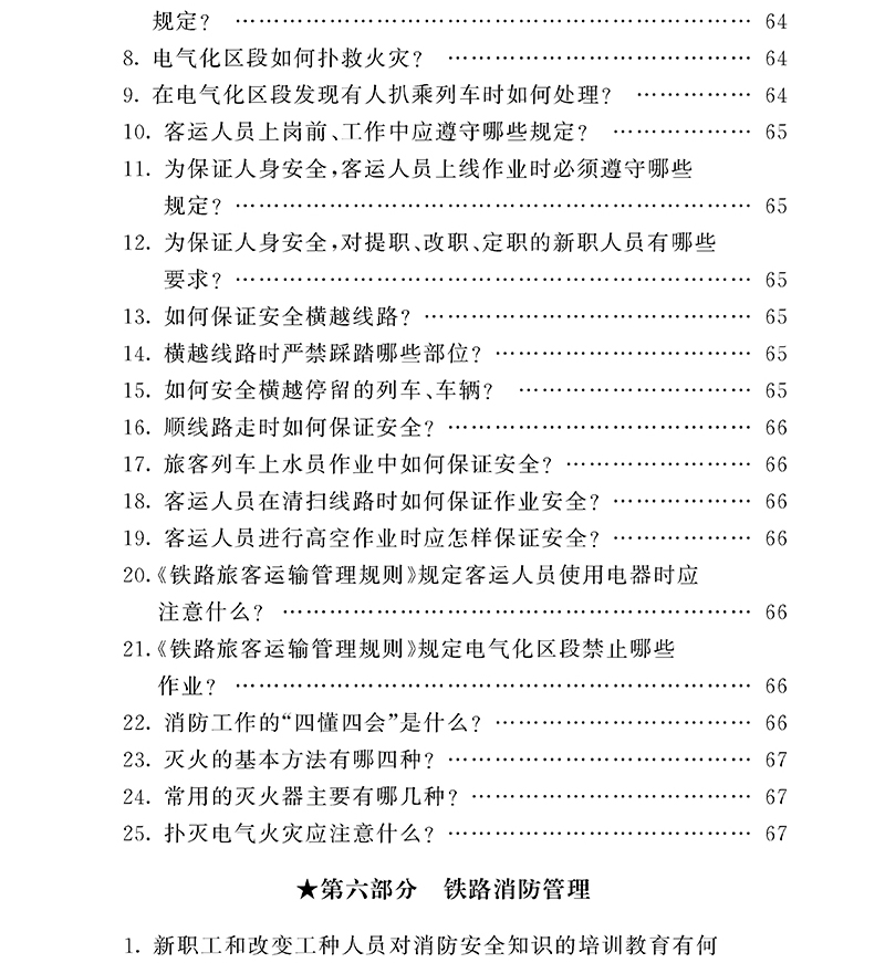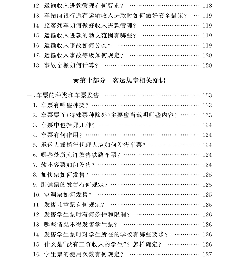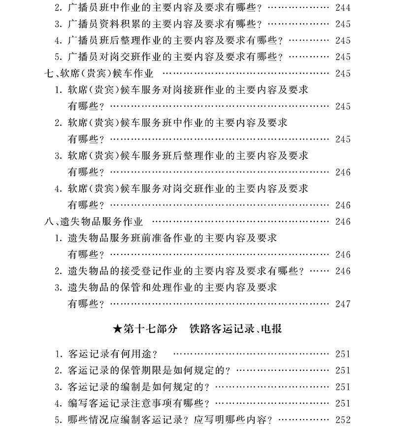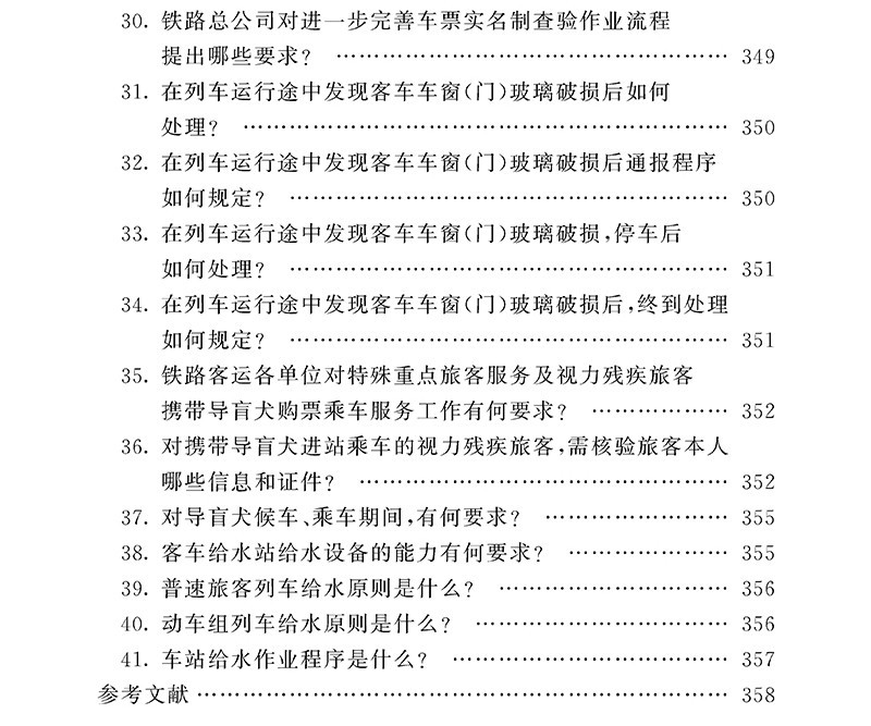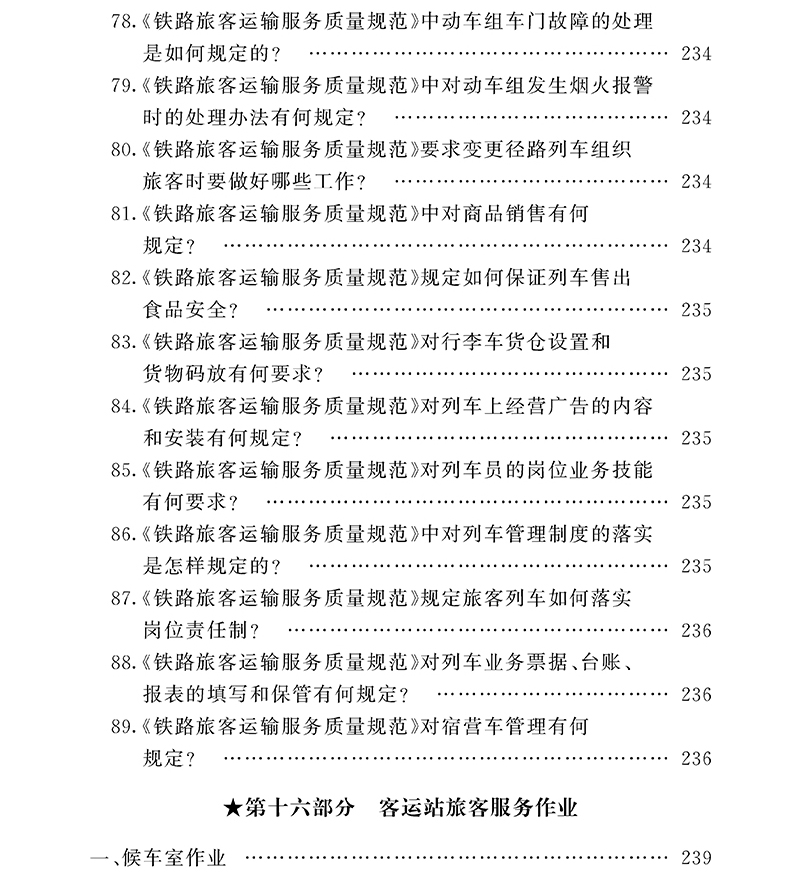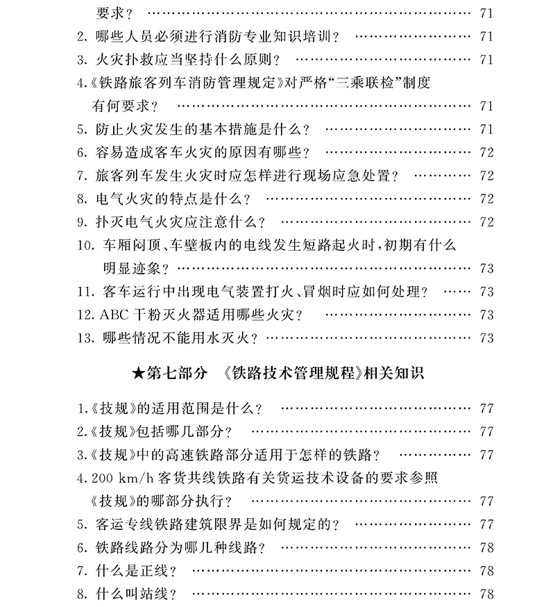 本书主要内容包括铁路职业道德,铁路路风管理,铁路安全风险管理及法律法规相关知识,铁路旅客运输安全检查管理办法及铁路安全管理条例,客运人员电气化安全、人身、作业、消防安全,铁路消防管理办法,铁路技术管理规程,铁路旅客计划运输组织工作办法,铁路运输收入管理规程,客运规章相关知识,铁路旅客车票实名制管理办法,互联网订票和电话订票相关知识,旅客运输管理规程,路内运输,铁路旅客运输服务质量规范,铁路客运记录、电报,铁路旅客人身伤害及携带品损失处理暂行办法,应急处置预案及处理方法,铁路交通事故调查处理规则,卫生防疫及红十字应急抢救,铁路军事运输,旅客运输服务心理相关知识及铁路总公司相关文件等。