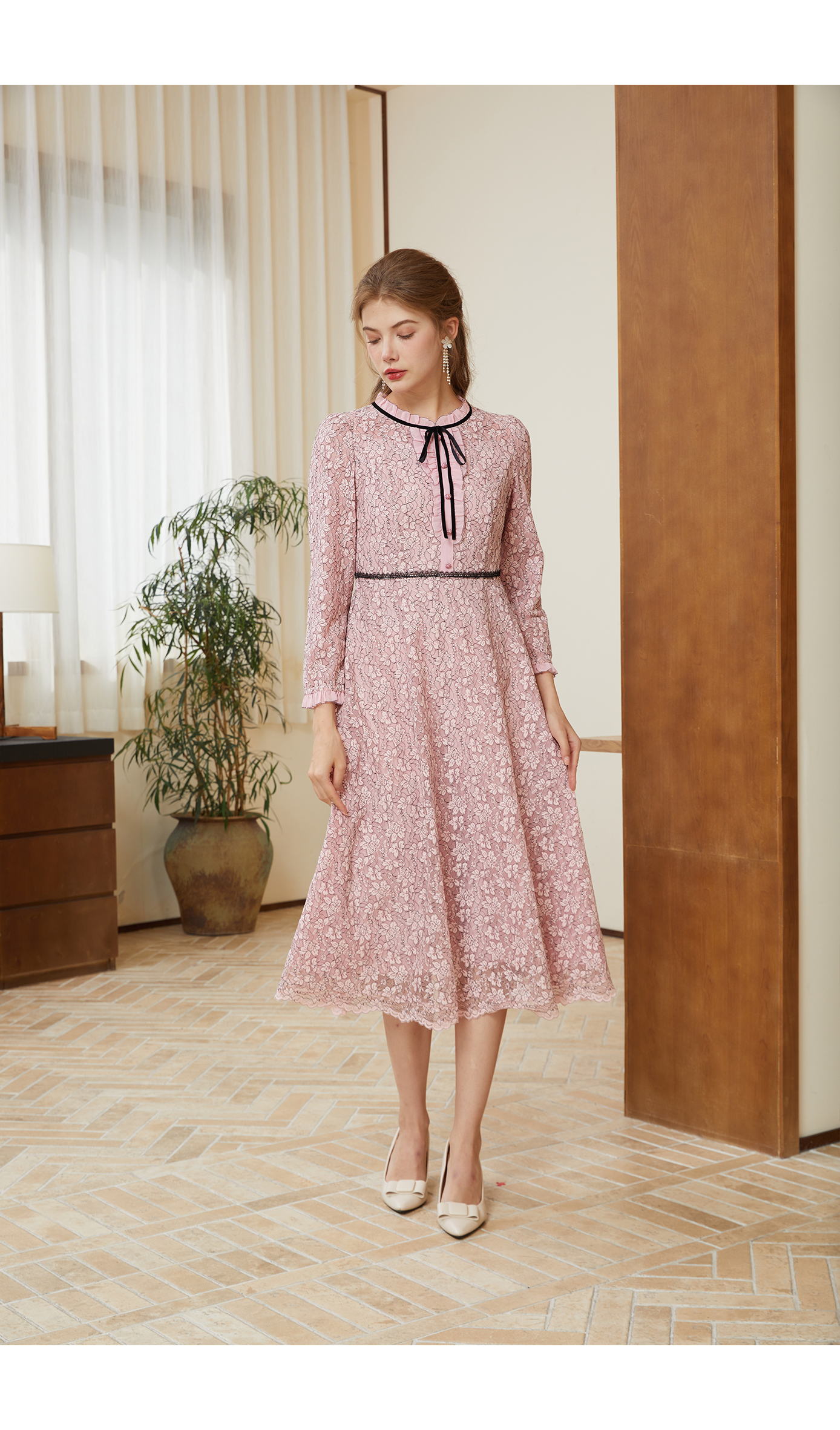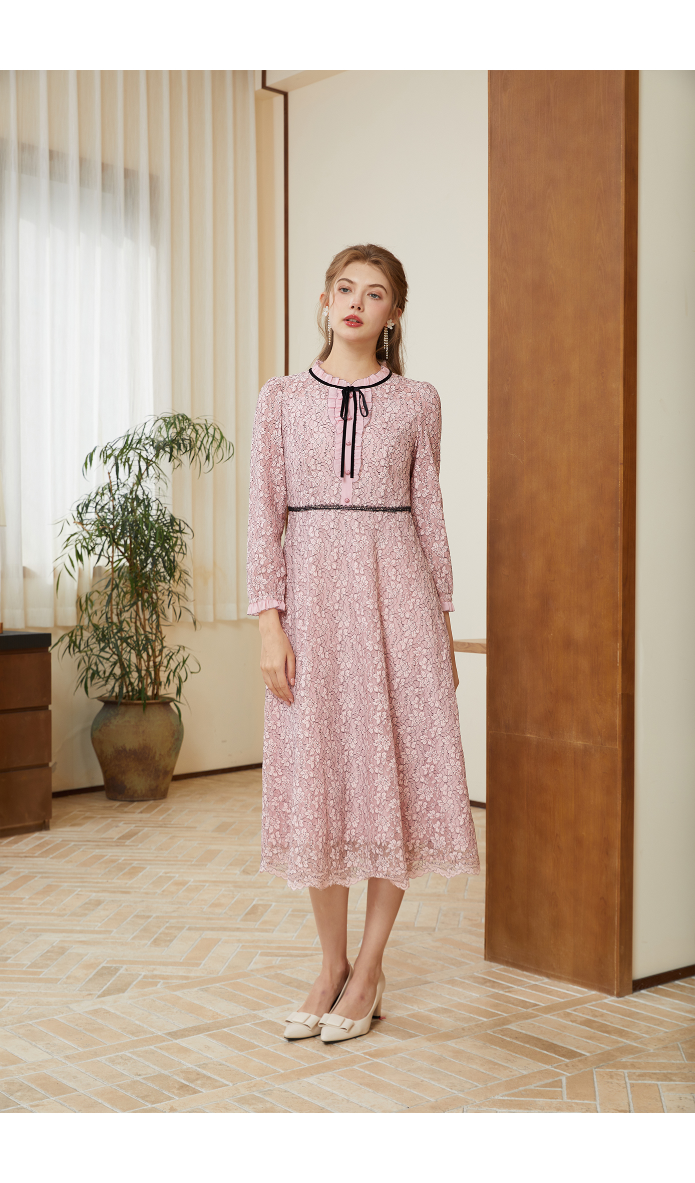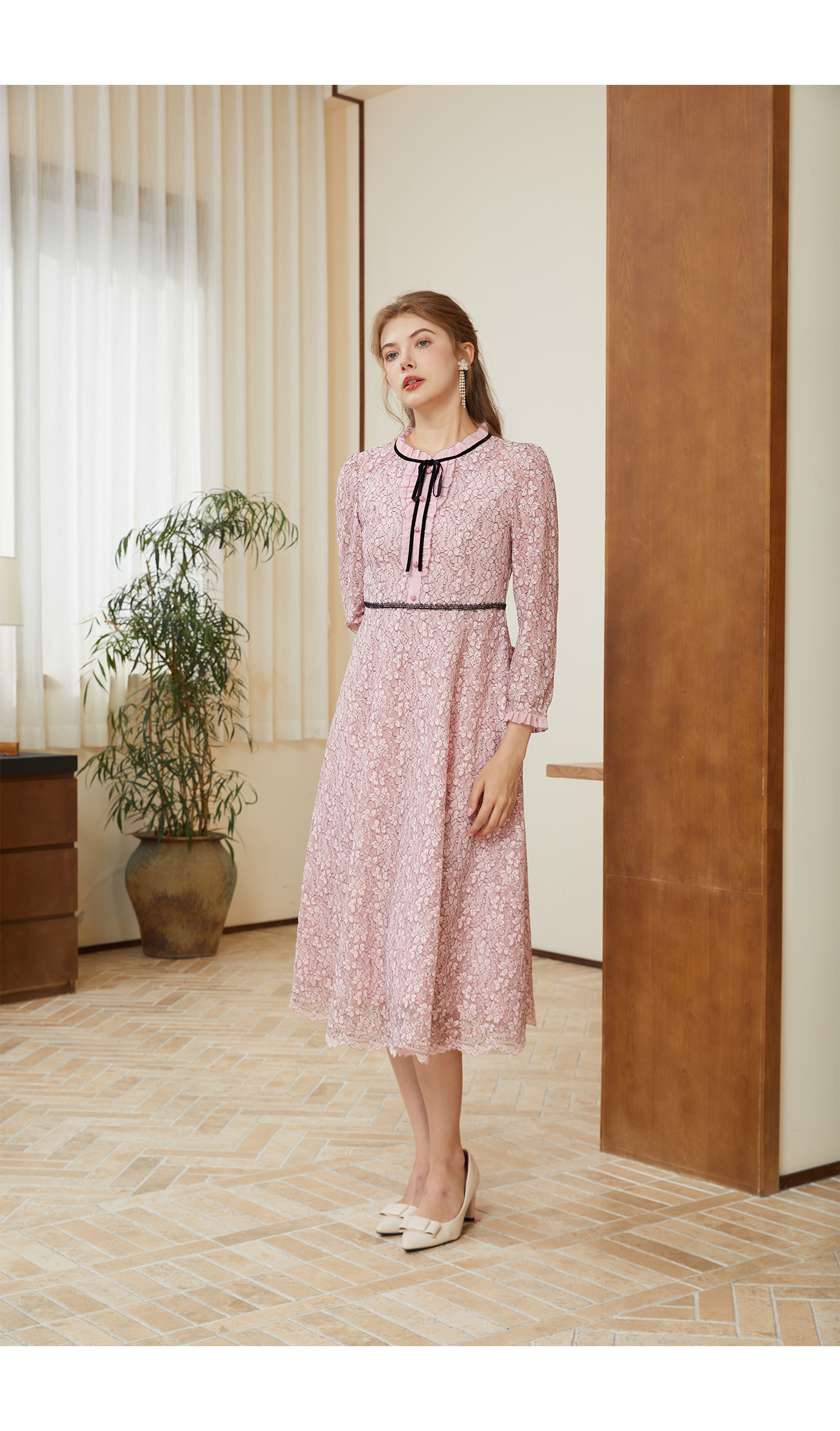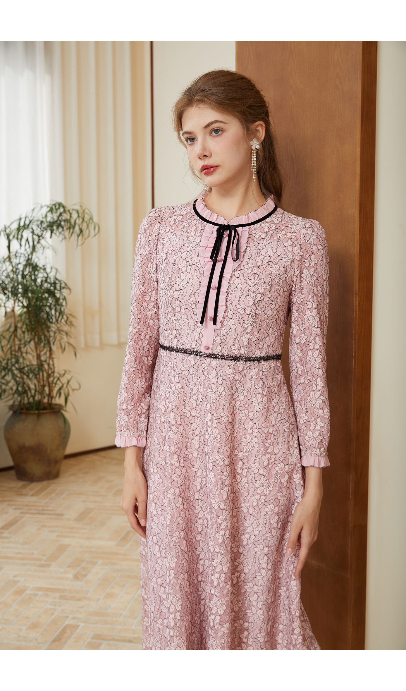 司歌蕾丝双色长袖仙气收腰连衣裙A901139X
