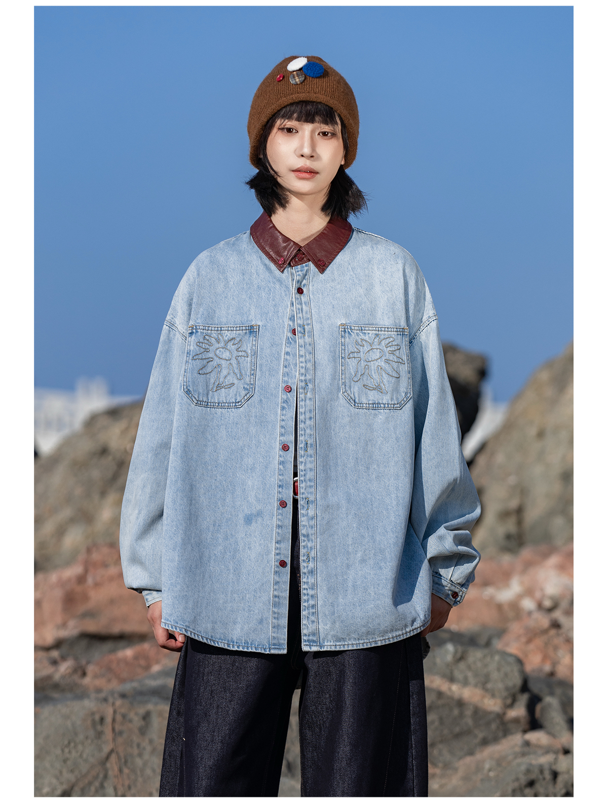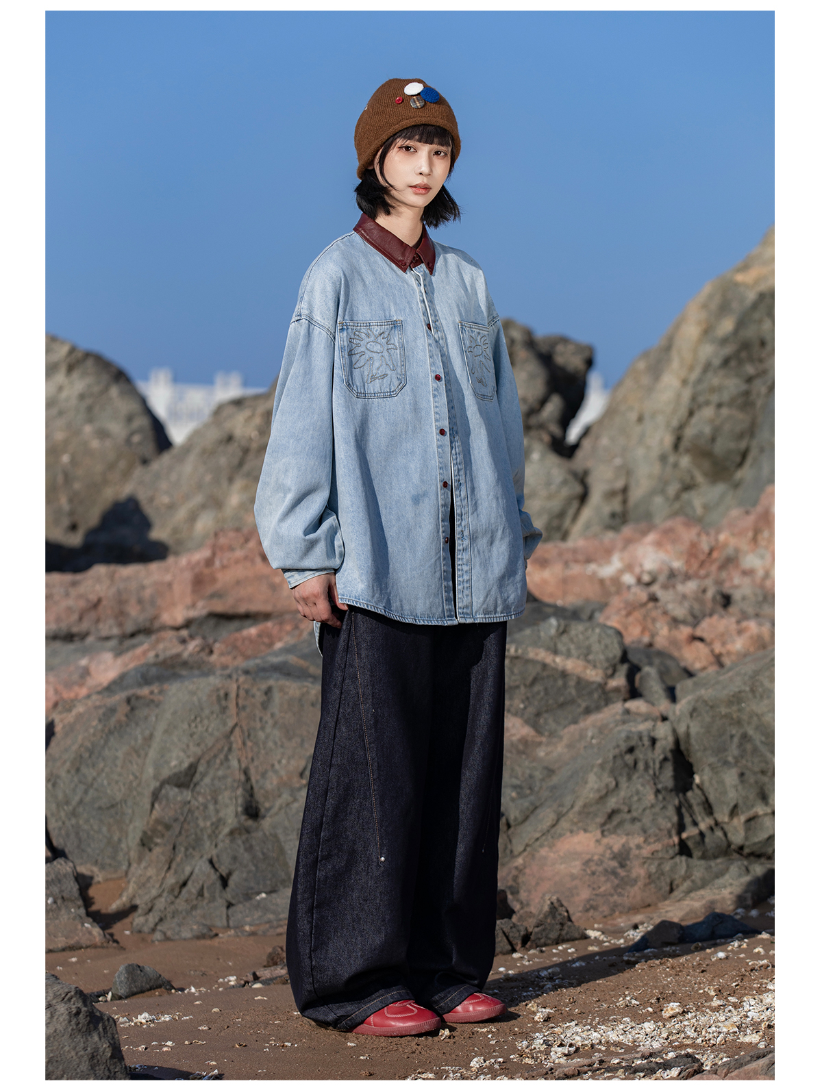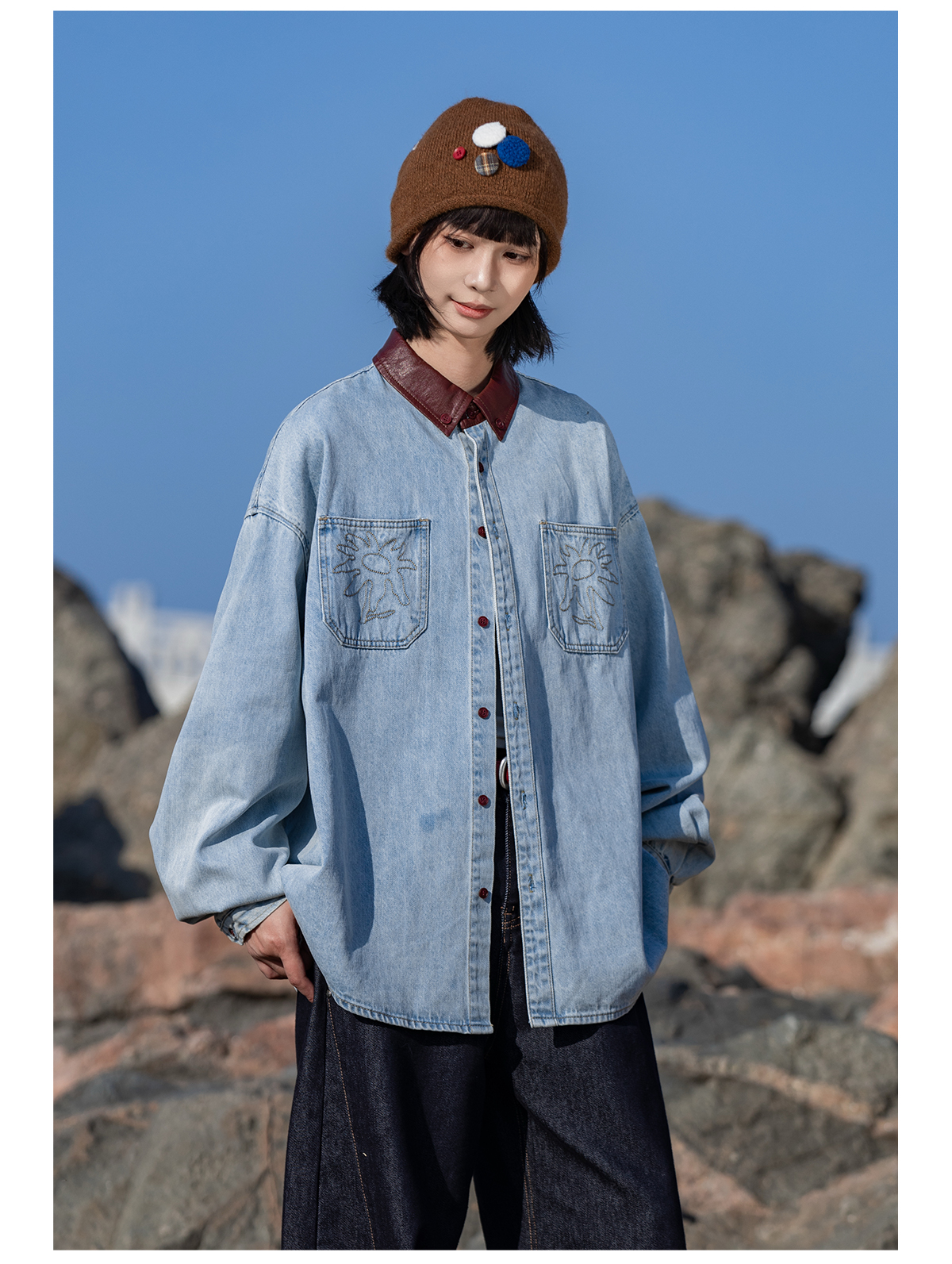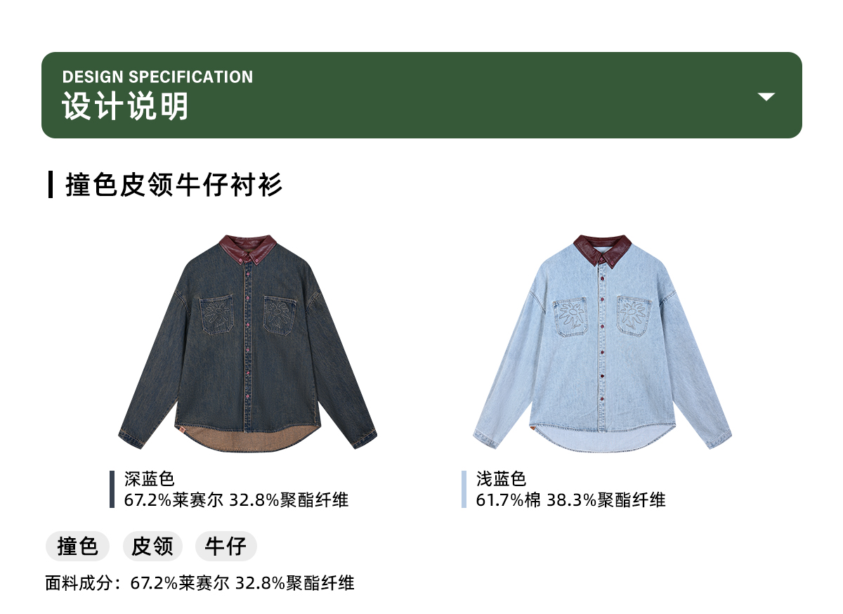 早乙女惠子saotome/STMCS252280/撞色皮领牛仔衬衫
