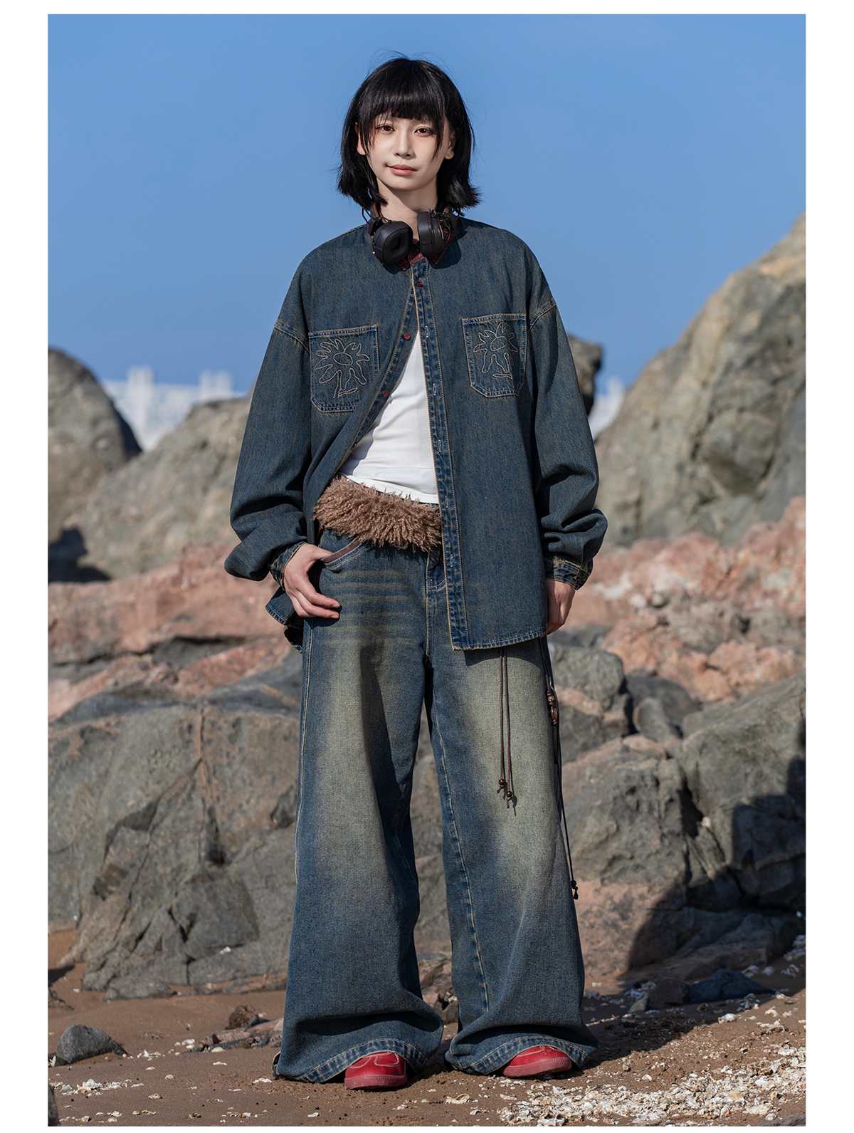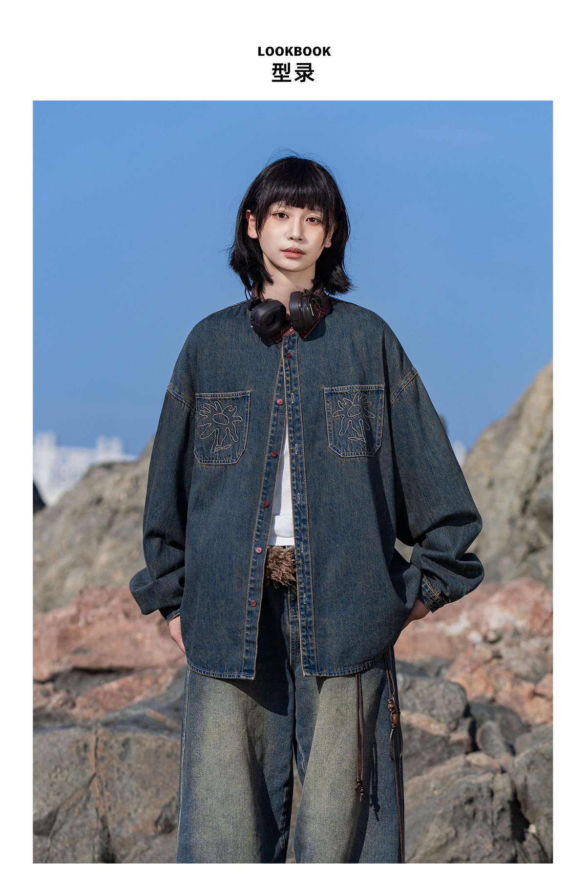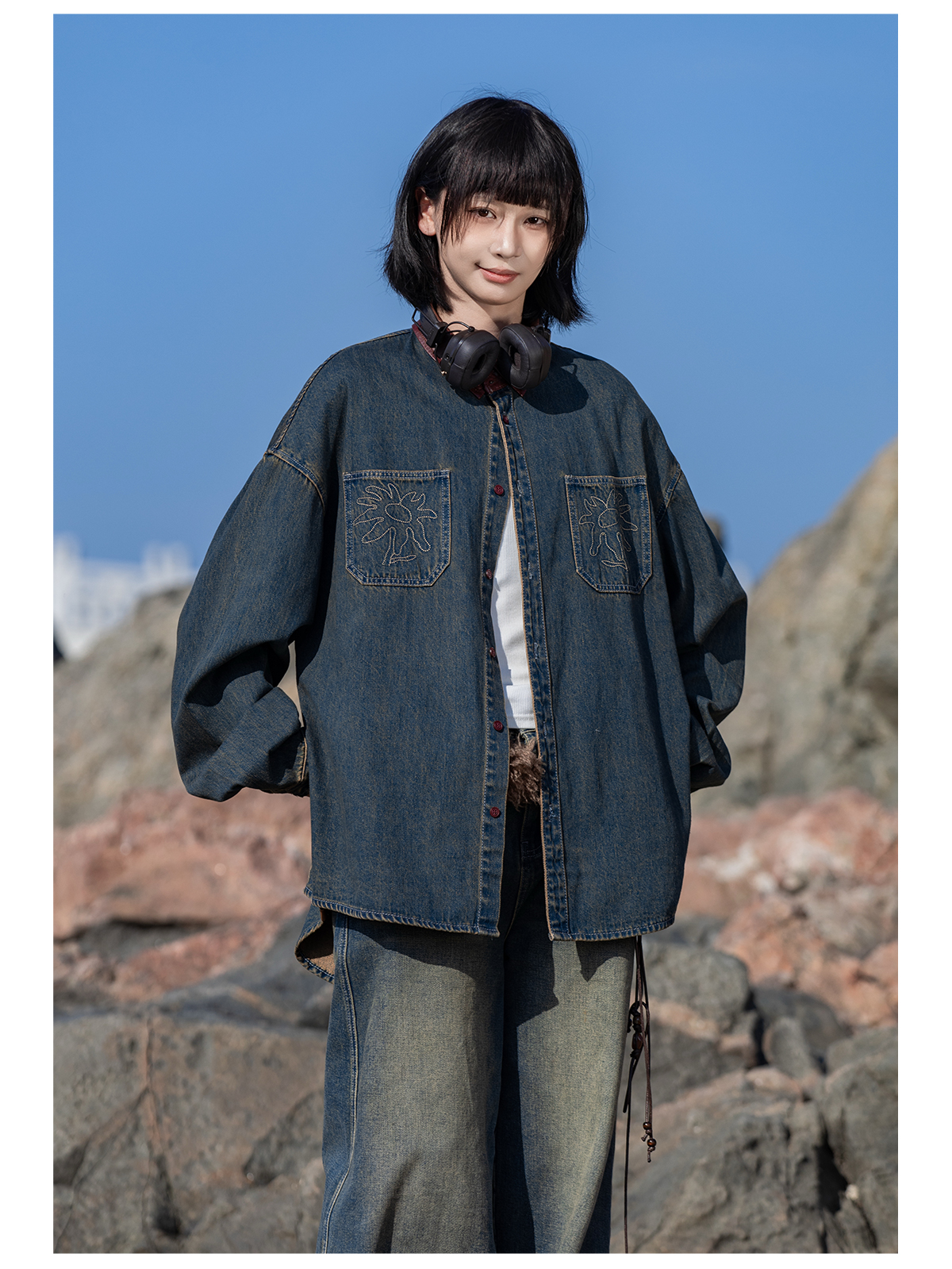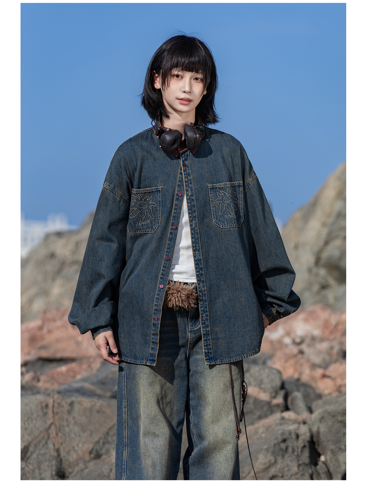 早乙女惠子saotome/STMCS252280/撞色皮领牛仔衬衫