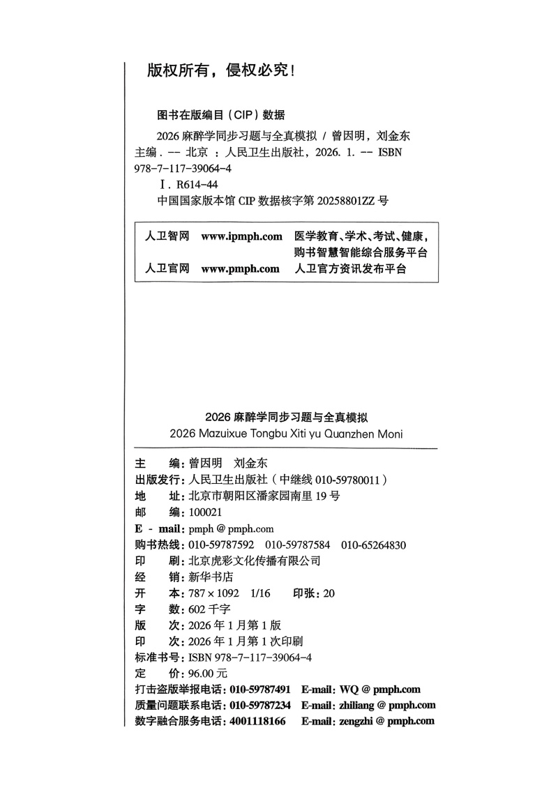 书名:2026麻醉学同步习题与全真模拟