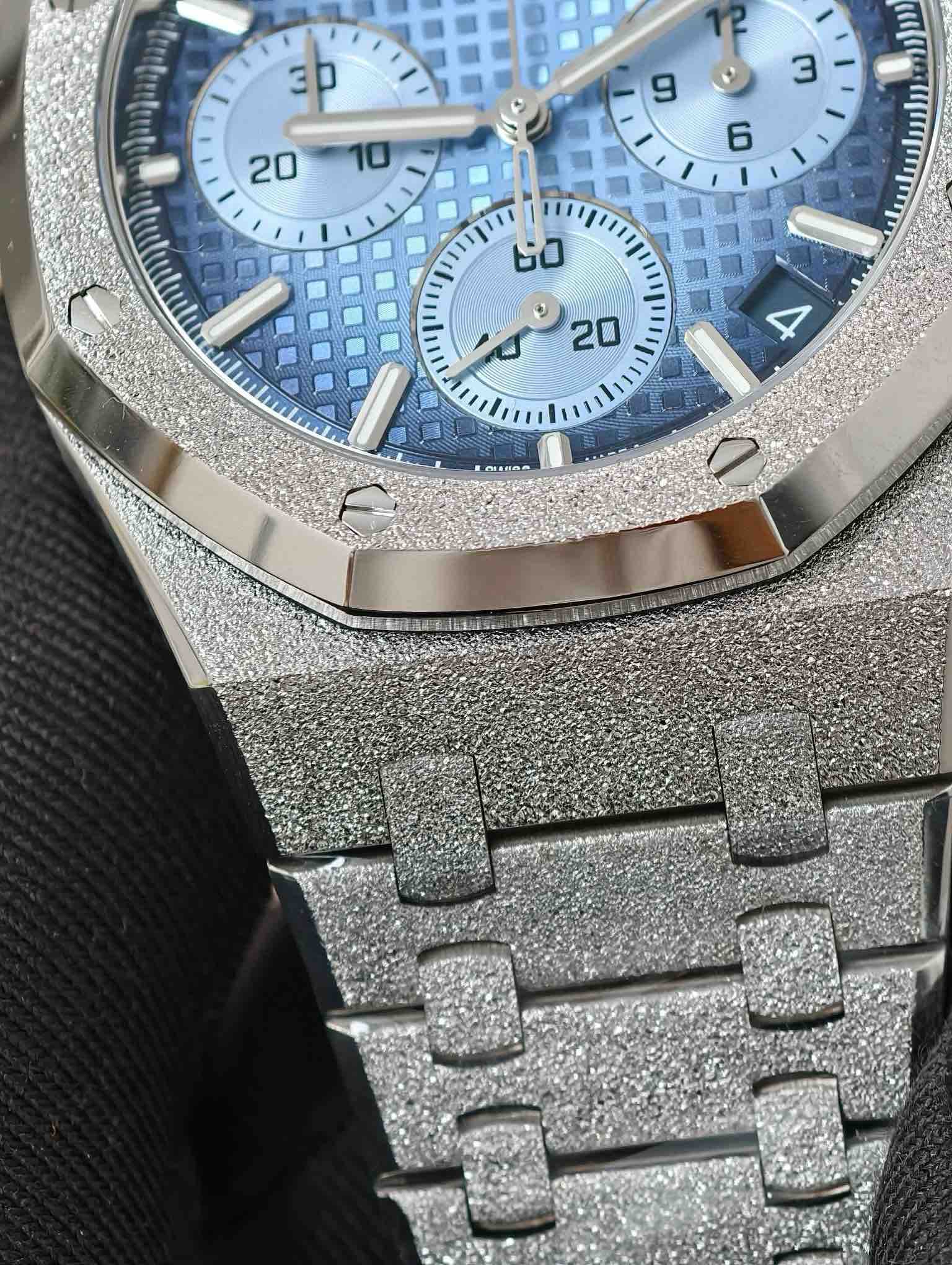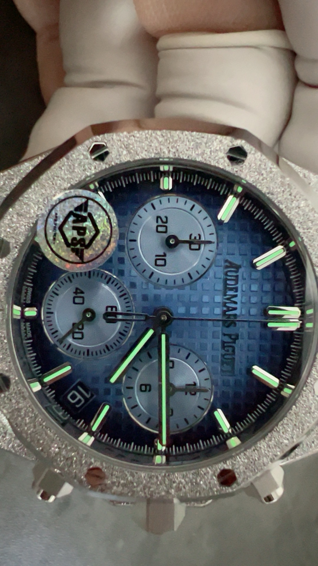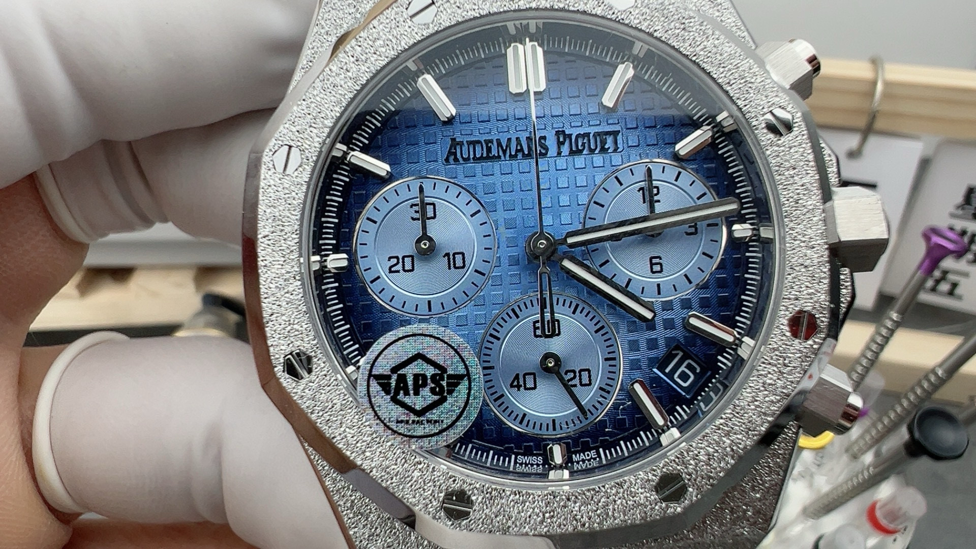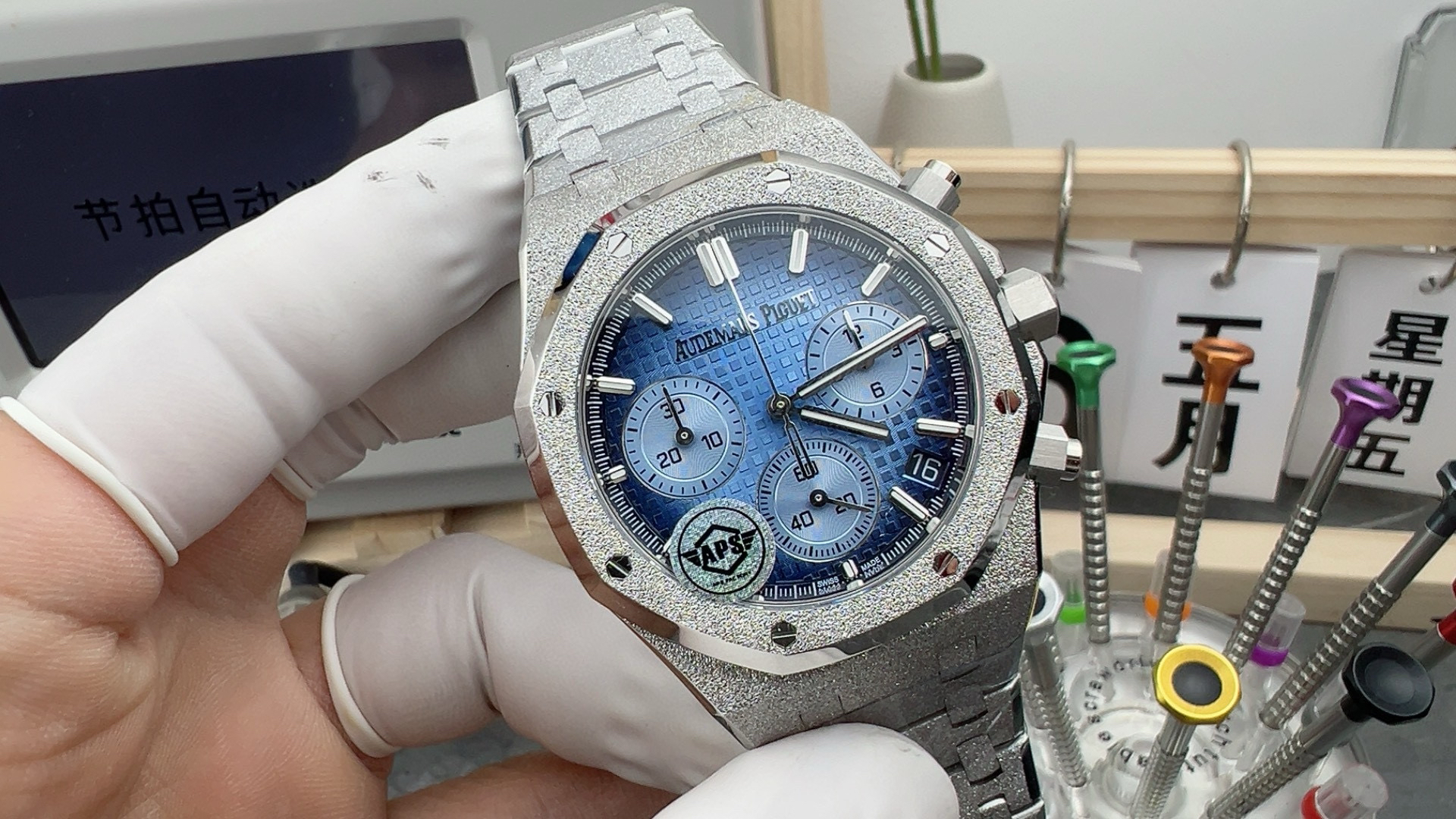 APS皇家橡树26240,霜金款渐变蓝,搭载4401飞返一体机,刻字机芯,顶级工艺,至于正品original原版开模的super copy版本 做工精良 打磨精细 每一个细节处都尽显匠心精神❕❕❕APS Royal Oak 26240, Frost Gold Gradient Blue, equipped with 4401 Flyback integrated machine, engraved movement, top-notch craftsmanship. As for the super copy version of the original original mold, the workmanship is exquisite and finely polished, showing the spirit of craftsmanship in every detail ❕❕❕