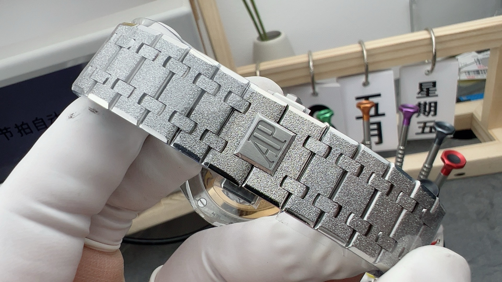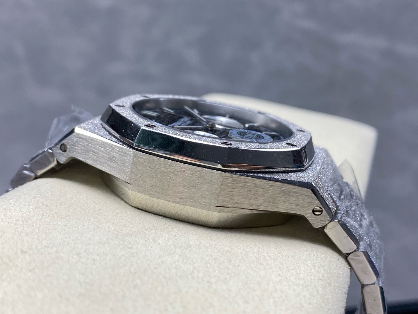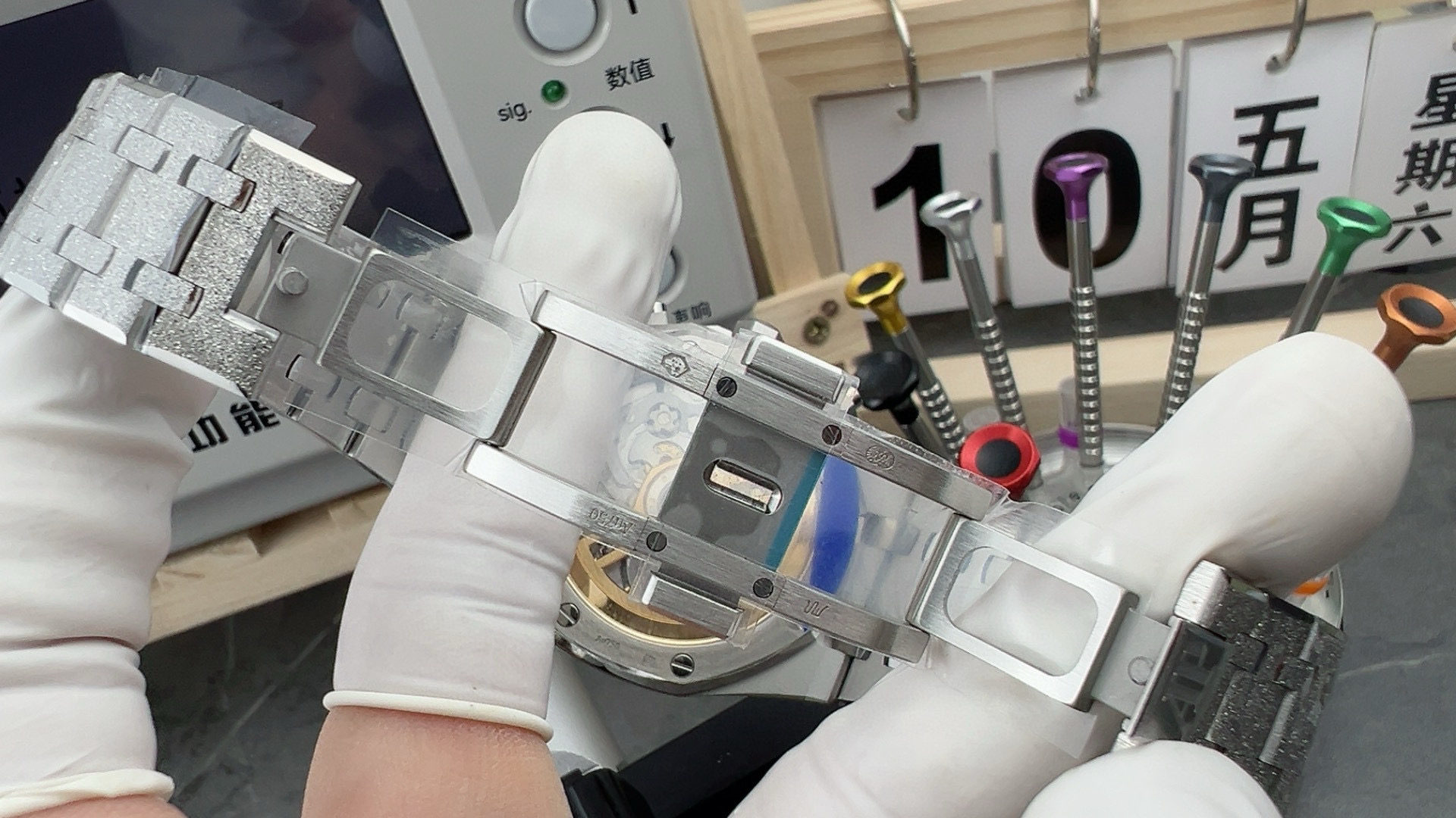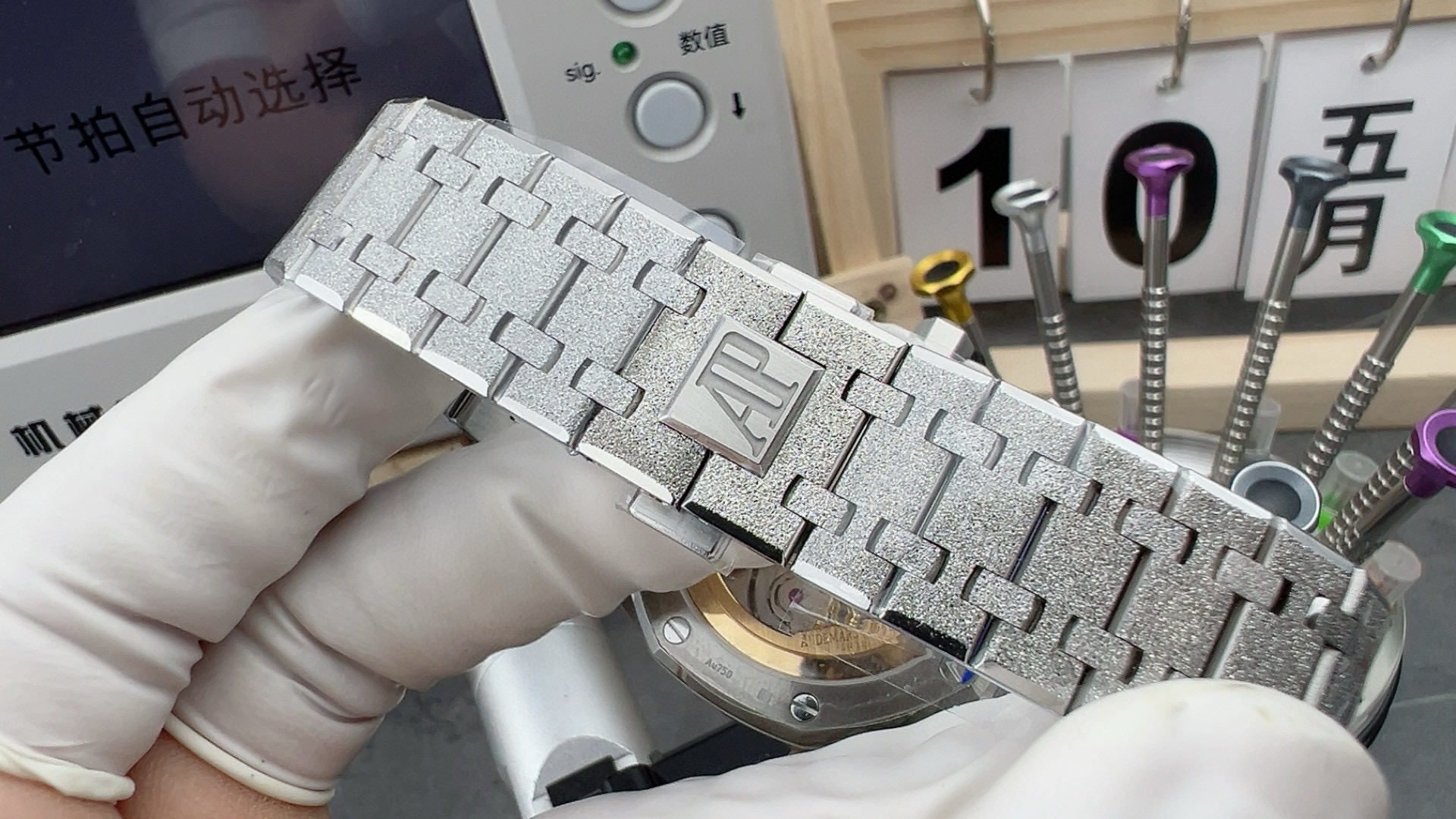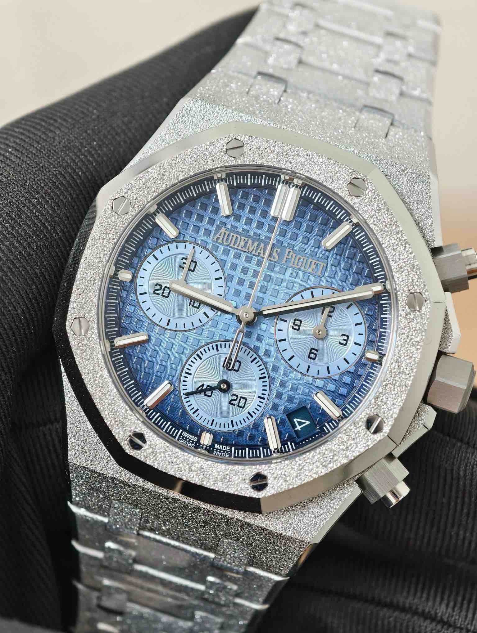 APS皇家橡树26240,霜金款渐变蓝,搭载4401飞返一体机,刻字机芯,顶级工艺,至于正品original原版开模的super copy版本 做工精良 打磨精细 每一个细节处都尽显匠心精神❕❕❕APS Royal Oak 26240, Frost Gold Gradient Blue, equipped with 4401 Flyback integrated machine, engraved movement, top-notch craftsmanship. As for the super copy version of the original original mold, the workmanship is exquisite and finely polished, showing the spirit of craftsmanship in every detail ❕❕❕