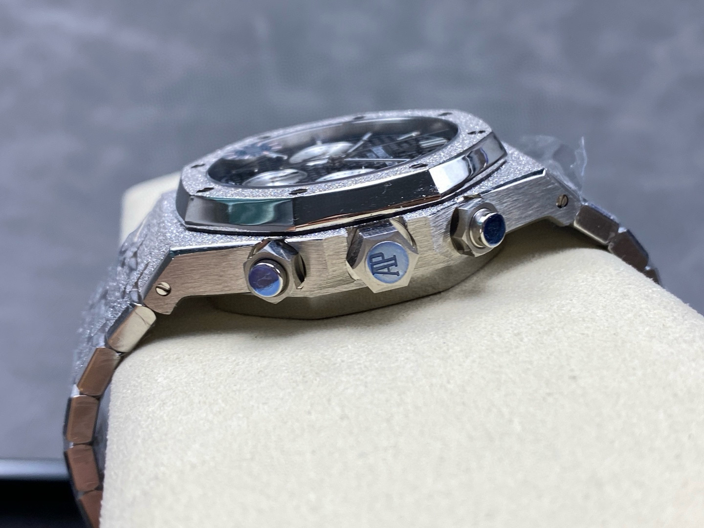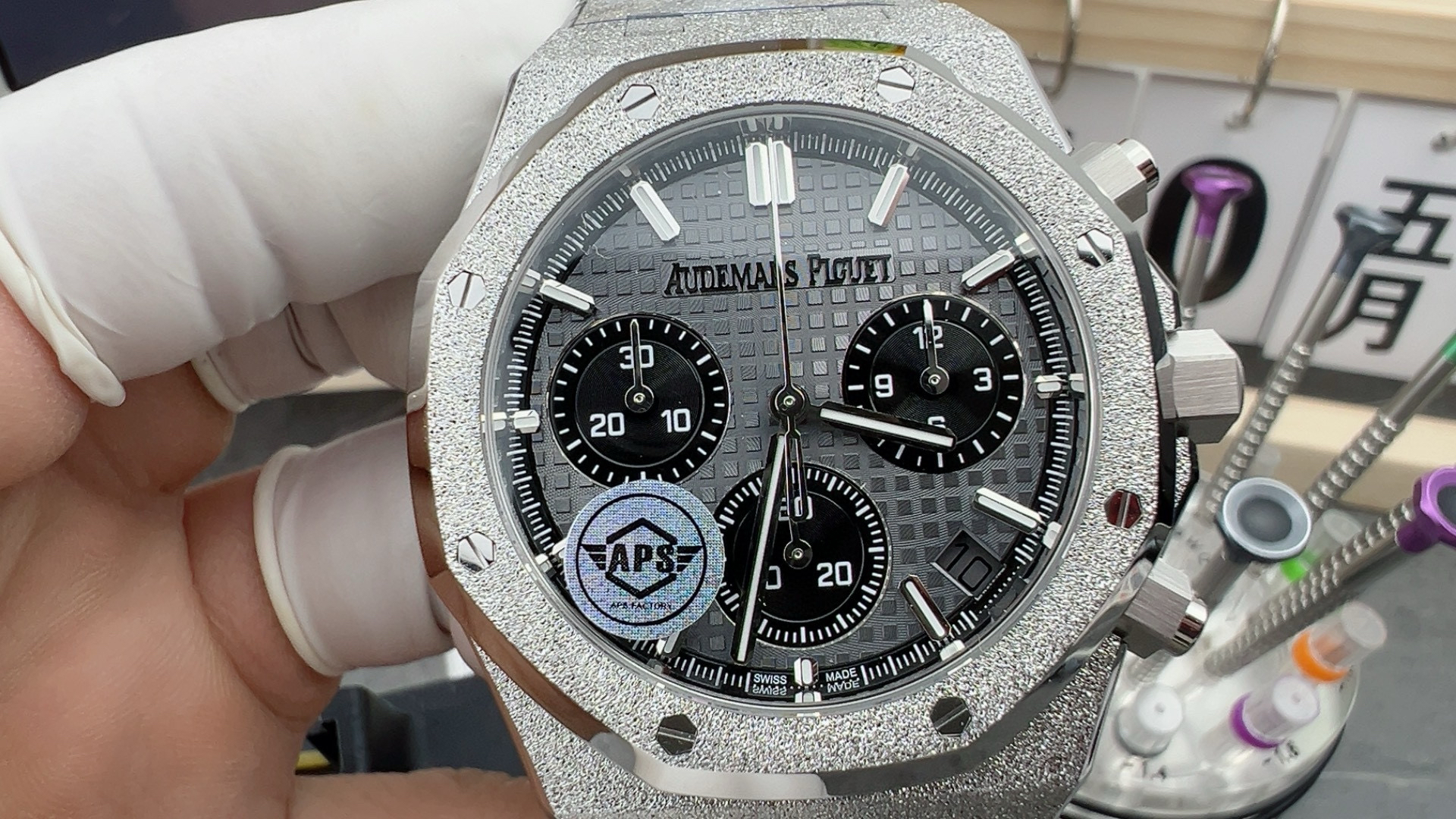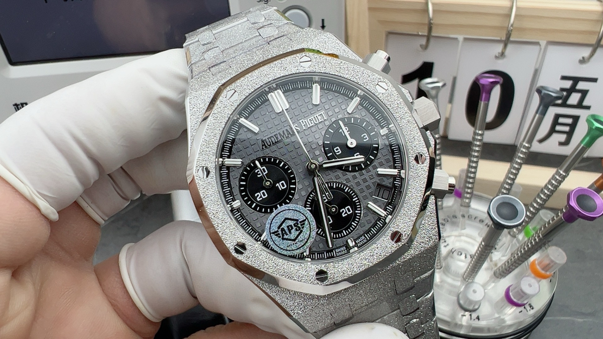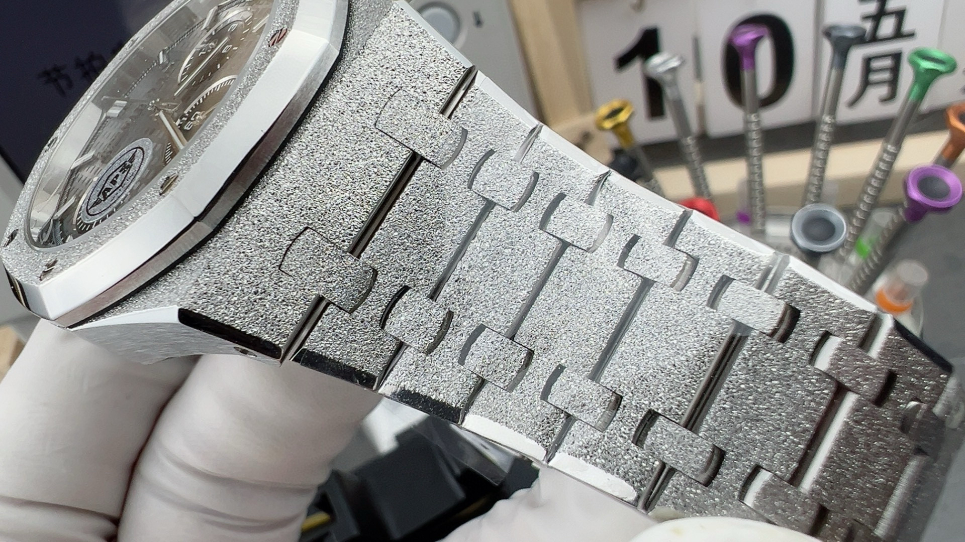 APS皇家橡树26240,霜金款渐变蓝,搭载4401飞返一体机,刻字机芯,顶级工艺,至于正品original原版开模的super copy版本 做工精良 打磨精细 每一个细节处都尽显匠心精神❕❕❕APS Royal Oak 26240, Frost Gold Gradient Blue, equipped with 4401 Flyback integrated machine, engraved movement, top-notch craftsmanship. As for the super copy version of the original original mold, the workmanship is exquisite and finely polished, showing the spirit of craftsmanship in every detail ❕❕❕