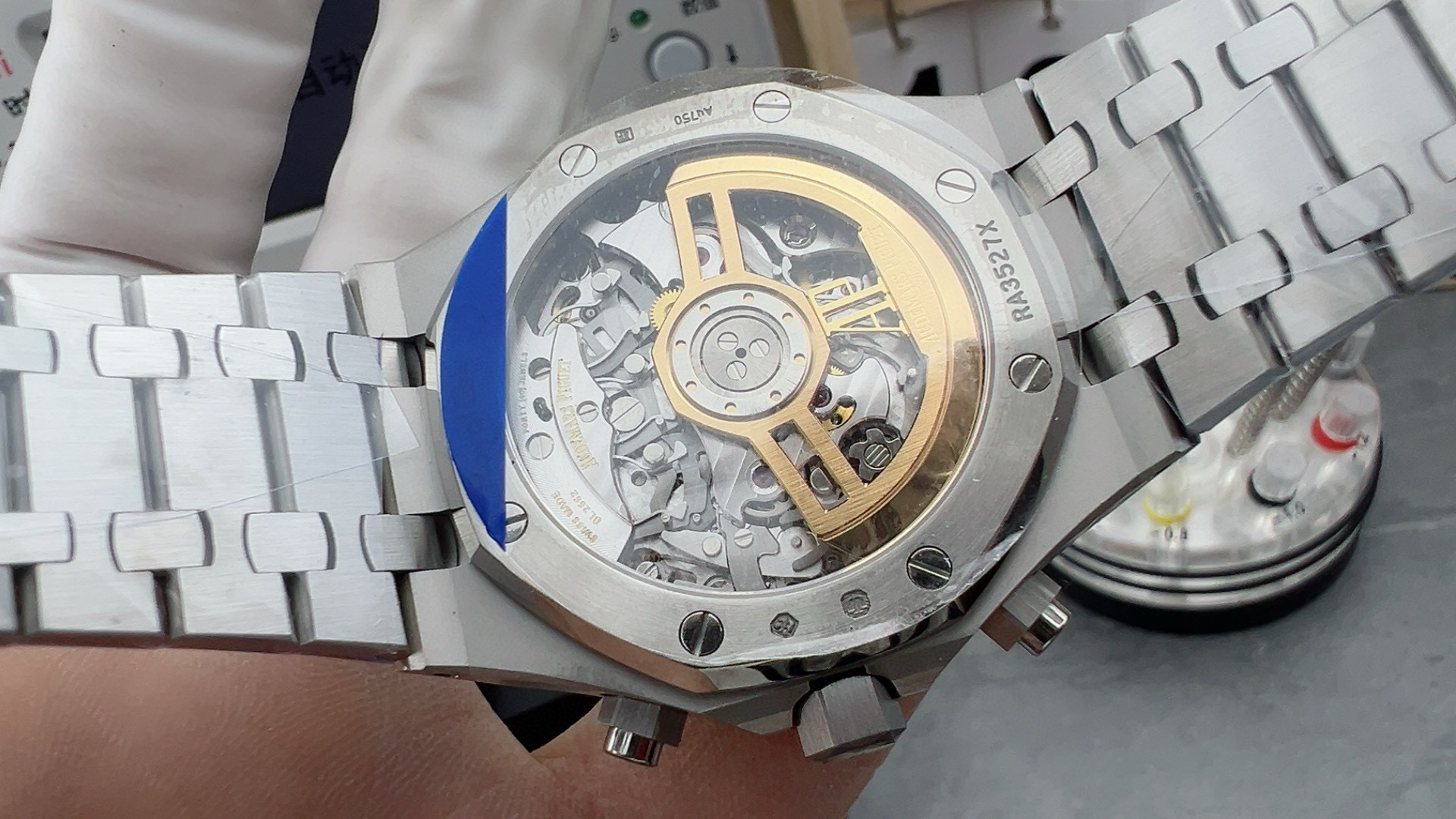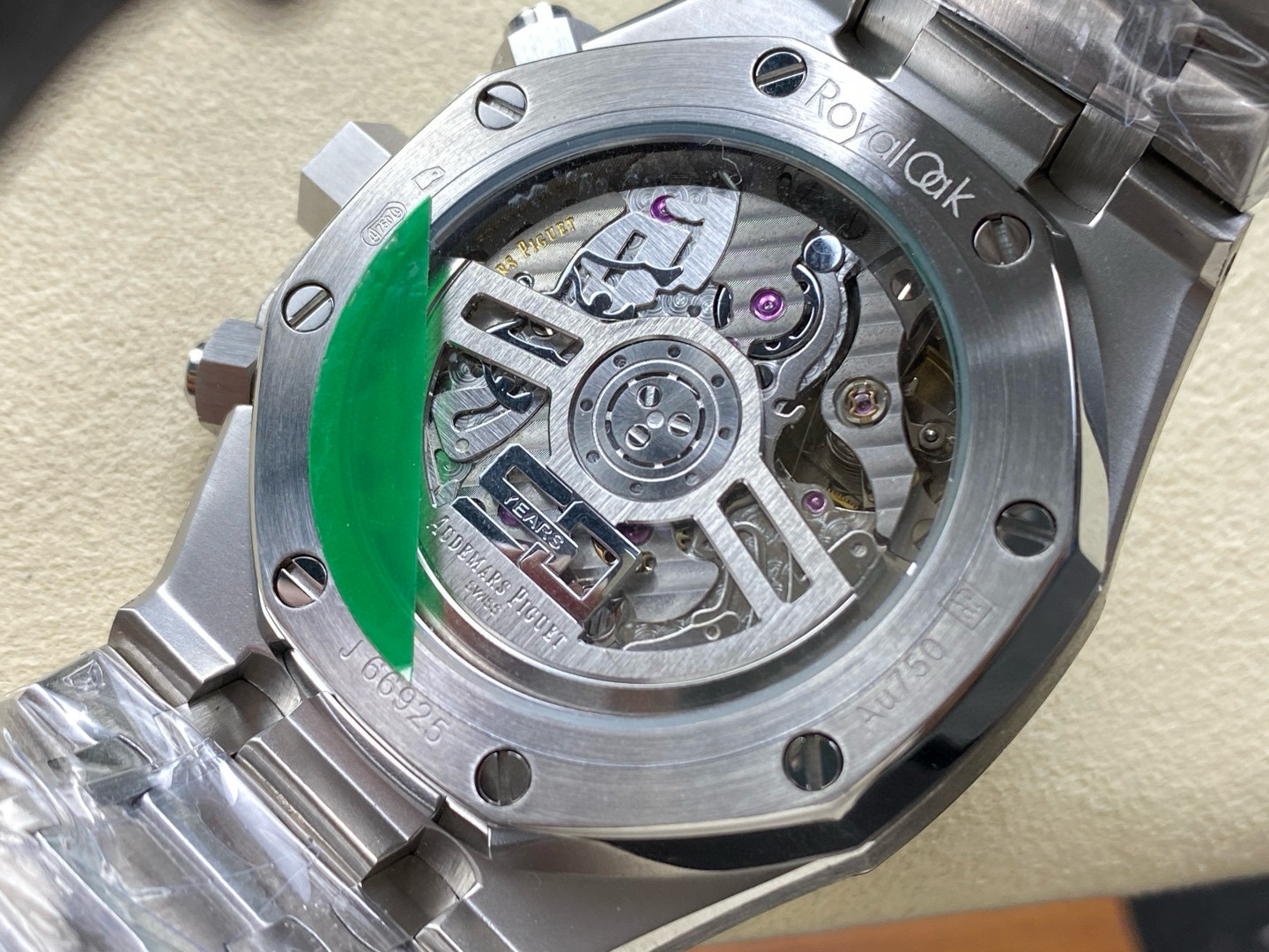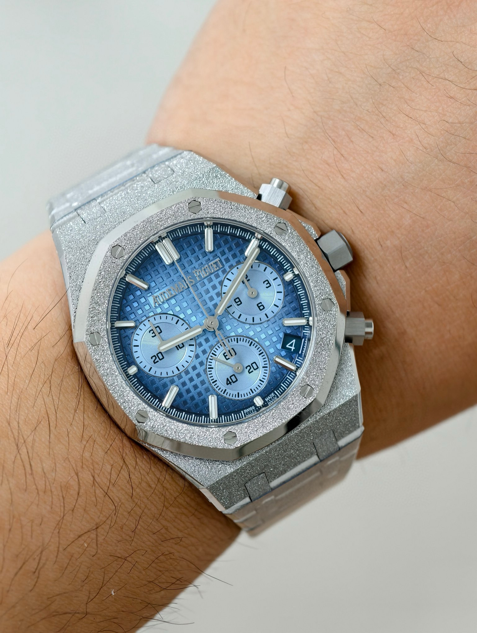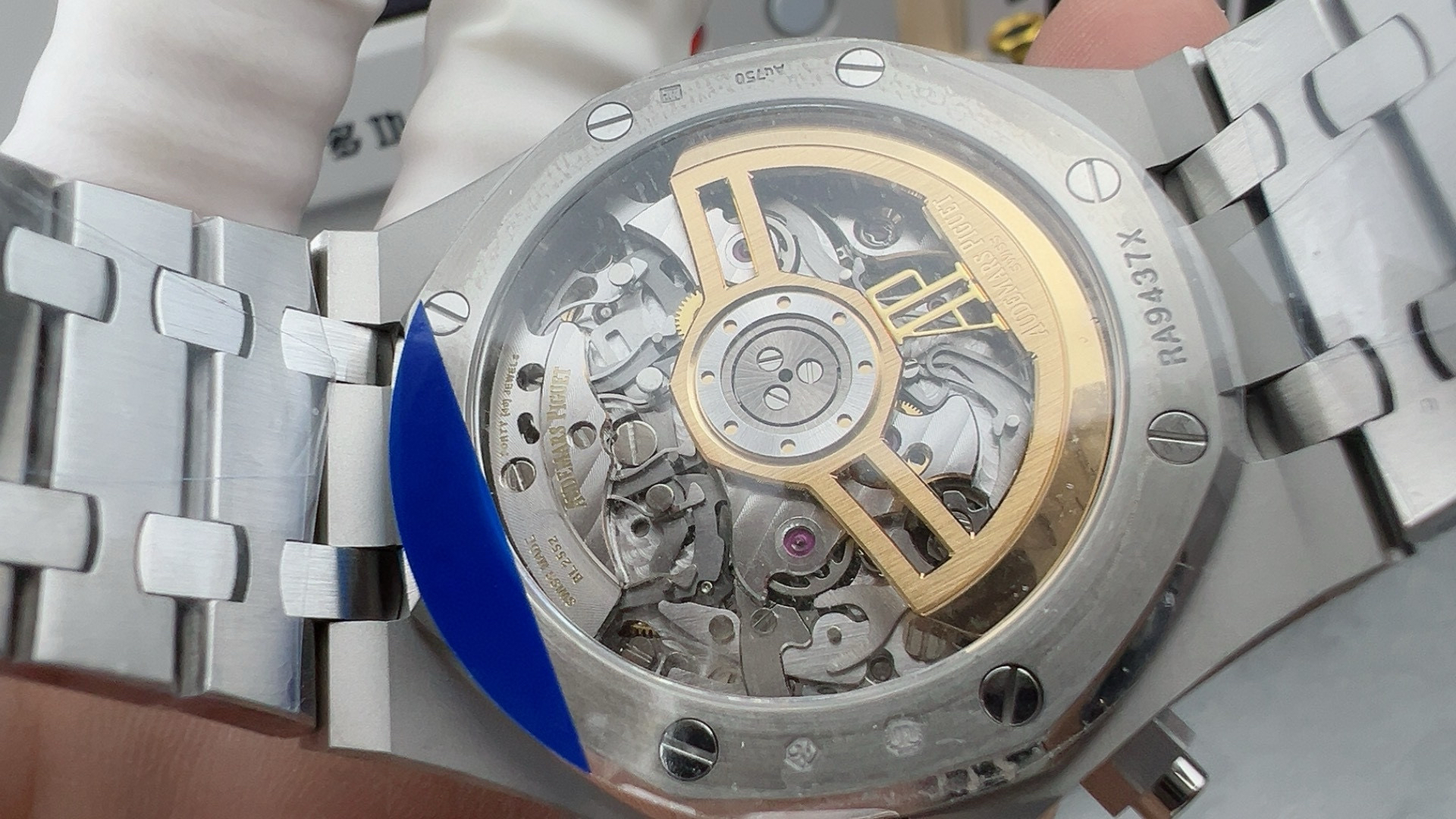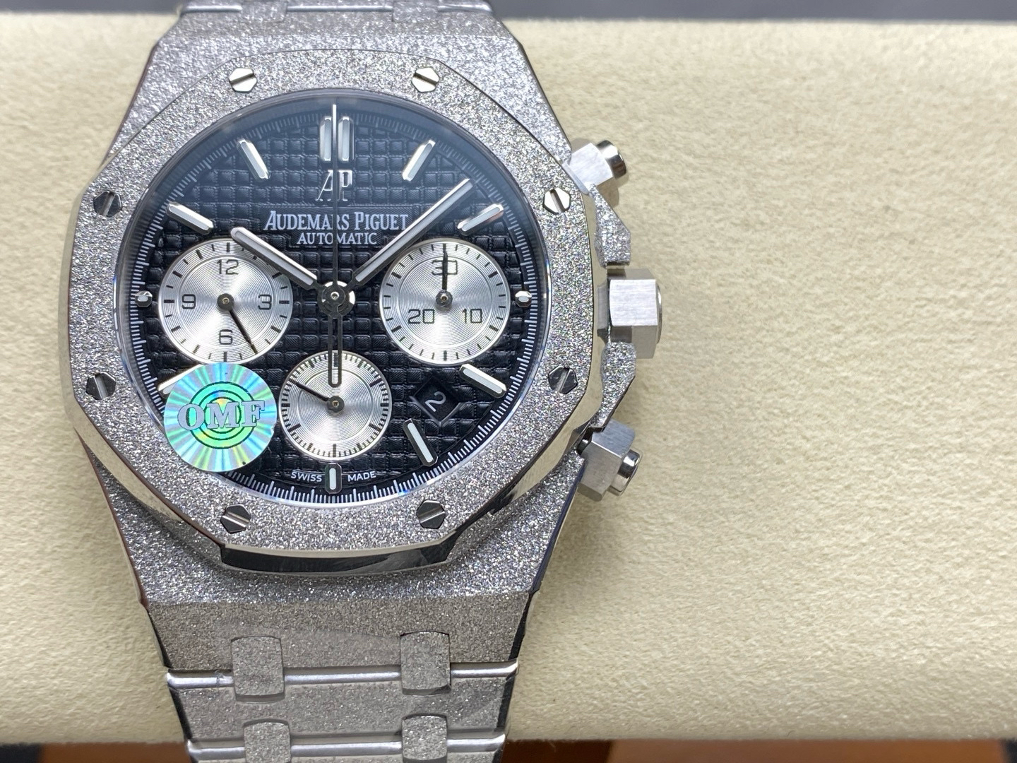 APS皇家橡树26240,霜金款渐变蓝,搭载4401飞返一体机,刻字机芯,顶级工艺,至于正品original原版开模的super copy版本 做工精良 打磨精细 每一个细节处都尽显匠心精神❕❕❕APS Royal Oak 26240, Frost Gold Gradient Blue, equipped with 4401 Flyback integrated machine, engraved movement, top-notch craftsmanship. As for the super copy version of the original original mold, the workmanship is exquisite and finely polished, showing the spirit of craftsmanship in every detail ❕❕❕