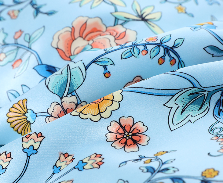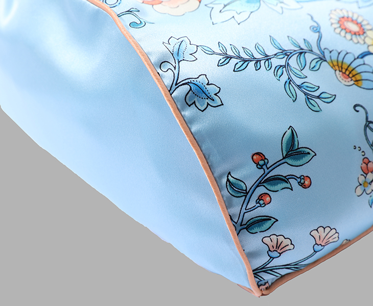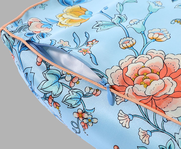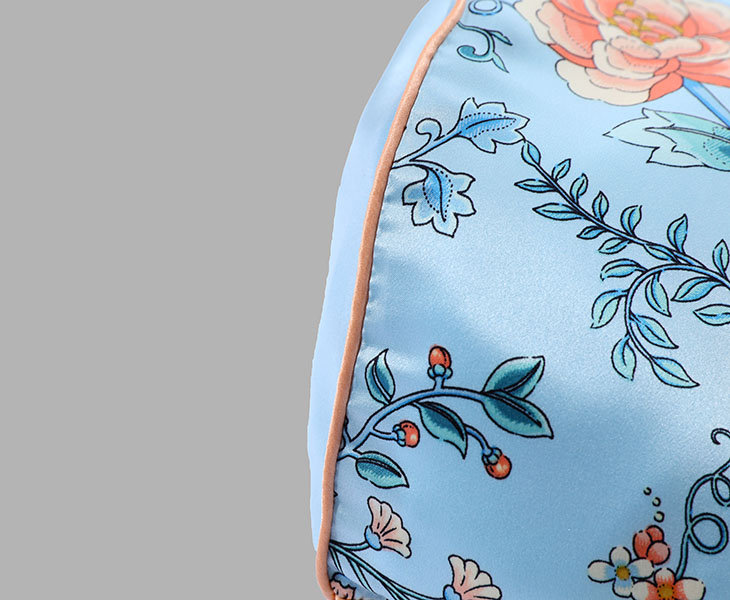 采用柔滑轻盈的桑蚕丝面料,搭配繁花似锦印花,整体布局均衡大气,寓意美好。