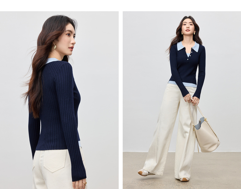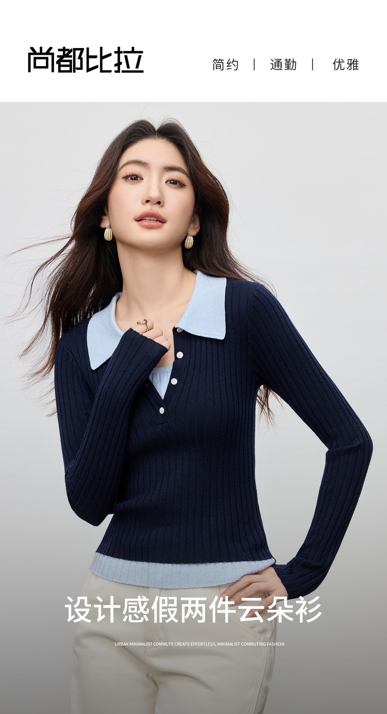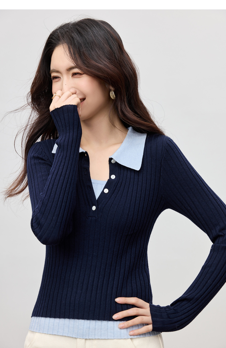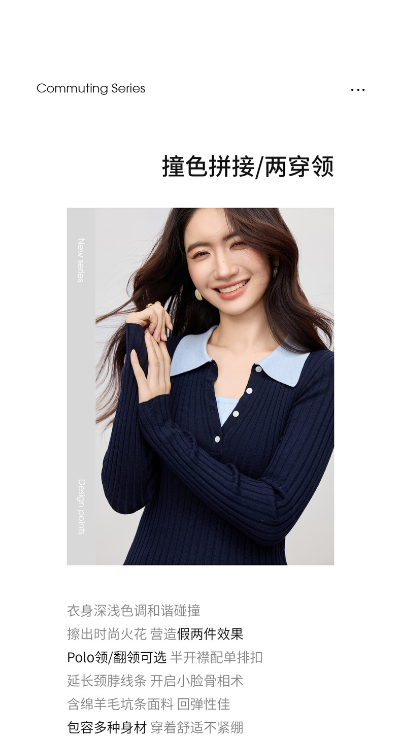 【内购】【假两件云朵衫】含绵羊毛通勤撞色拼接polo领/翻领半开襟针织衫-W53HJ3422