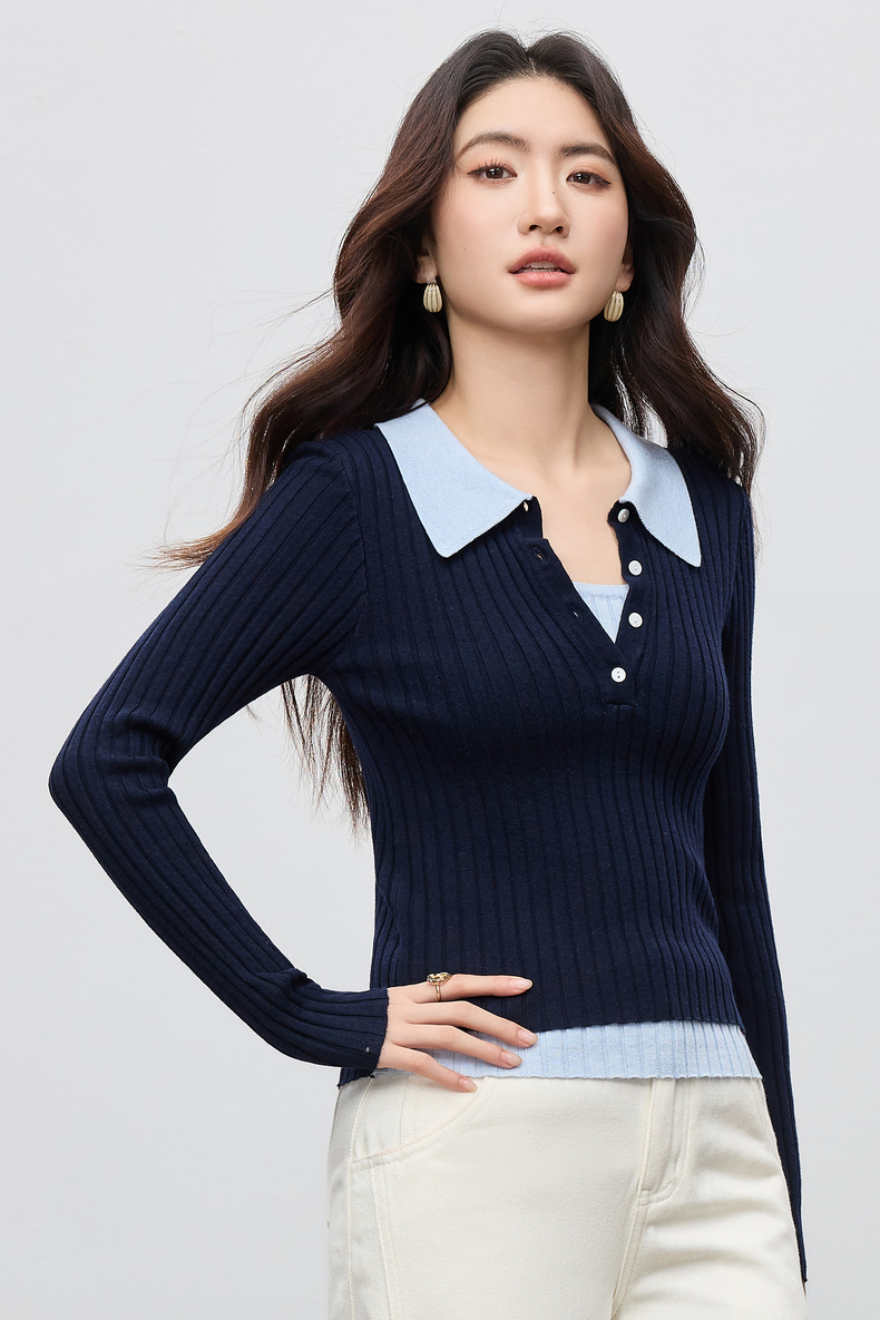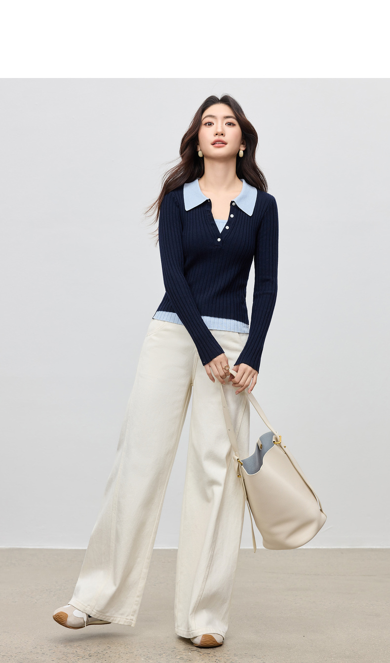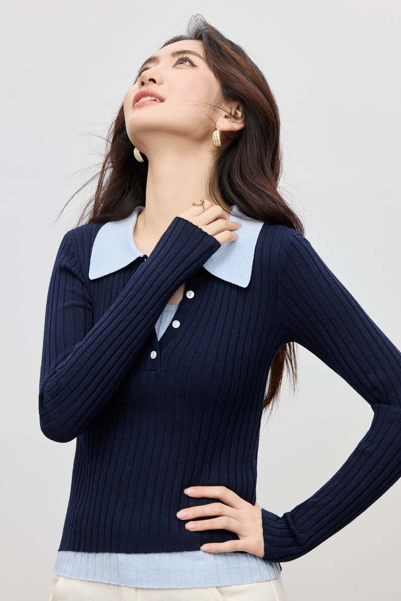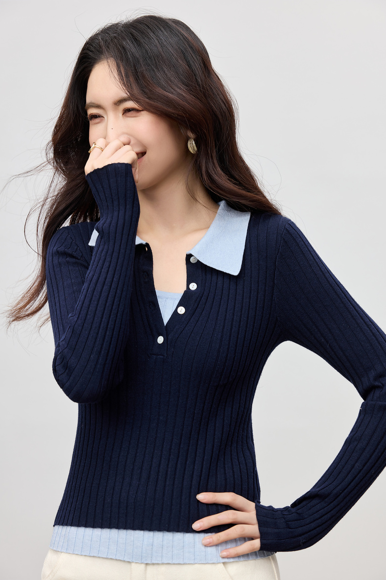 【内购】【假两件云朵衫】含绵羊毛通勤撞色拼接polo领/翻领半开襟针织衫-W53HJ3422