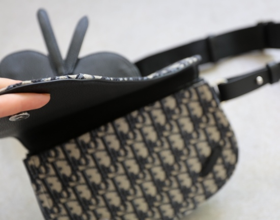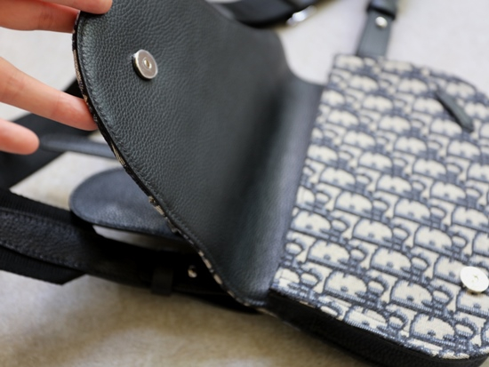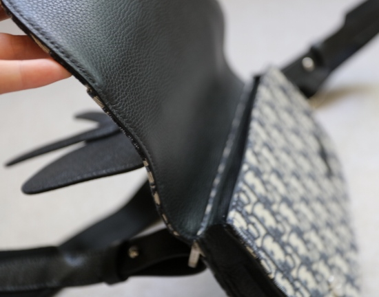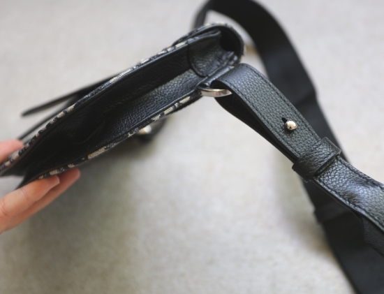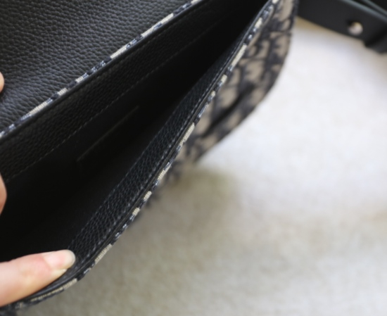 翻盖式包口 一个磁扣闭合 包口是皮条 黑色布衬 内无隔断 无贴袋