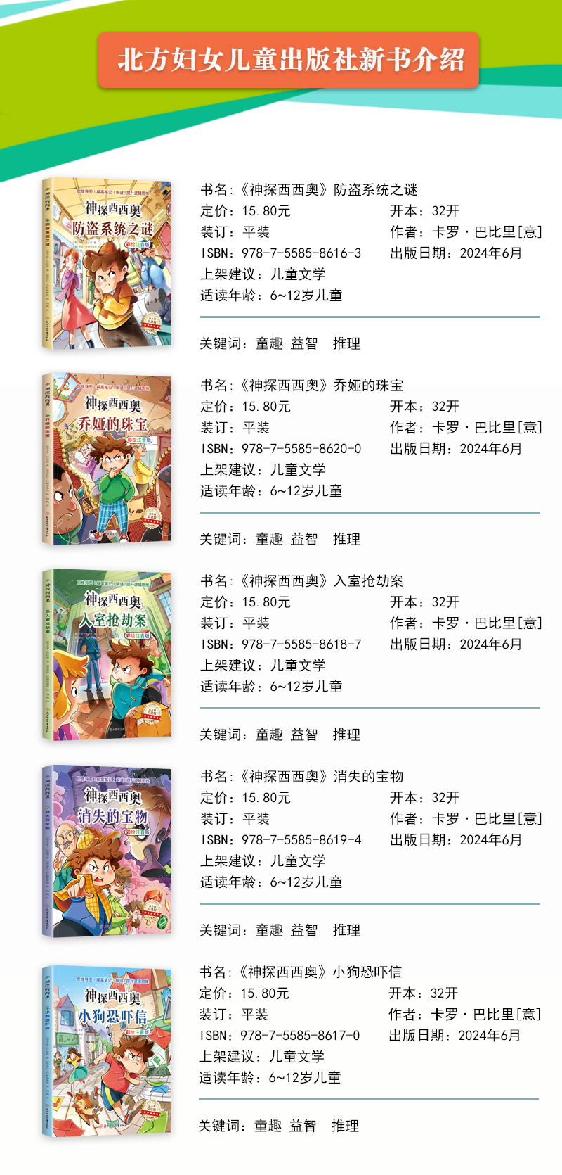 侦探小说不仅可以满足孩子强烈的好奇心和探索欲,从而培养阅读习惯,还能充分激发逻辑思维能力、判断能力,全方位锻炼智力。同时,侦探小说中传达出的“正义战胜邪恶”这一主题,也有利于孩子建立积极正向的价值观,塑造美好品格。本选题由意大利儿童文学实力派作家创作,是经过市场检验、受到读者喜爱的作品。