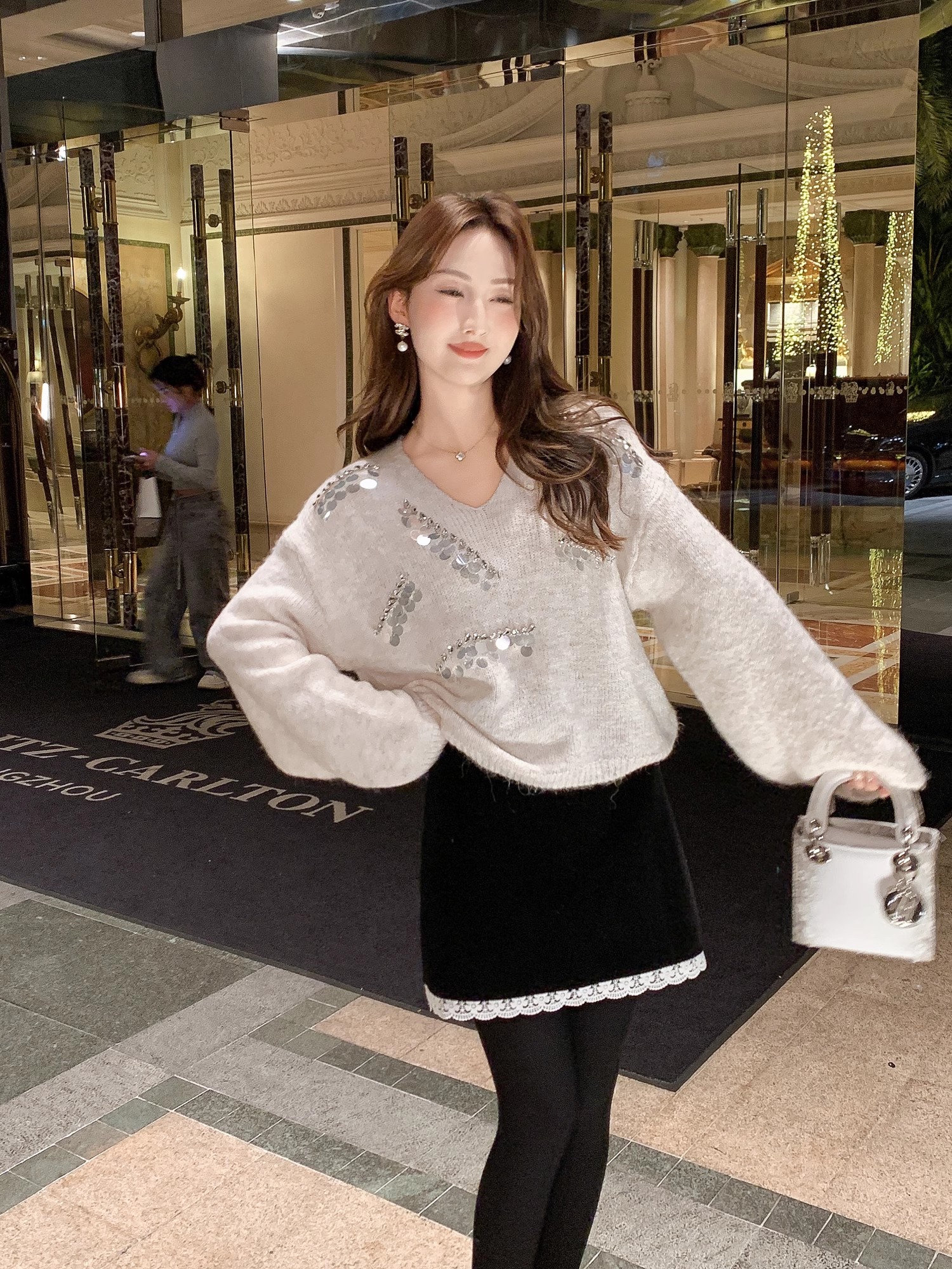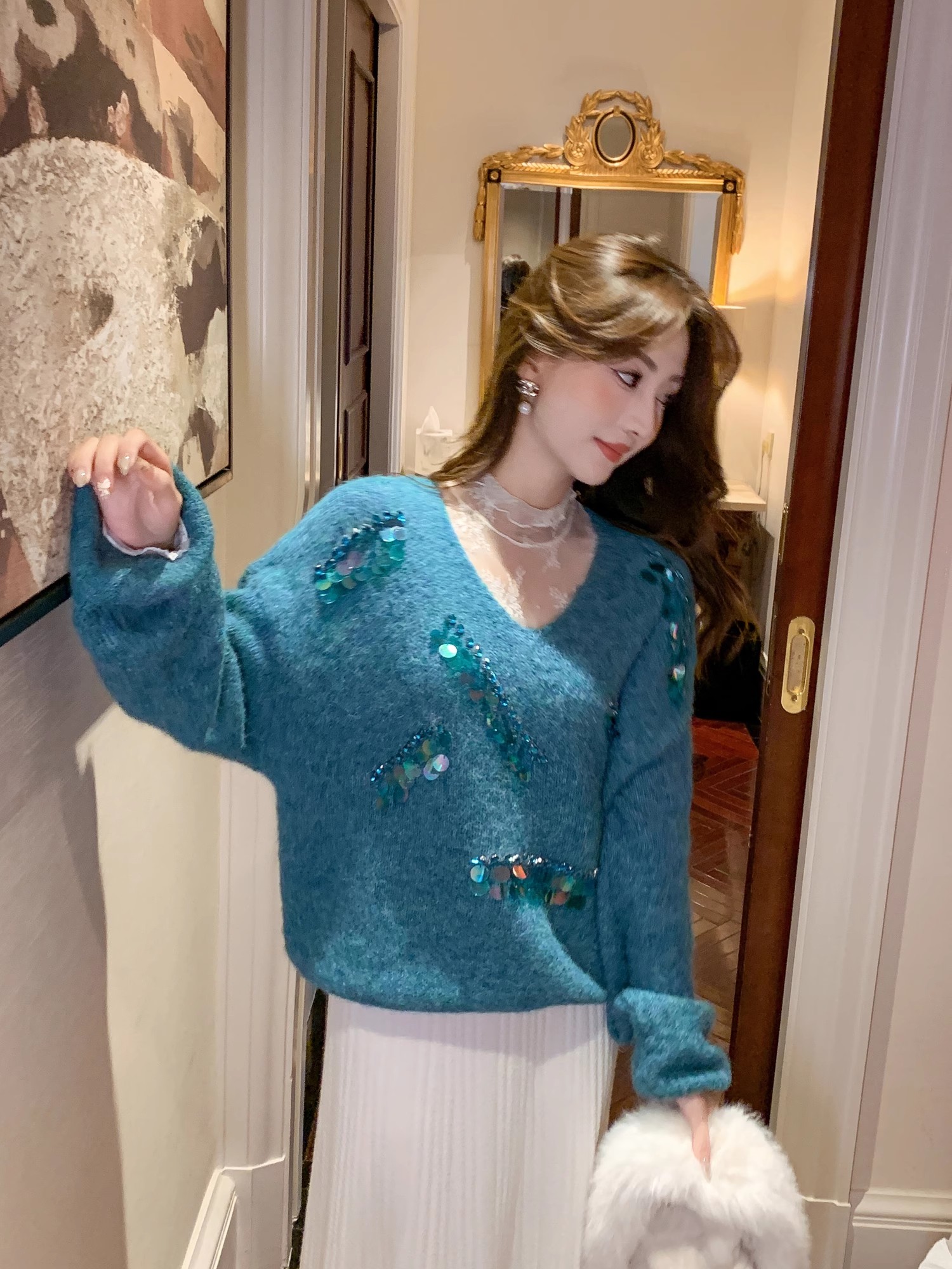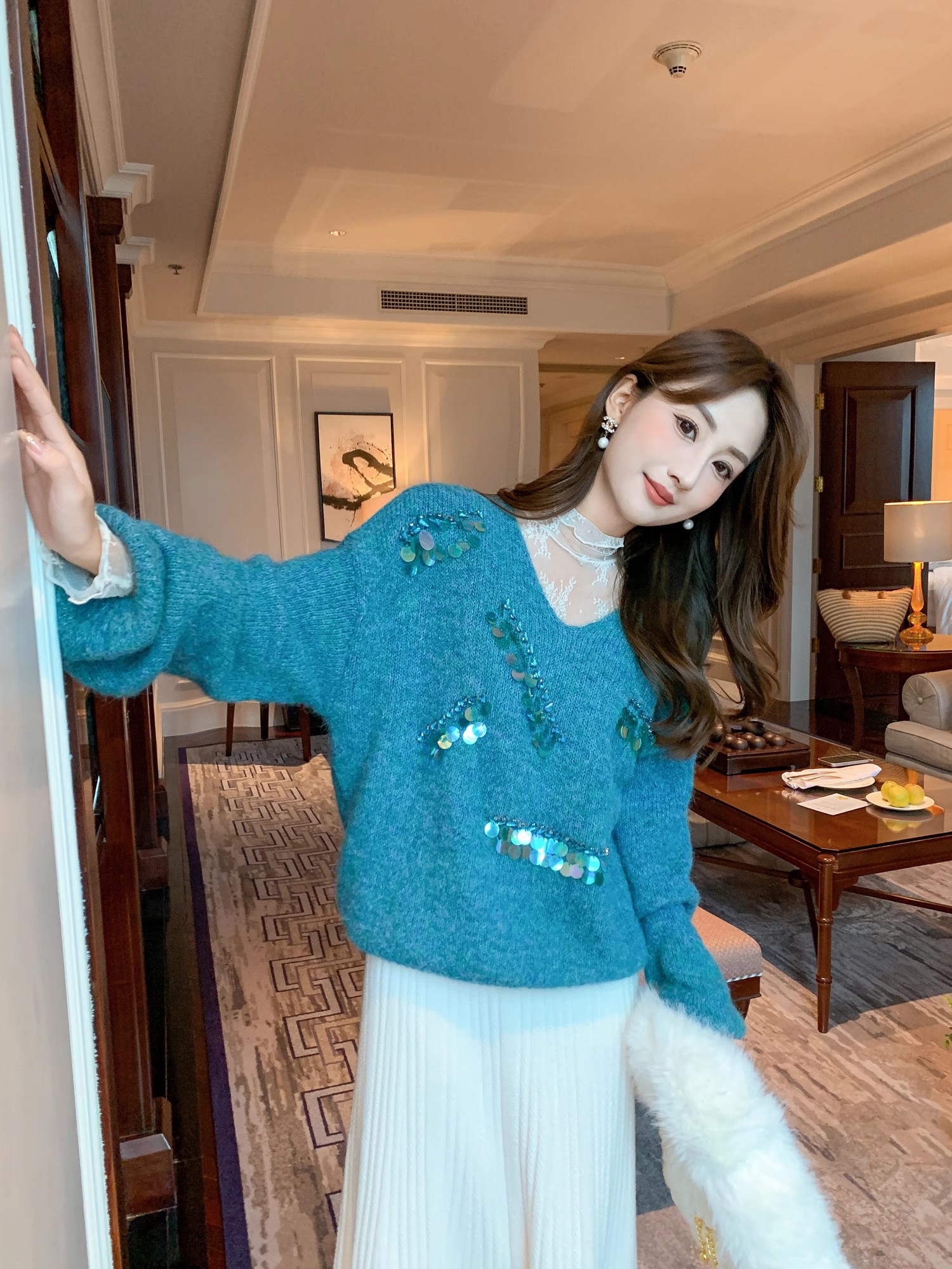 张心子【Lu系法则】重工氛围感亮片套头毛衣女秋冬新款显白上衣仙 U2411011