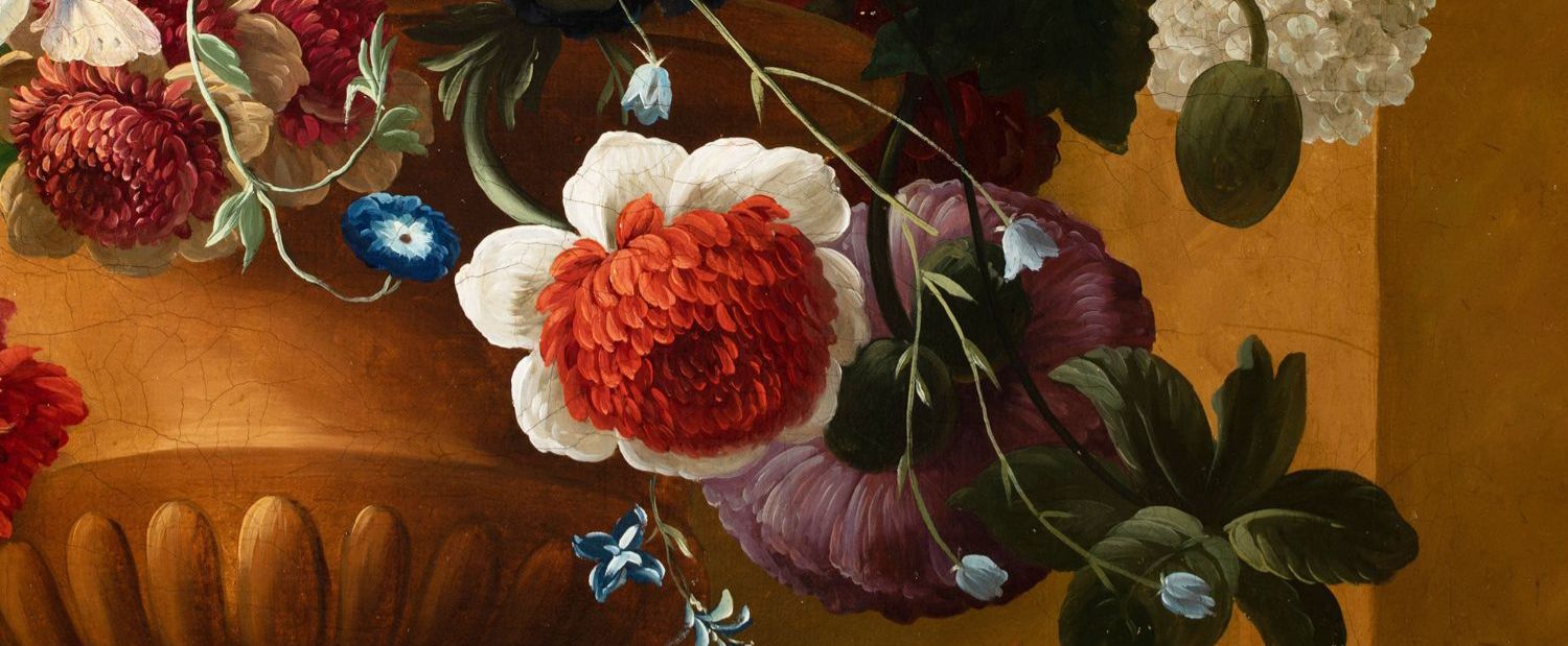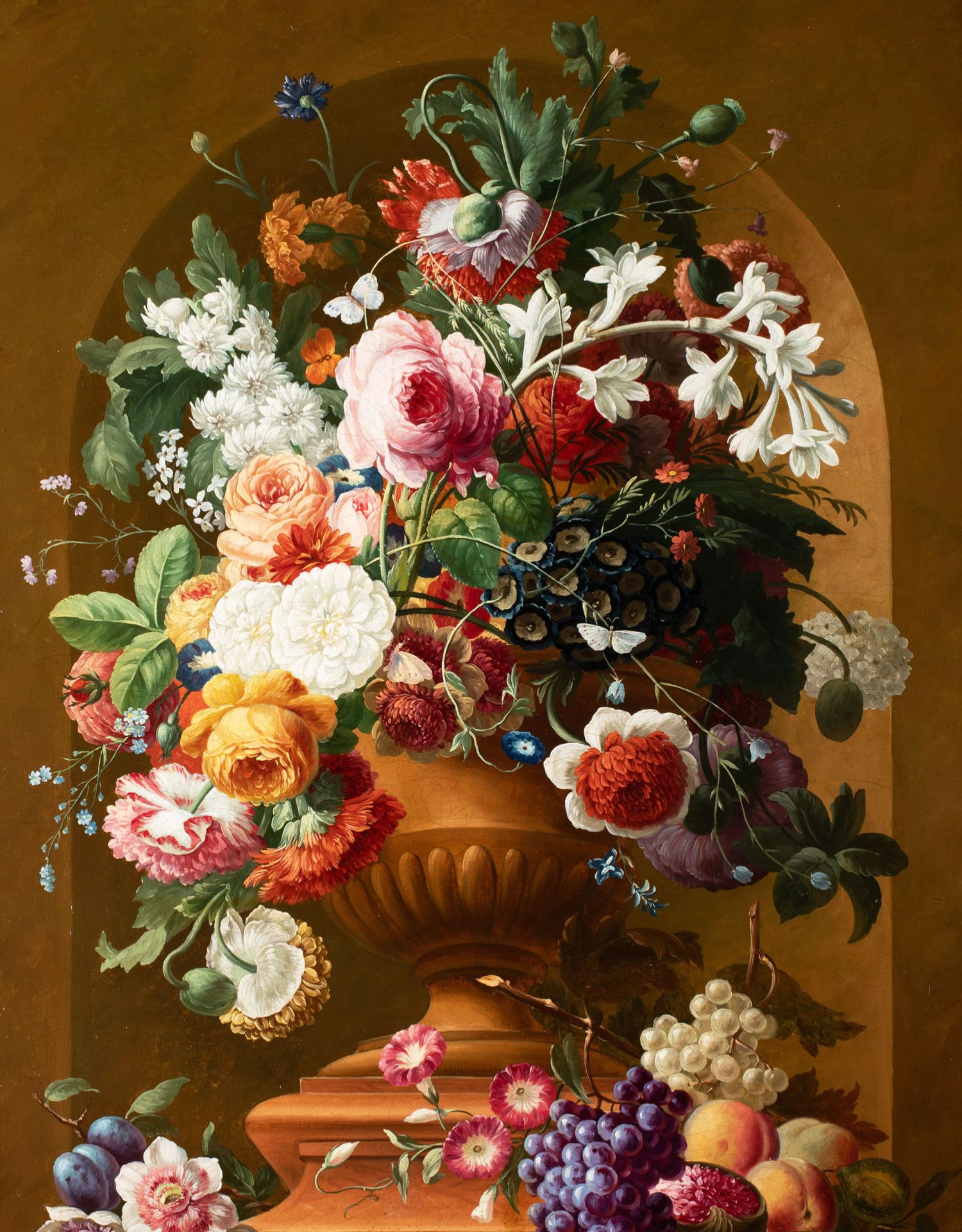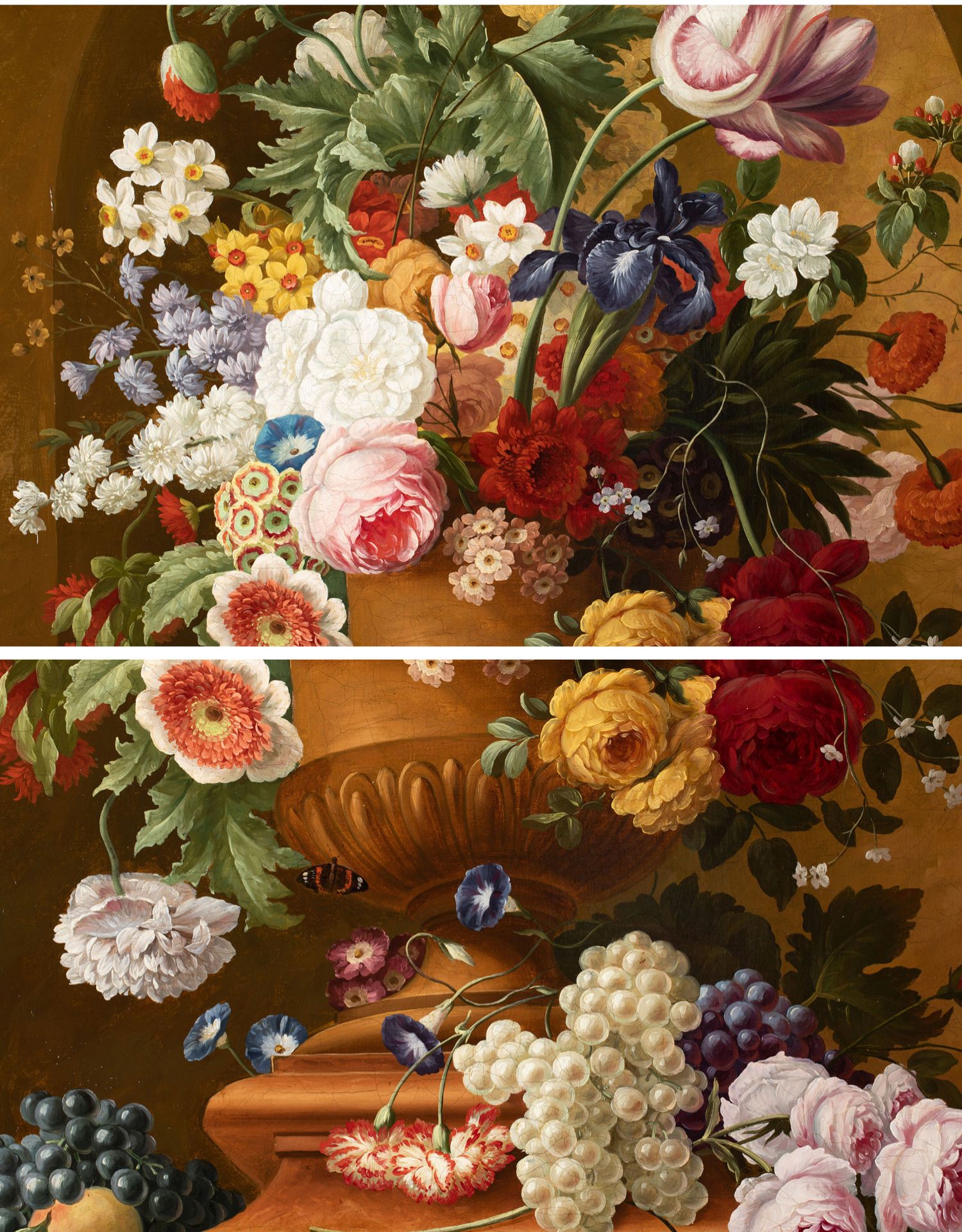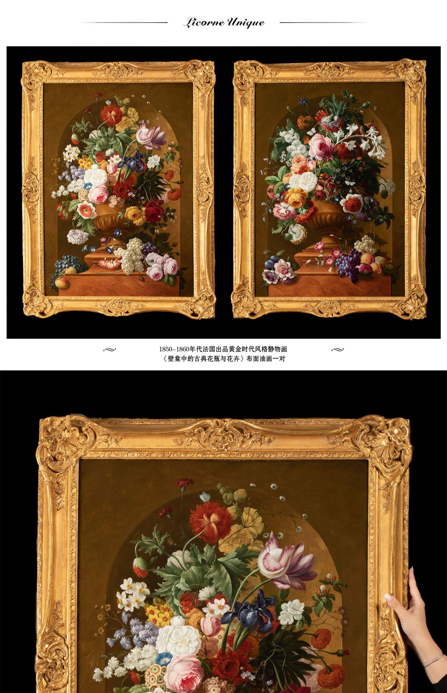 独角鹿西洋古董法国静物画壁龛中的古典花瓶与花卉布面油画⼀对