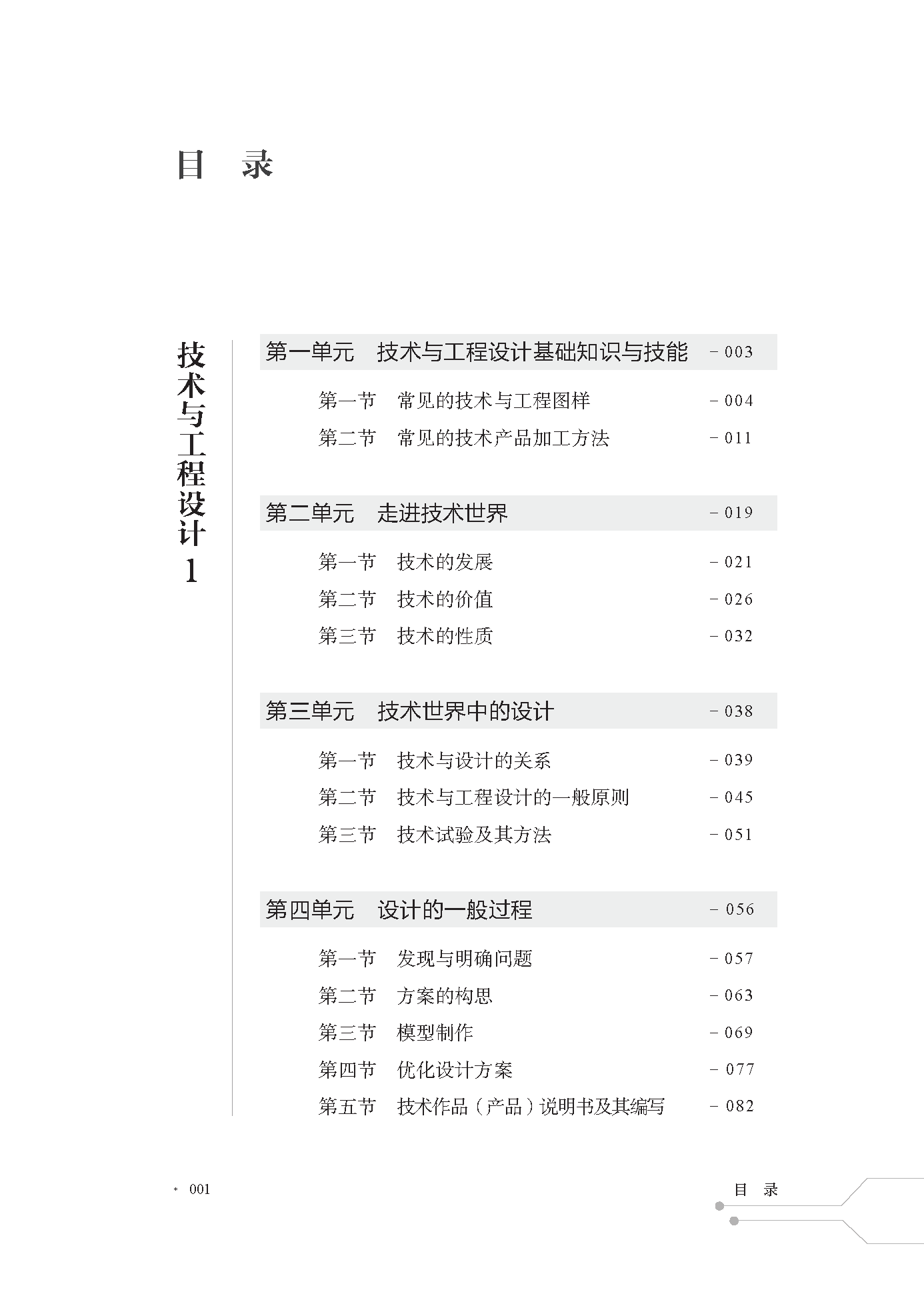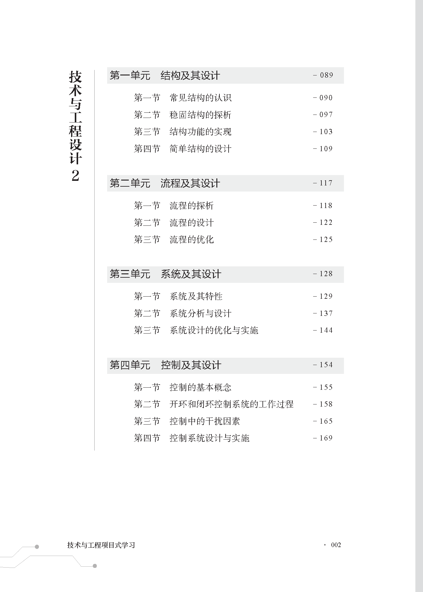 《技术与工程项目式学习》分两个部分——技术与工程设计 1 和技术与工程设计 2,涉及“技术与工程设计基础知识与技能”和“设计的一般过程”等内容,旨在让学生在学习相关课程内容之前对技术与工程设计中所涉及的制图能力、物化能力及现代相关技术的应用能力等做一个较为完整的训练,为学习技术与工程设计的一般过程打下坚实的基础。 “技术与工程设计 1”侧重产品设计领域,“技术与工程设计 2”则将视野扩展到更大的工程领域,还设计了较为宏大且易于操作的工程项目让学生进行实践。