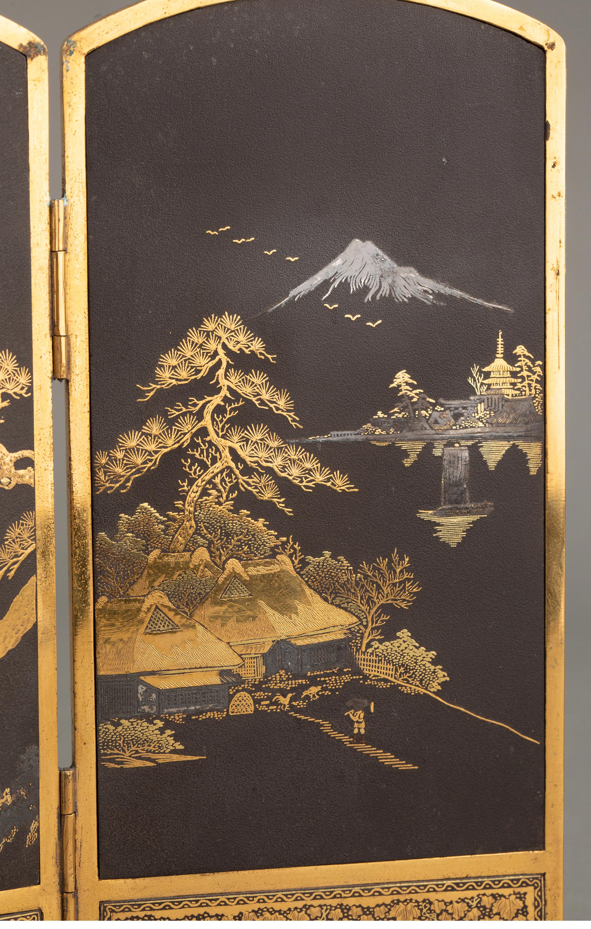 1900年代日本明治时期出品东瀛自然图景主题黑地布目镶嵌桌屏