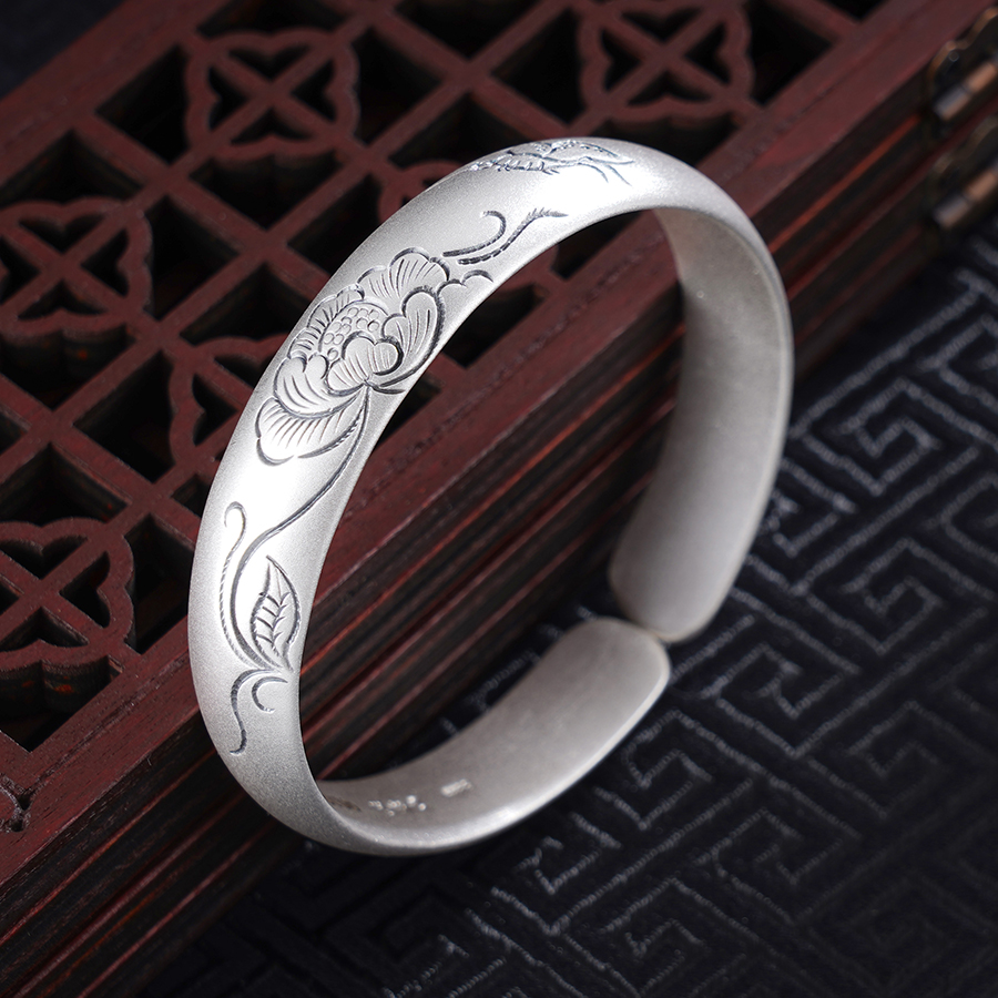 【寓意】:子佩集匠心手作银镯,采用成都金银器制作技艺,于镯体之上錾刻牡丹蝴蝶纹样,寓意富贵花开、福气绵延。