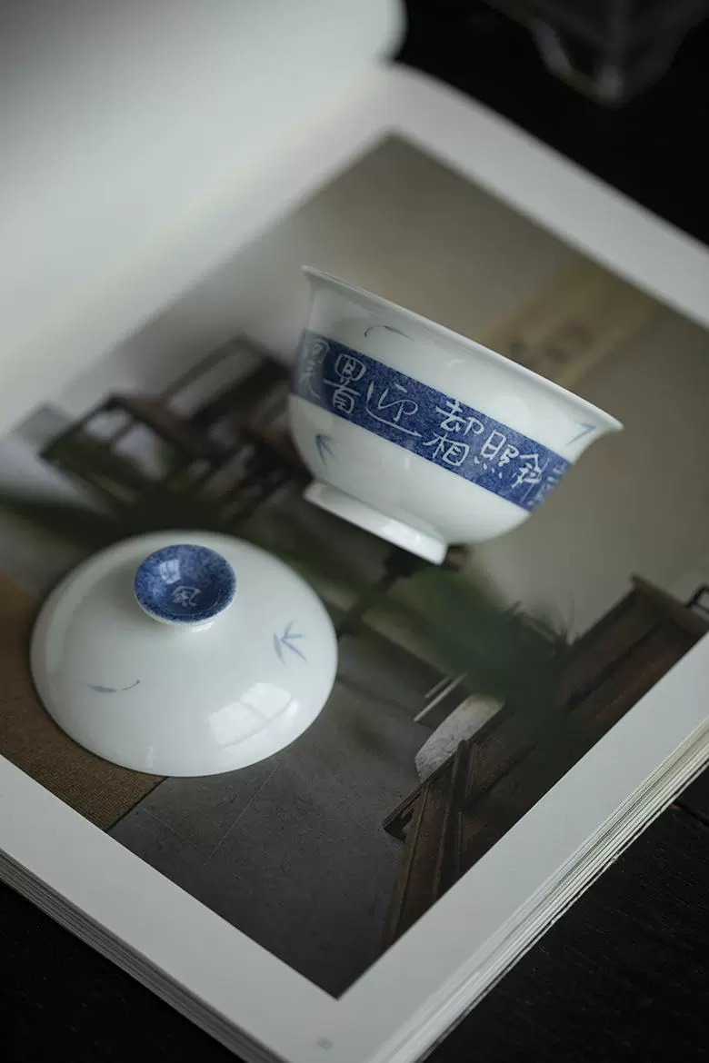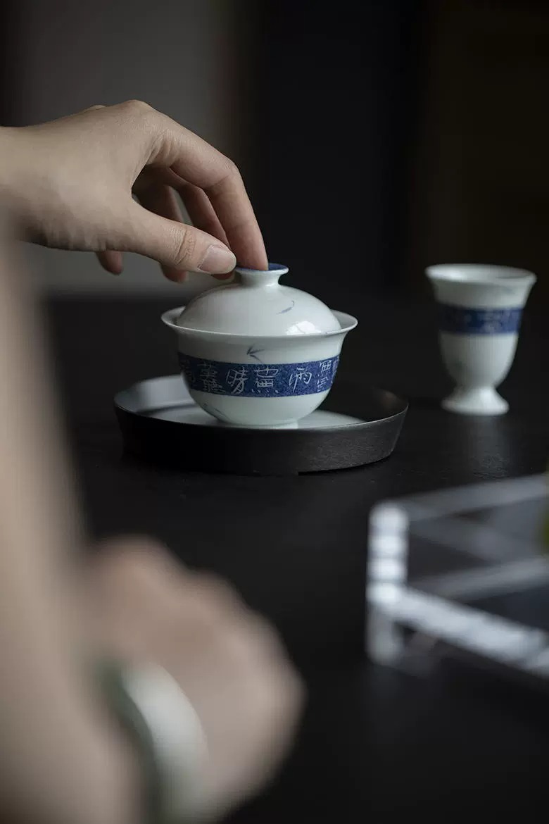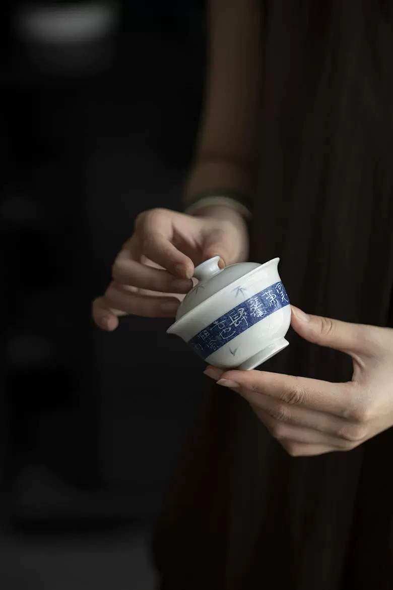 束刻/留白诗文竹影/清然盖碗弥言洒蓝釉下彩手绘盖碗手写诗文留白泡茶碗茶杯文人茶器功夫茶具