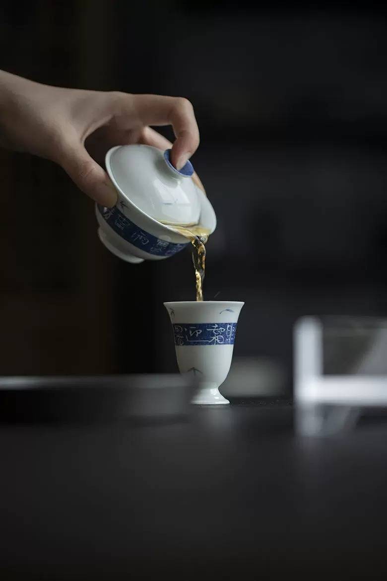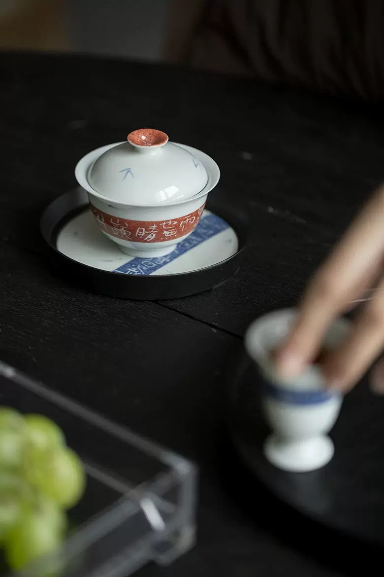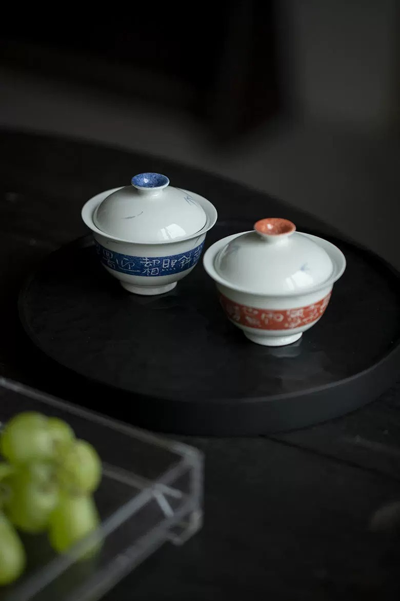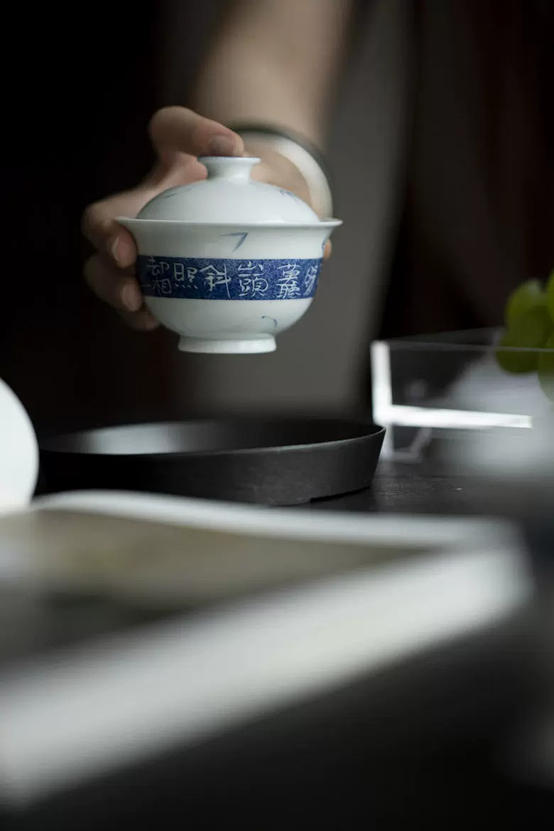 束刻/留白诗文竹影/清然盖碗弥言洒蓝釉下彩手绘盖碗手写诗文留白泡茶碗茶杯文人茶器功夫茶具