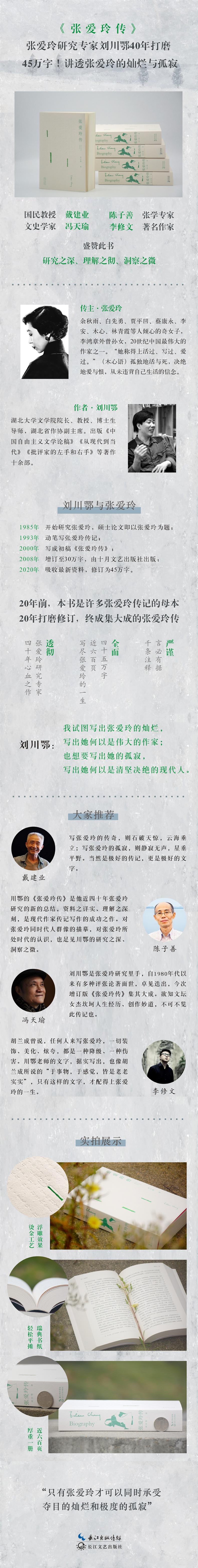 《张爱玲传》是张爱玲研究专家刘川鄂积40年之功写就的一部张爱玲的全传、真传。全书40余万字,以数百万言的张爱玲研究资料为依托,据实写来,力求全面、客观,追求资料之实、洞察之微、理解之彻。本书自张爱玲的祖父辈写起,对张爱玲的“贵族血统”(曾外祖父是晚清重臣李鸿章)和不幸童年,有充满了真知灼见的体察;对张爱玲的成长之路和文学之路,有联系文本的具体分析;对张爱玲名扬上海的璀璨夺目和恓惶孤寂的晚年,亦有全面的描摹和深刻的分析;对张爱玲与胡兰成的恋爱及去国之后与赖斯的结合,也挖掘史料,力求全面体现。本书既写出了张爱玲的绚丽夺目,写出她何以是伟大的作家;也写出了张爱玲的孤寂,写出她何以是决绝的现代人。而写张爱玲之外,对张爱玲所处之时代与同时代人的着墨,亦可见作者开阔眼光与雄浑笔力。