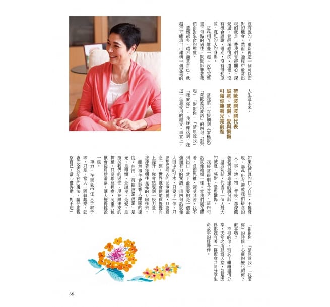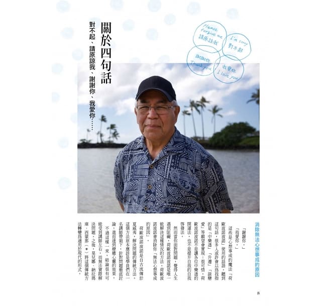 吳念真導演說:「人生受用無窮的四句話是:對不起、請原諒我、謝謝你、我愛你。」夏威夷古傳的「荷歐波諾波諾」四句話療法,一開始是由身為「夏威夷州寶」的傳統治療師──莫兒娜聽見靈感的聲音改良而成,本來僅在當地流傳,後來越來越廣為人知,甚至受邀至聯合國教科文組織等機構講課。至今在全球各地,已有無數幸福奇蹟持續發生。