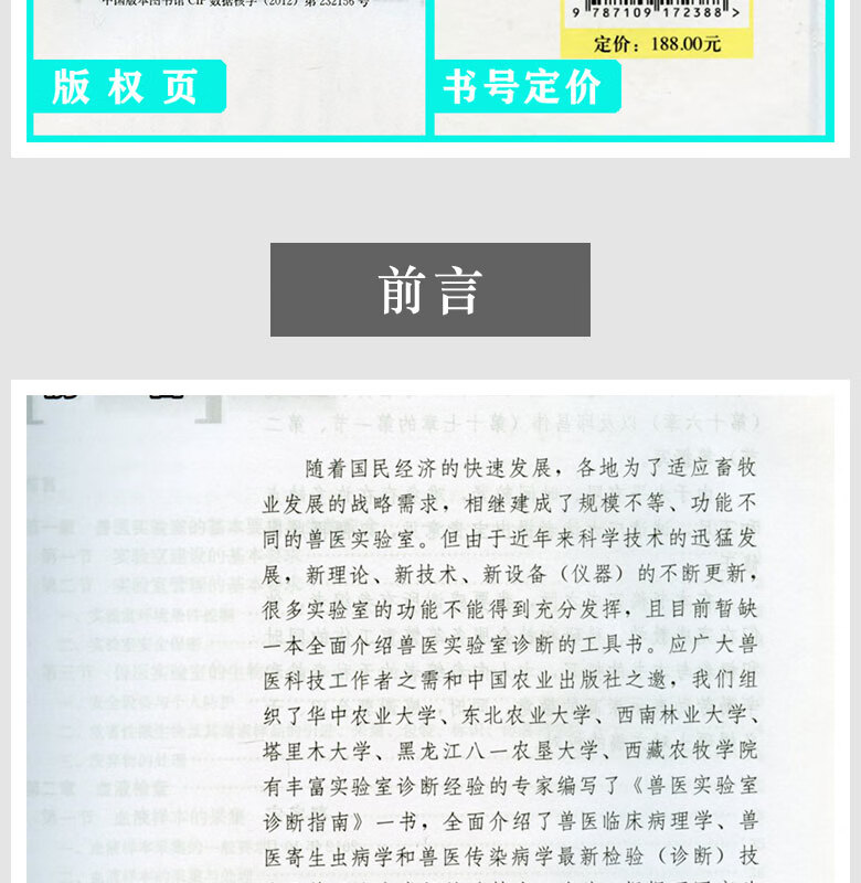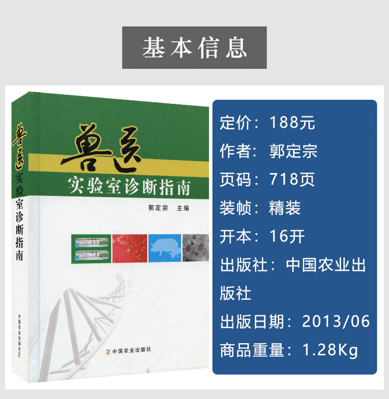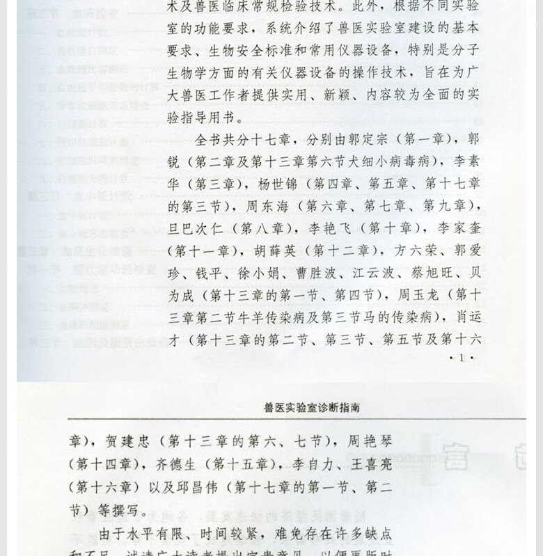 《兽医实验室诊断指南》共分十七章分别是:兽医实验室的基本要求与生物安全、血液检查、血液生化检查、贫血的检查、血液电解质、血气及酸碱平衡检查、止血与凝血障碍的检查、血型及交叉配血试验、肾功能试验、尿液检查、粪便检查、体液检查、兽医病理学检查、动物常见传染病的实验室诊断、动物寄生虫病检验、常见毒物检验、兽医实验室常用技术、常用仪器等内容。