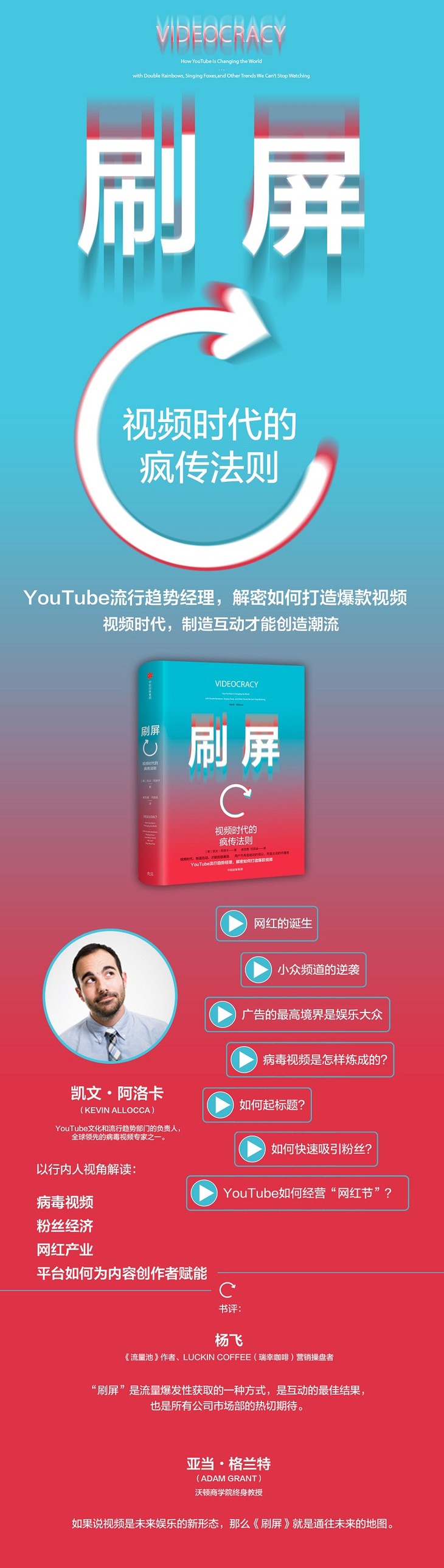 YouTube流行趋势经理在《刷屏》中,以局内人的视角分析了近年来疯传网络的病毒视频,包括恶搞、音乐、广告、知识传播、小众频道等各种类型,深入探讨了这些视频是如何流行起来的,网红主播怎样快速吸引粉丝,以及如何引领流行文化。
