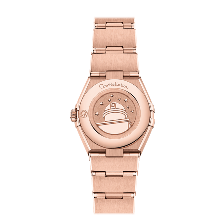 镜面材质 | 蓝宝石水晶玻璃 | 表盘 | 经典的半月形切面、“托爪”以及mono-rang表链。 Sedna® 18K金与精钢打造,表圈镌刻罗马数字刻度,蓝色砂金石玻璃表盘设有钻石小时刻度。表链、指针、欧米茄品牌标识、星座徽标以及钻石托槽亦以Sedna® 18K金打造而成。 密底,表背印有星座天文台徽章。 |
