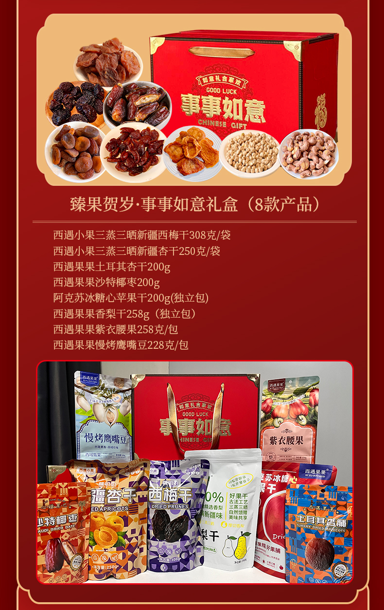 ②【臻果贺岁·事事如意礼盒(8款)】:三蒸三晒新疆西梅干308克/袋+三蒸三晒新疆杏干250克/袋+土耳其杏干200g+沙特椰枣200g +阿克苏冰糖心苹果干200g(独立包)+香梨干258g(独立包)+紫衣腰果258克/包 +慢烤鹰嘴豆228克/包