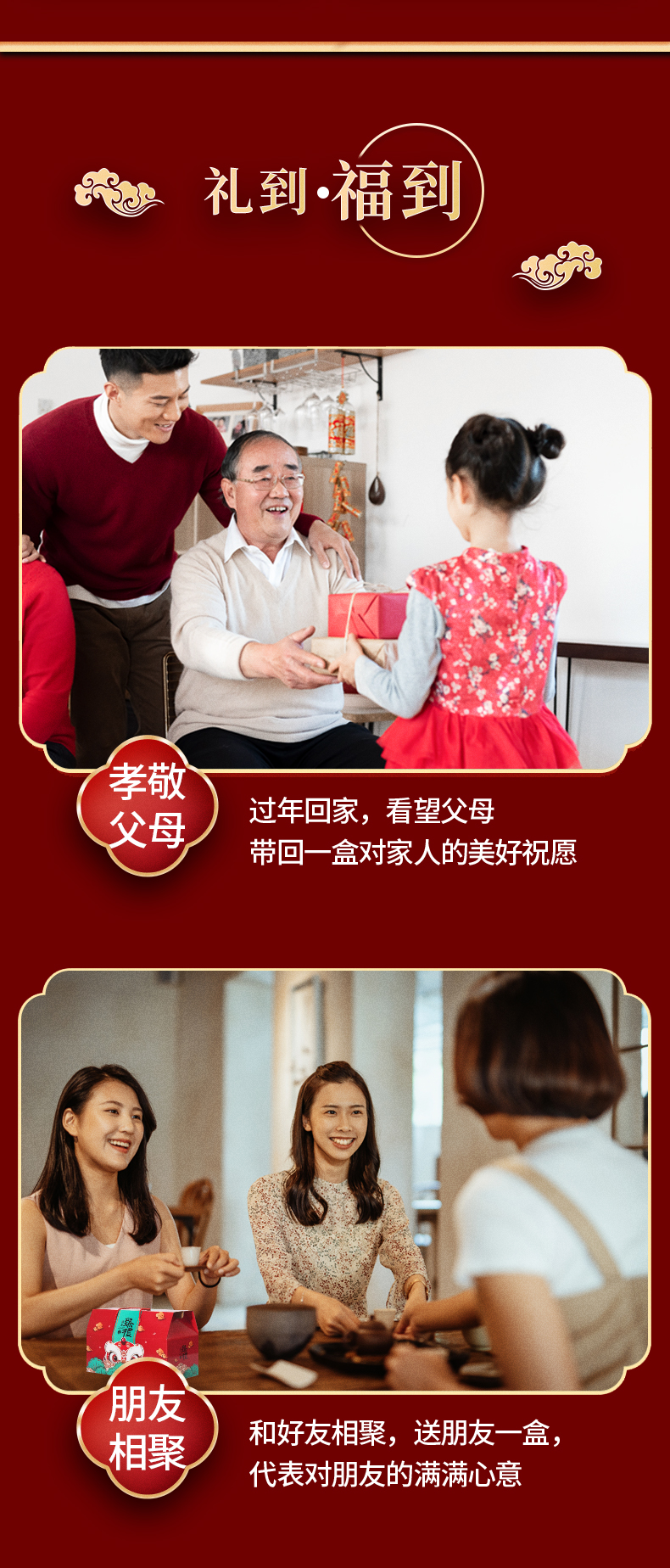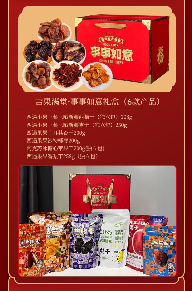 ①【吉果满堂·事事如意礼盒(6款)】:三蒸三晒新疆西梅干(独立包)308g+三蒸三晒新疆杏干(独立包)250g+土耳其杏干200g+沙特椰枣200g+阿克苏冰糖心苹果干200g(独立包)+香梨干258g(独立包)