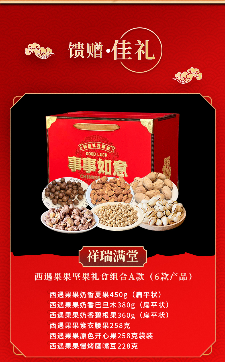 ⑤【祥瑞满堂·事事如意坚果礼盒(6款)】:奶香夏果450g(扁平状) +奶香巴旦木380g(扁平状) +奶香碧根果360g(扁平状)+紫衣腰果258克 +原色开心果258克袋装 +慢烤鹰嘴豆228克