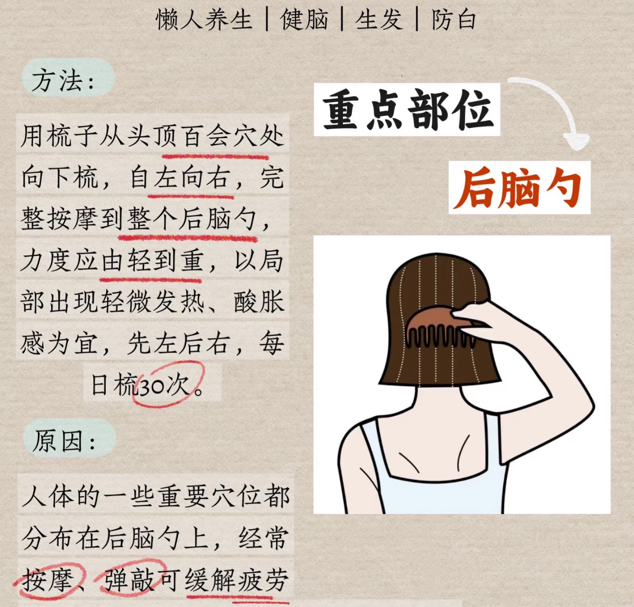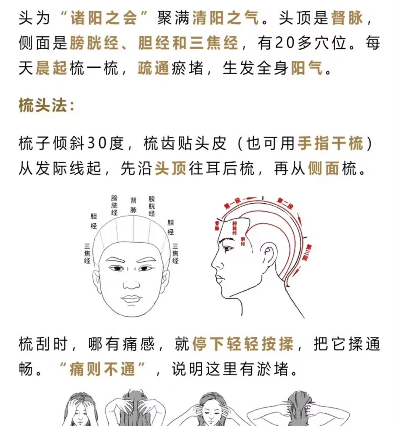 梳子从头顶百会穴向下梳,自左向右,完整按摩整个后脑勺,以局部出现轻微发热,酸胀感为宜,每天梳30下。