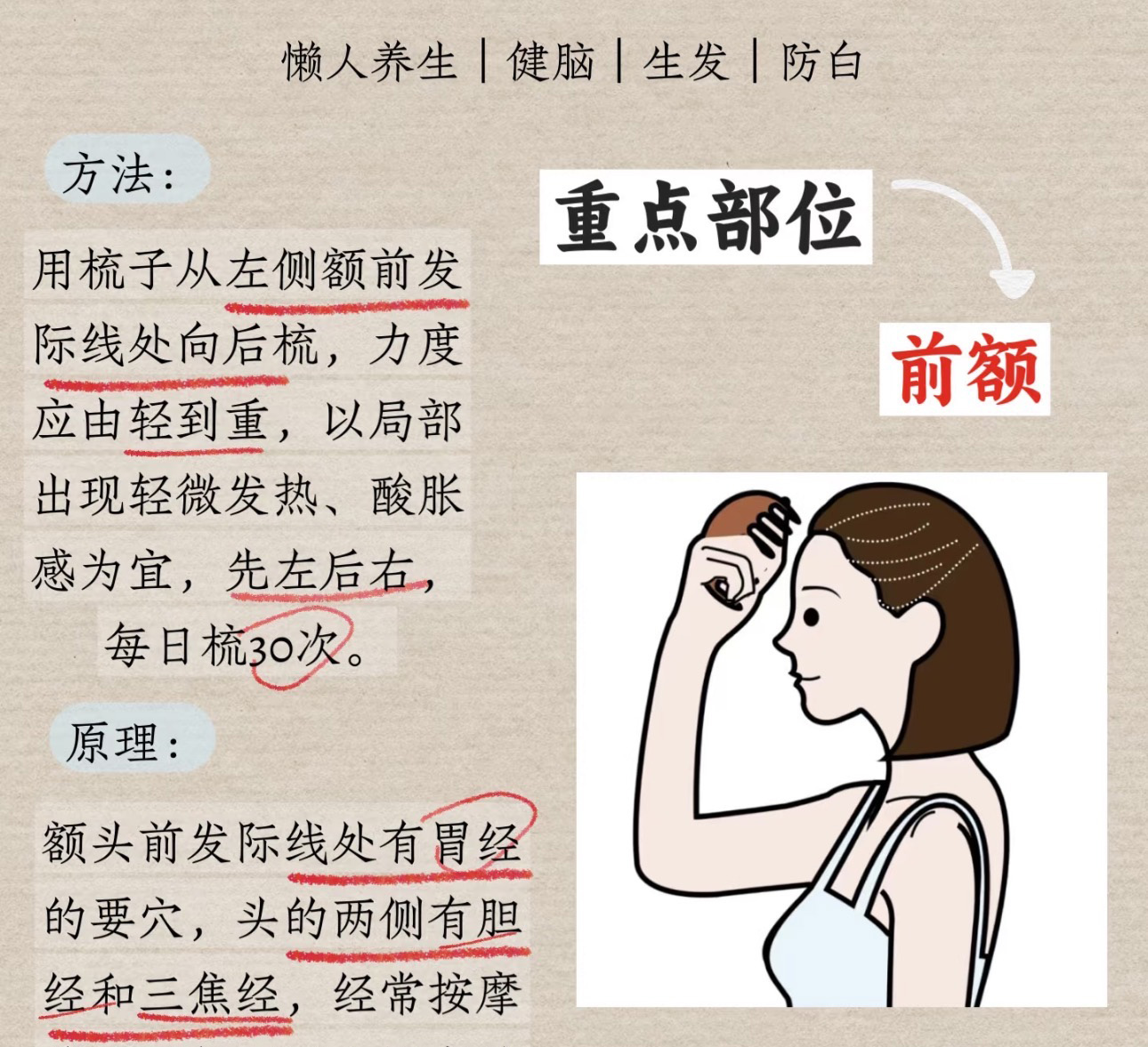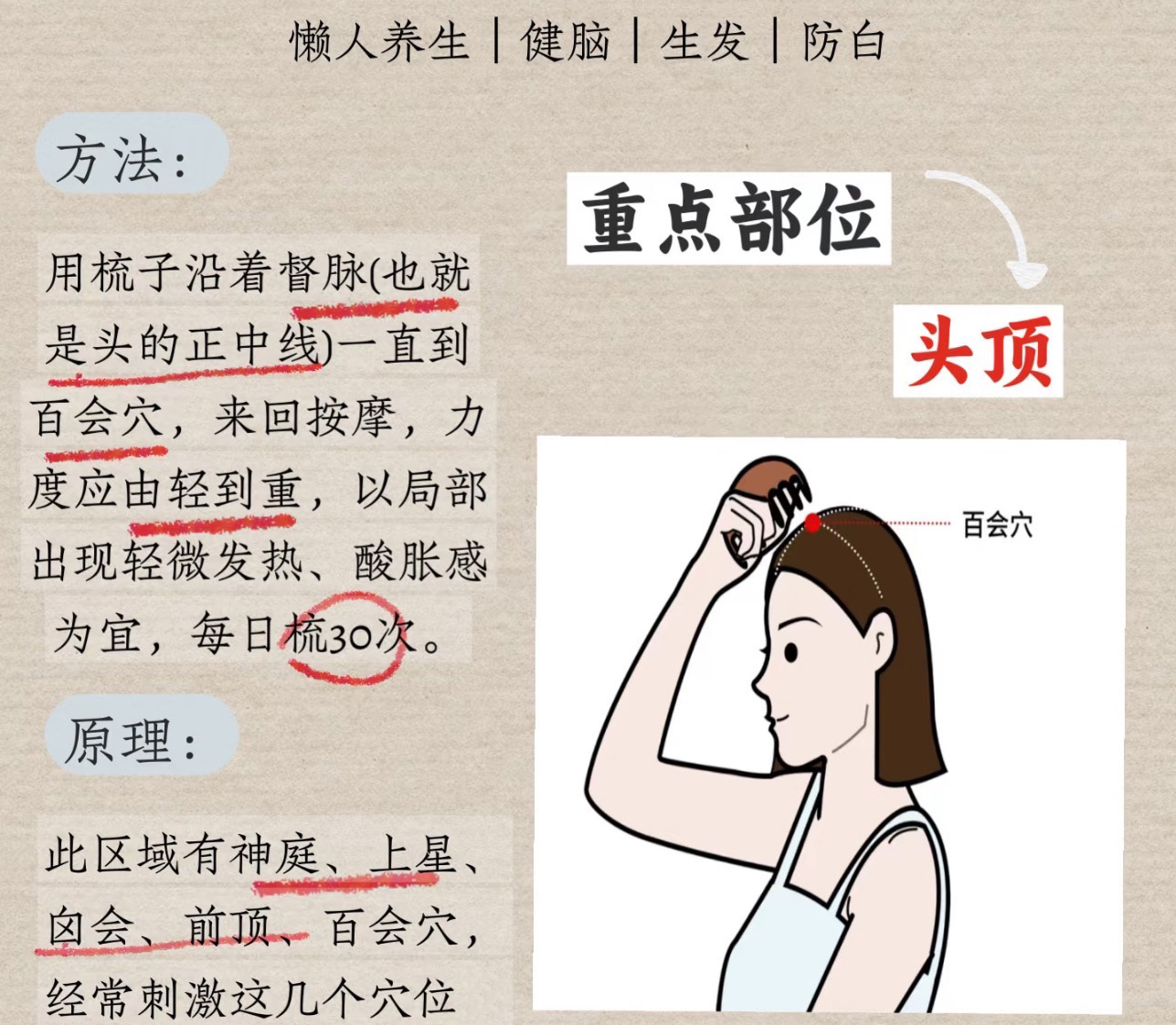 梳子沿着督脉(也就是头的正中线)一直到百会穴,来回按摩,力度由轻到重,以局部出现轻微发热,酸胀感为宜,每天梳30下。