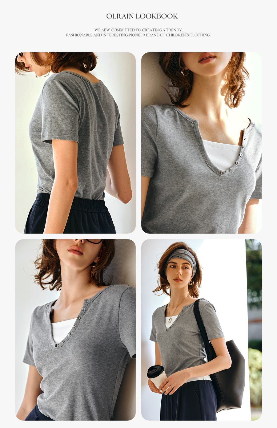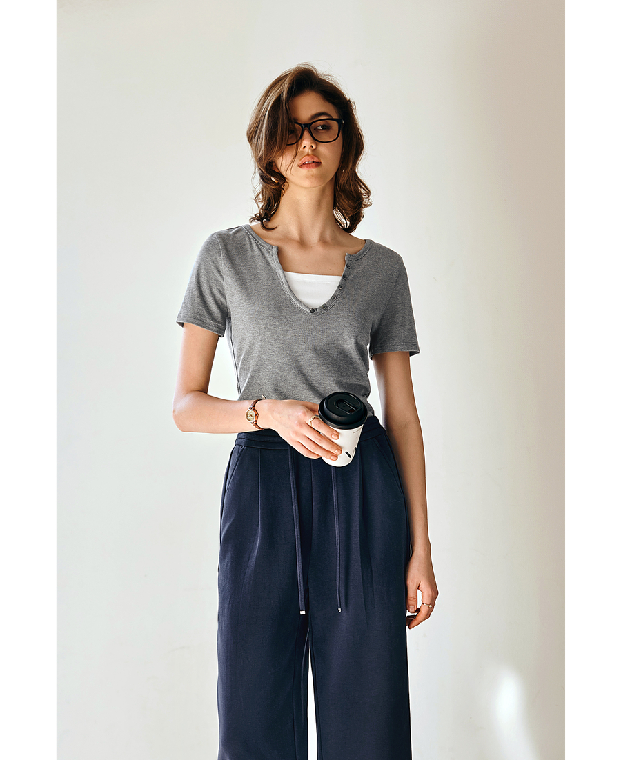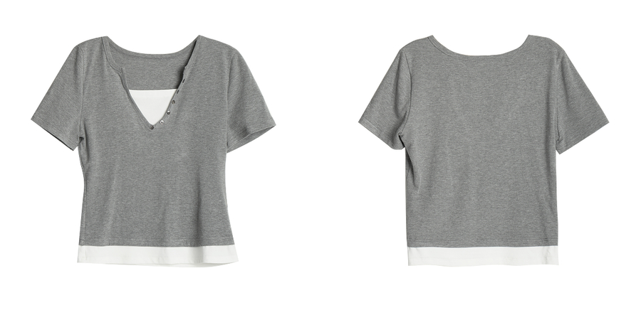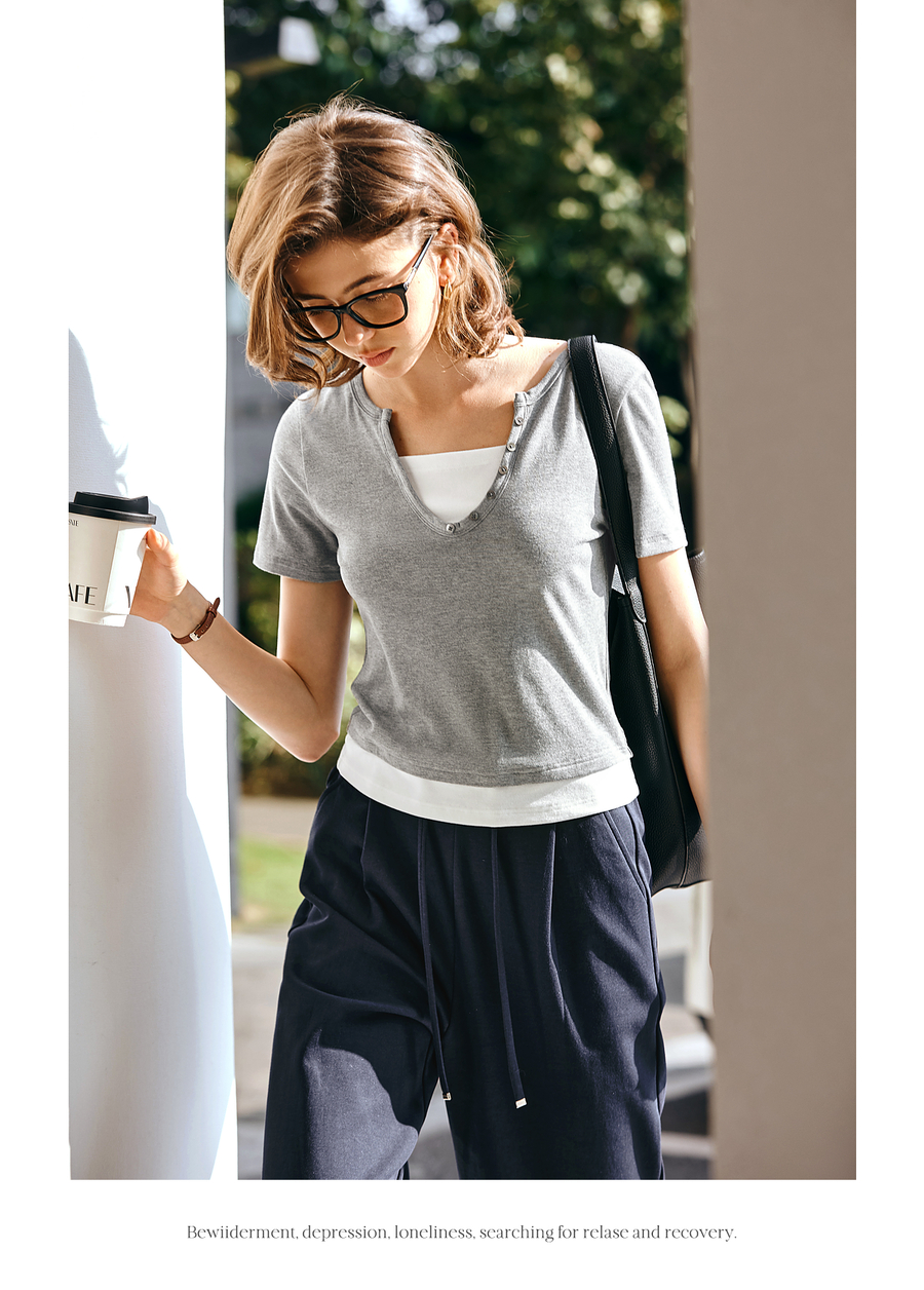 Olrain欧芮儿2025夏季新款假两件正肩设计简约休闲修身显瘦T恤女