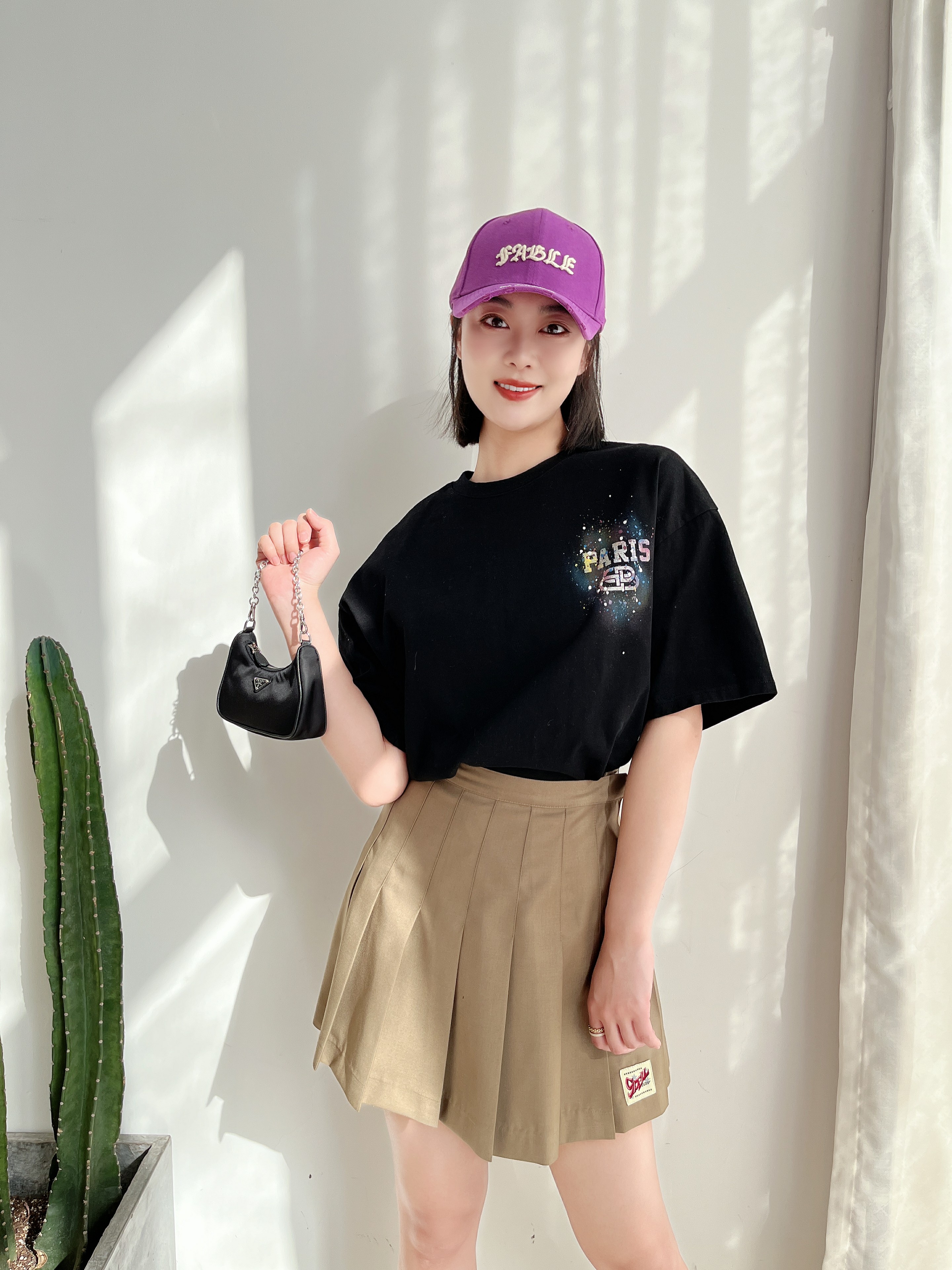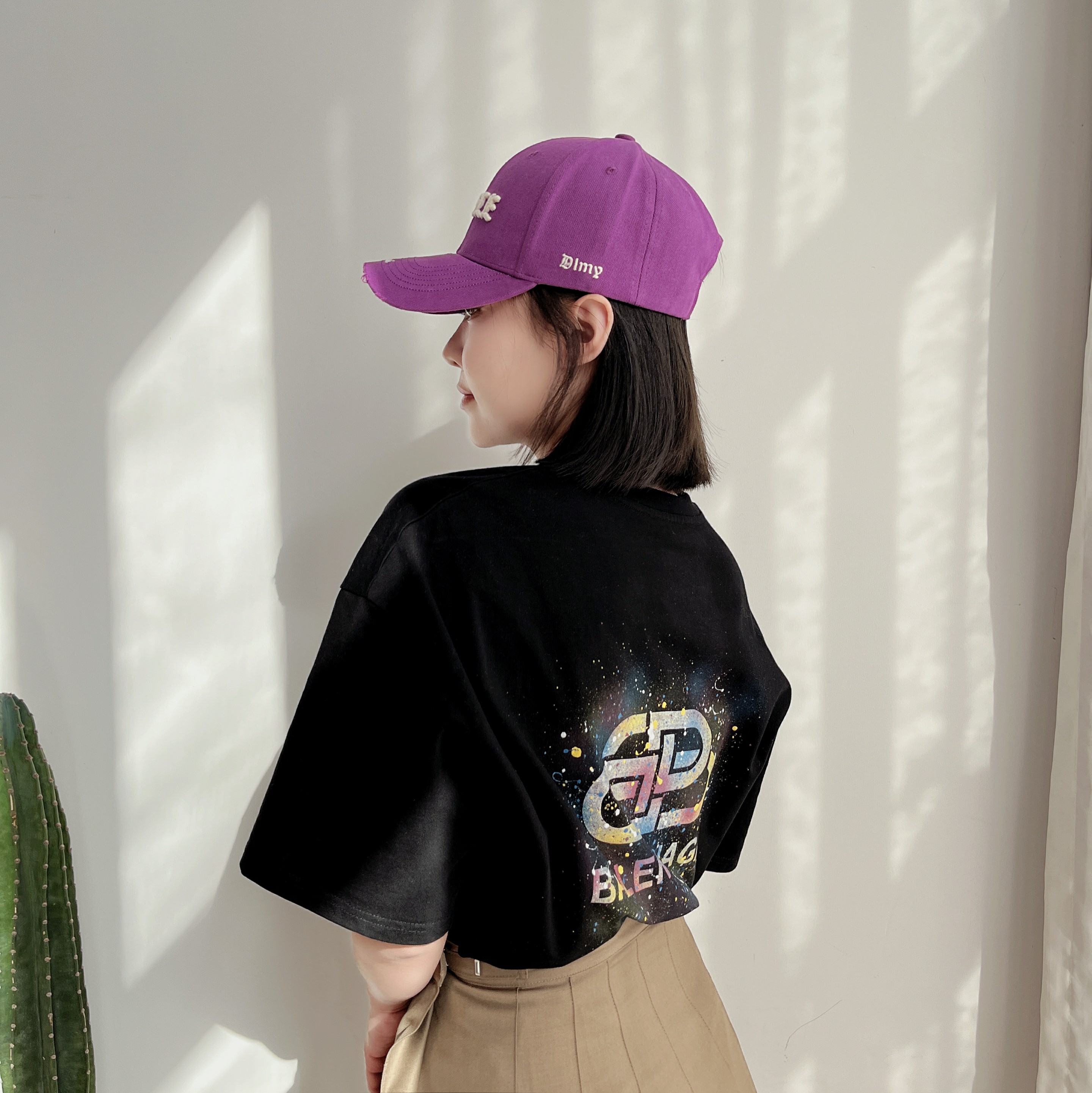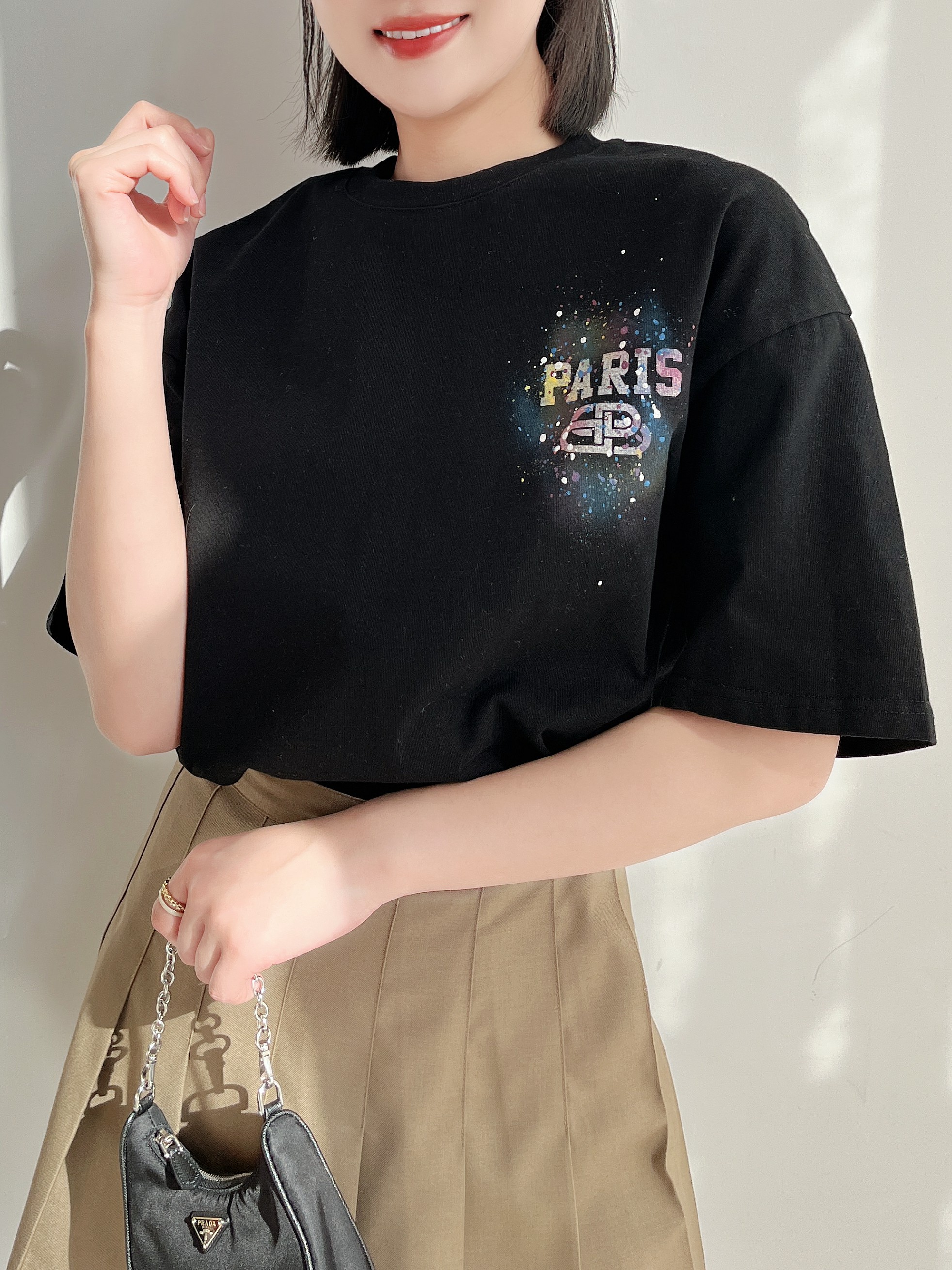 夏季新品短袖T恤锁扣烫金logo手工喷绘印花后背工艺双纱棉男女款