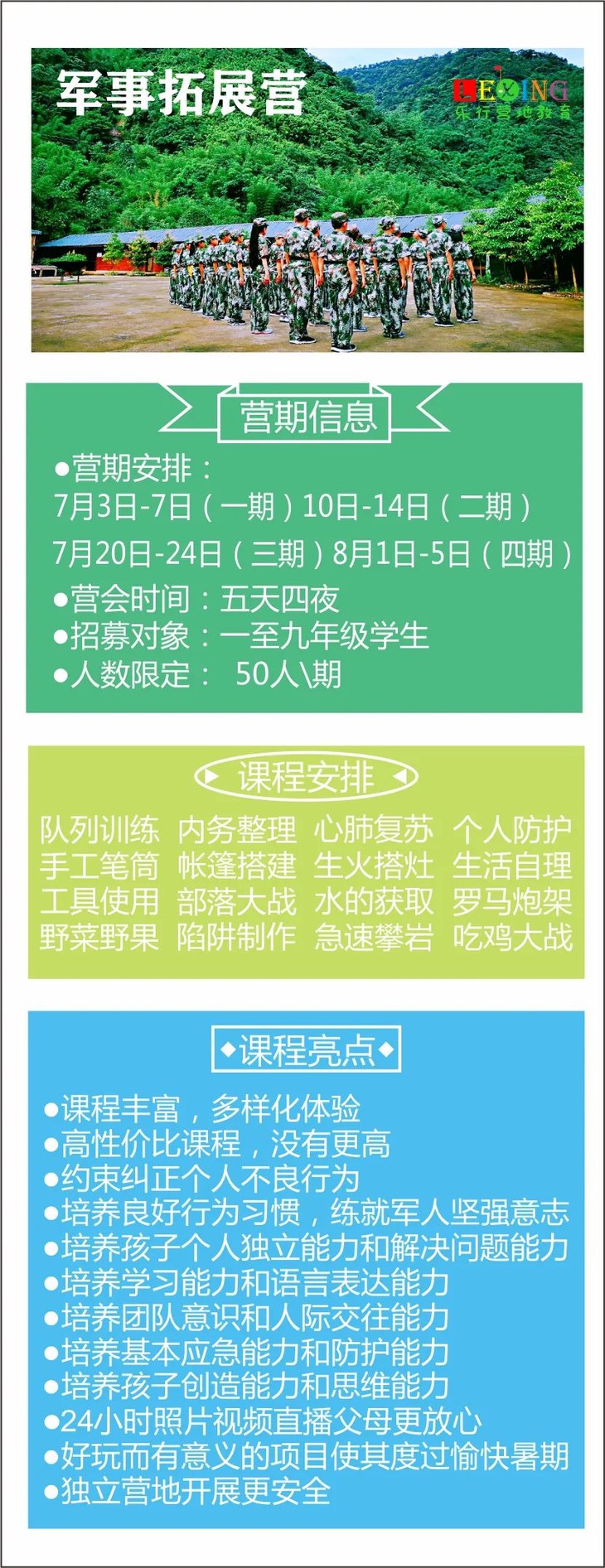2、营地保障:营地半封闭式管理,除工作组外还有宿舍管理人员等专人负责夜间巡逻,确保孩子安全;