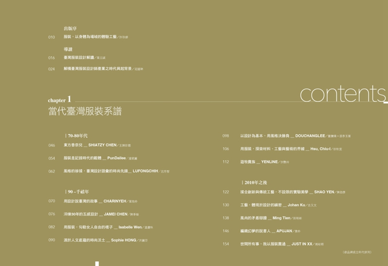 全書採訪16位臺灣重要服裝設計師,採訪爬梳設計師的第一手資料,理解1980到2010年間,臺灣服飾設計的時代演變。並介紹他們如何踏上服裝設計之路,發揮美感創造力,帶動時尚品味;也見證多個臺灣服裝品牌,從單打獨鬥到前往海外展店的輝煌時光;其中有奪得國外獎項肯定,一躍成為臺灣之光的優秀作品;最後則是新生代勇敢跨出海外,前進國外各大時裝週的創作探尋。