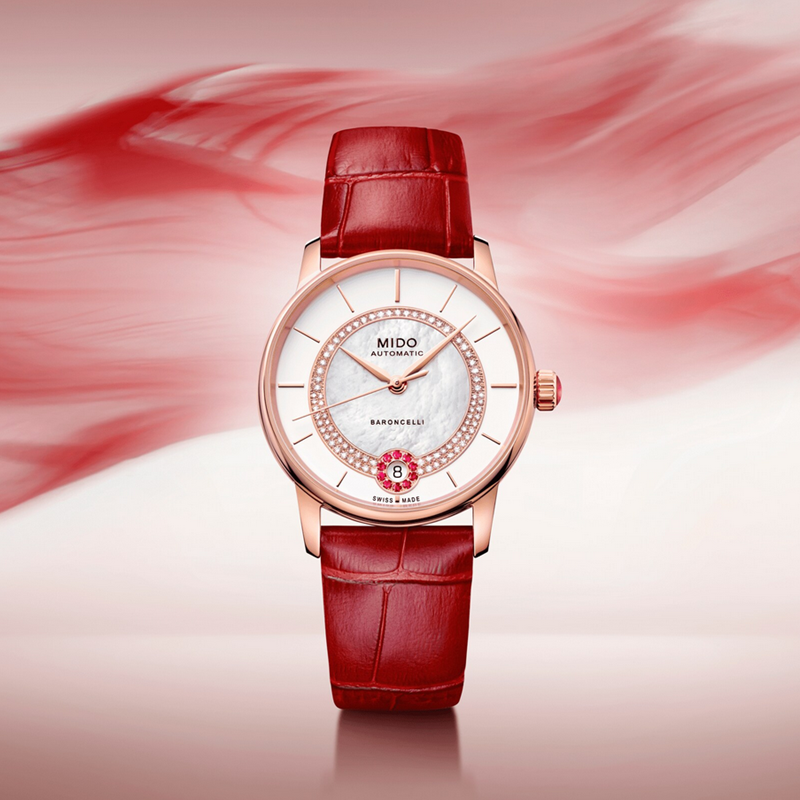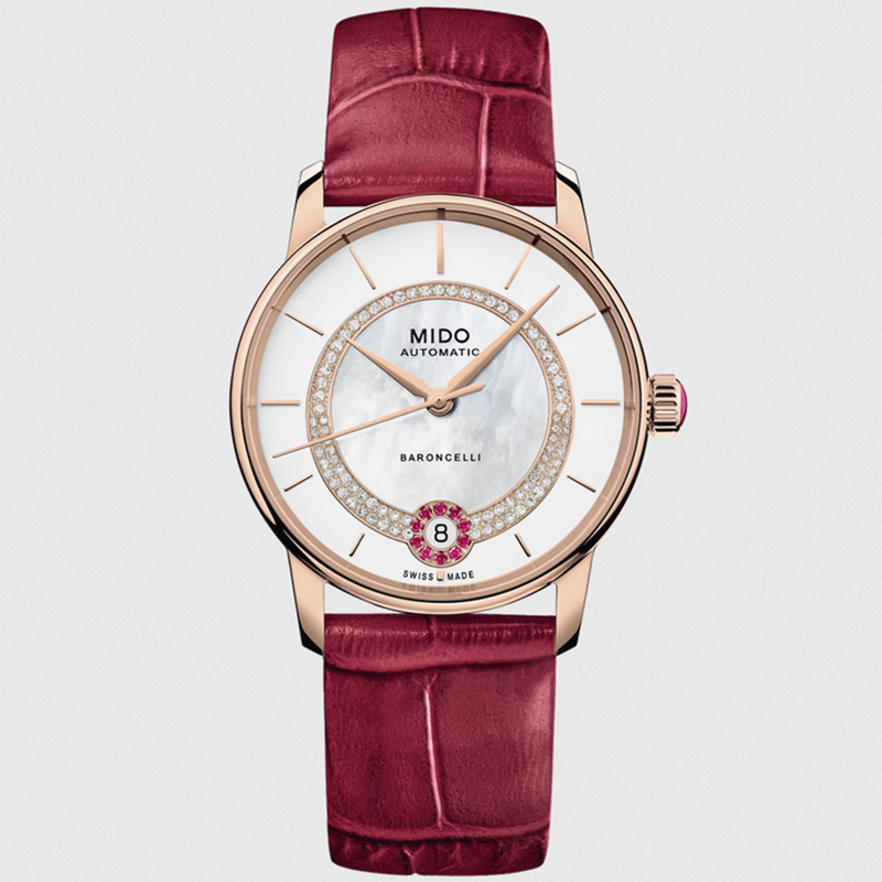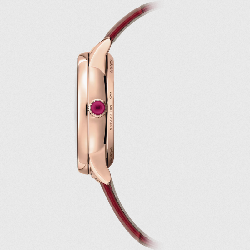 镜面 材质 | 蓝宝石水晶玻璃 | 表盘 | PVD玫瑰金表壳 表盘中央饰有白色珍珠贝母,周围环绕镶嵌着83颗真钻(共0.180克拉),刻度经精细喷砂和抛光处理。日期窗位于6点钟位置,镶有10颗红宝石(共0.048克拉)。刀型时针和分针,钻石切割秒针。 表冠饰有一颗猩红色凸圆形合成宝石 日期显示 透底 |
