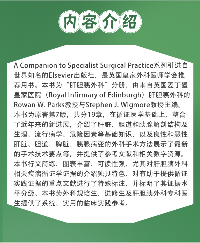 A Companion to Specialist Surgical Practice系列引进自世界知名的Elsevier出版社,是英国皇家外科医师学会推荐用书。本书为“肝胆胰外科”分册,由来自英国爱丁堡皇家医院(Royal Infirmary of Edinburgh)肝胆胰外科的Rowan W. Parks教授与Stephen J. Wigmore教授主编。本书为原著第7版,共分19章,在循证医学基础上,整合了近年来的新进展,介绍了肝脏、胆道和胰腺解剖结构及生理、流行病学、危险因素等基础知识,以及良性和恶性肝脏、胆道、脾脏、胰腺病变的外科手术方法展示了最新的手术技术要点等,并提供了参考文献和相关数字资源。本书行文简练、图表丰富、可读性强,尤其对肝胆胰外科相关疾病循证学证据的介绍独具特色,对有助于提供循证实践证据的重点文献进行了特殊标注,并标明了其证据水平分级。本书为外科规培生、进修生及肝胆胰外科专科医生提供了系统、实用的临床实践参考。