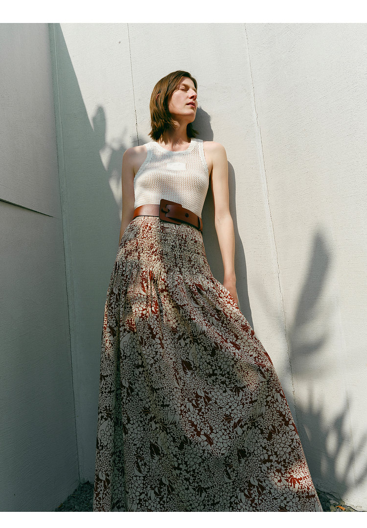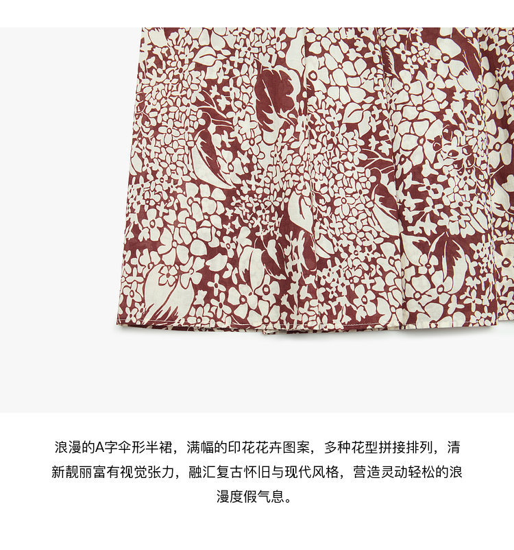 浪漫的 A 字伞形半裙,满幅的印花花卉图案,多种花型拼接排列,
