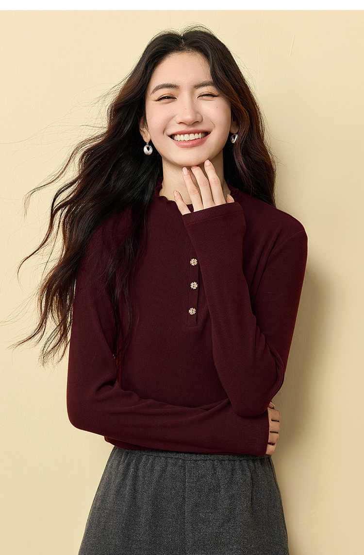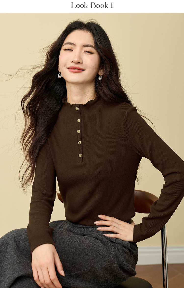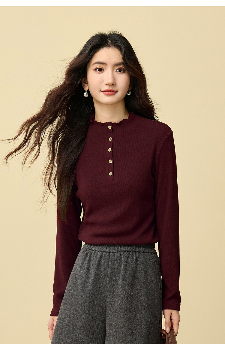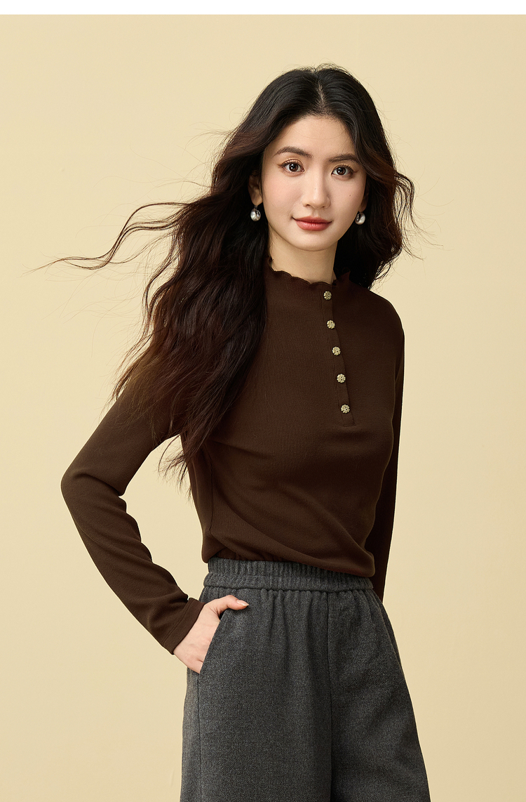 【12/03新品】熙世界波浪边半高领T恤打底衫女2025秋冬女长袖修身显瘦内搭上衣