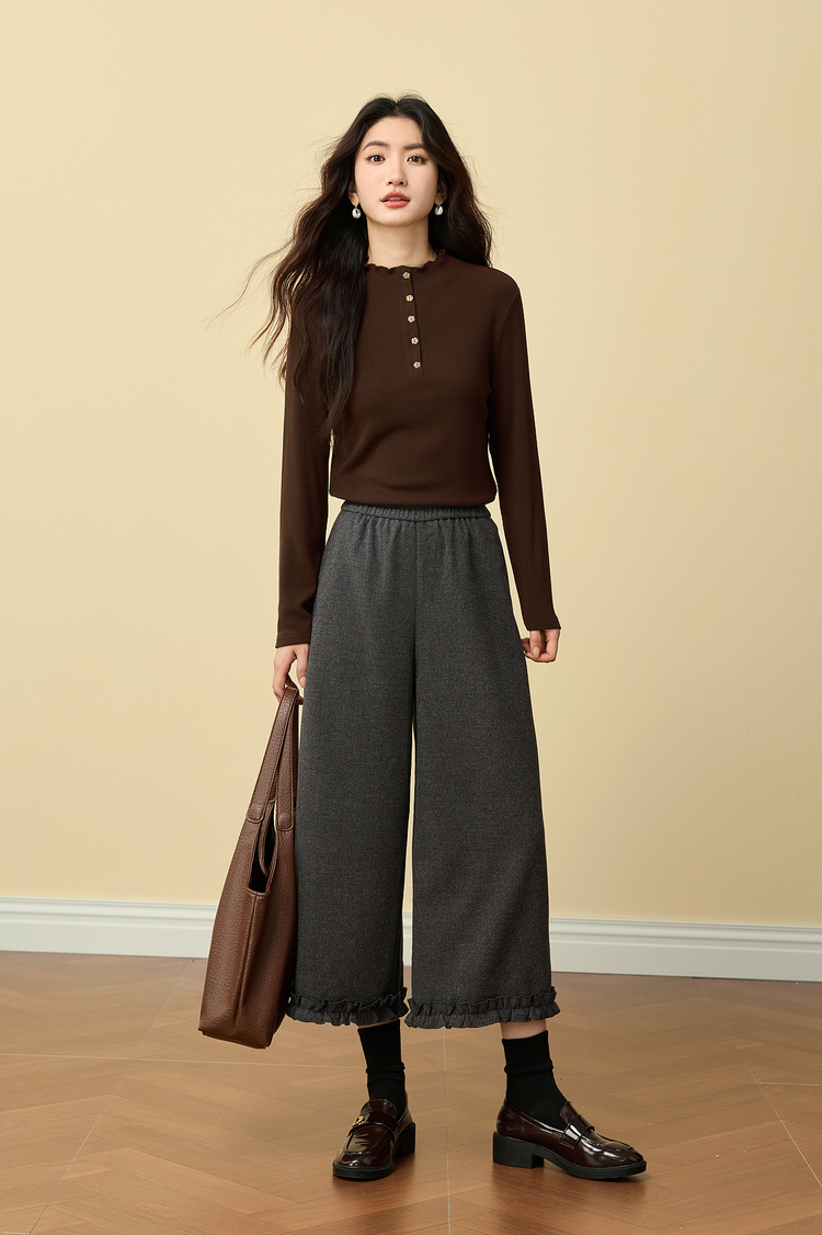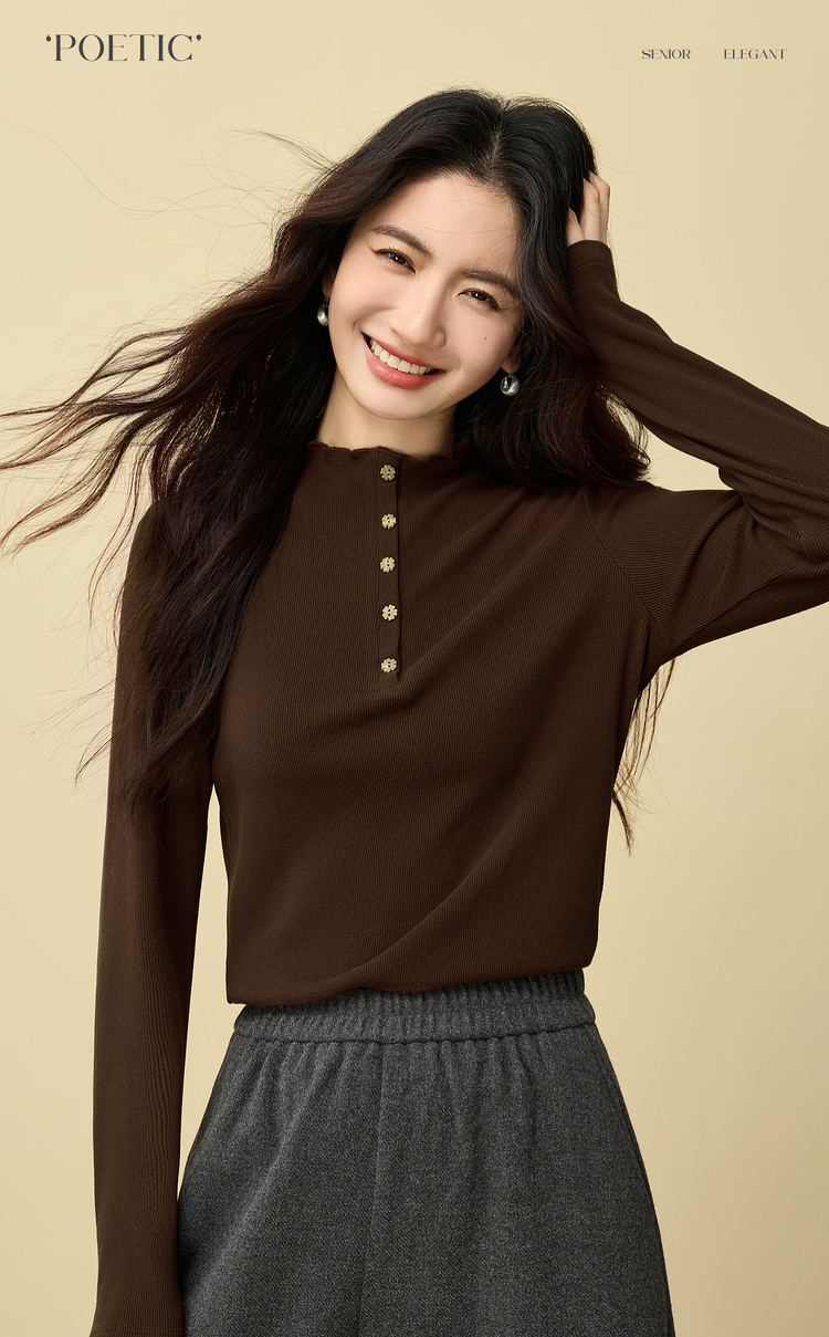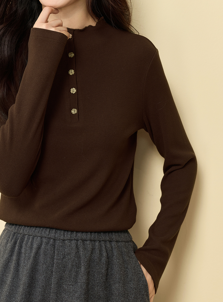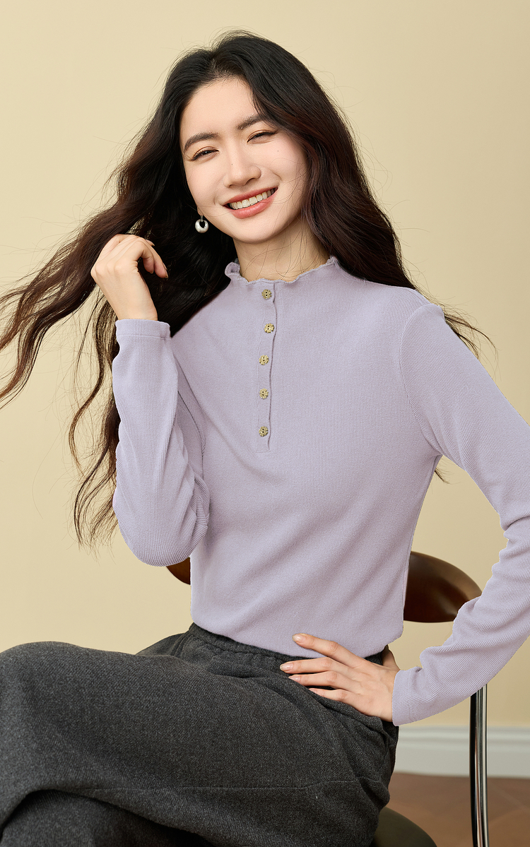 【12/03新品】熙世界波浪边半高领T恤打底衫女2025秋冬女长袖修身显瘦内搭上衣