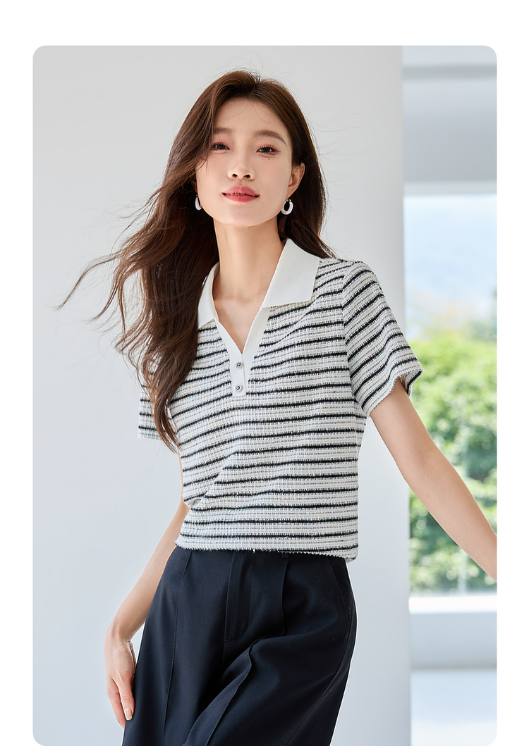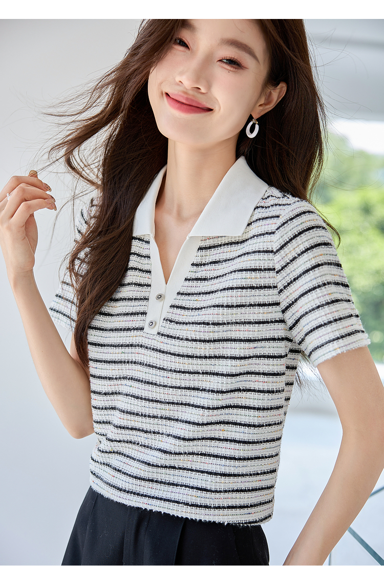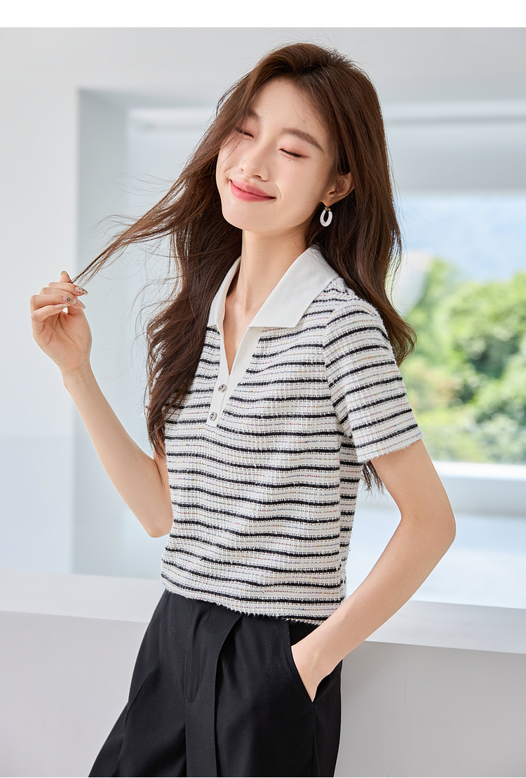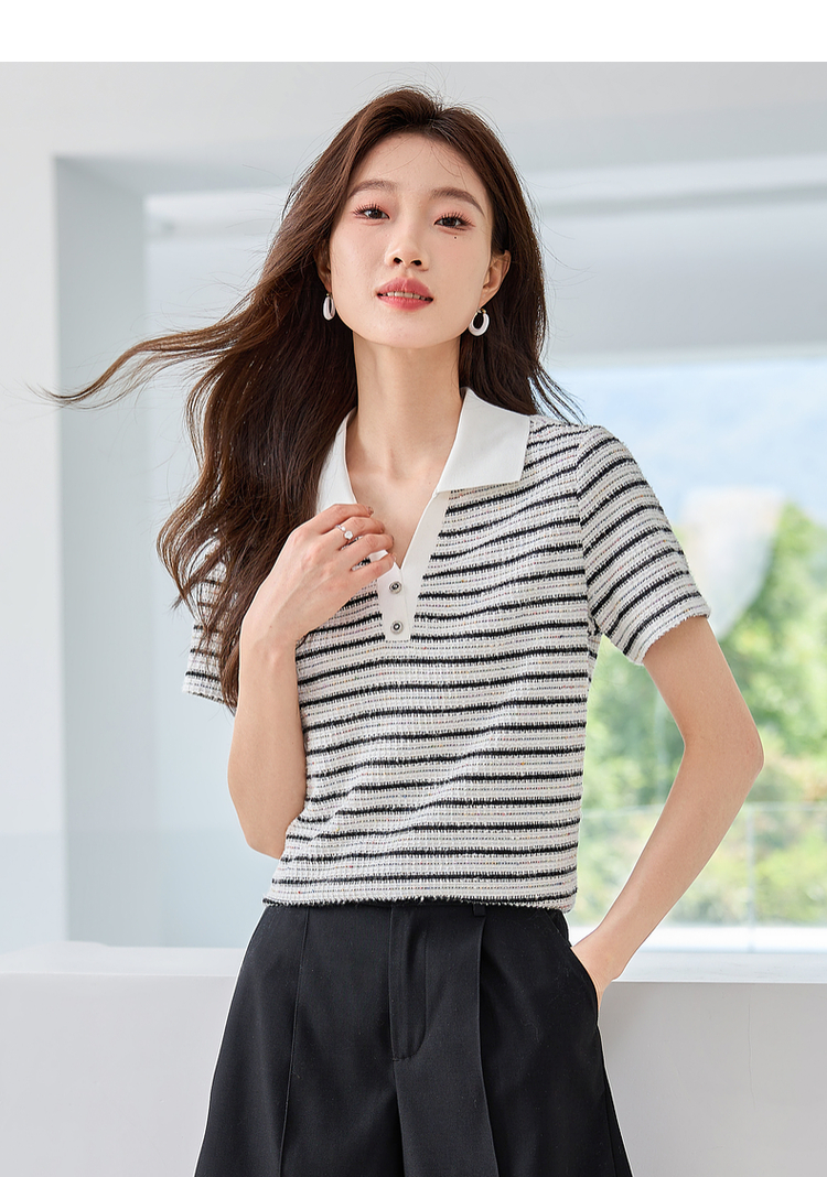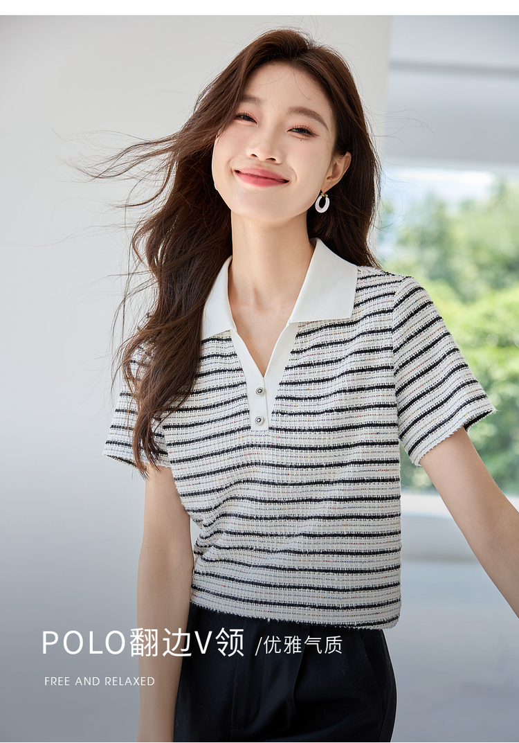 【专属特价】熙世界小香风条纹针织T恤短袖204夏季新款优雅气质POLO翻领上衣