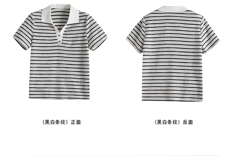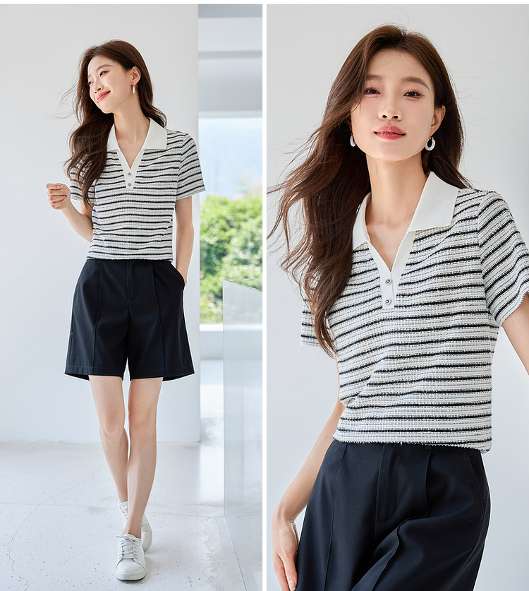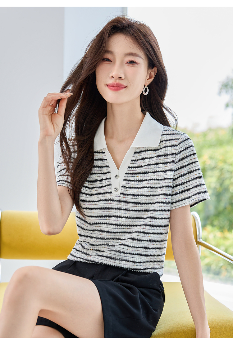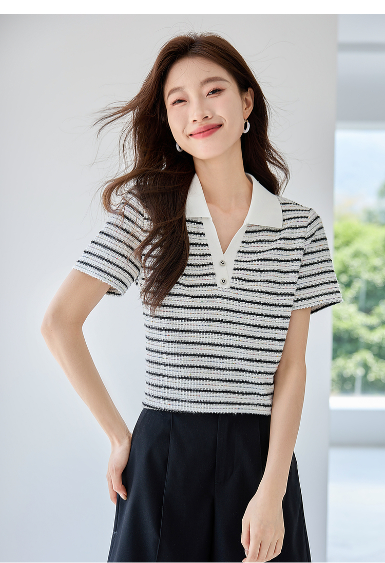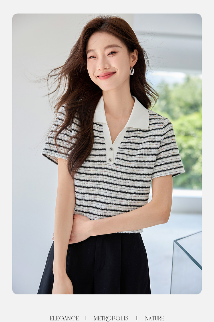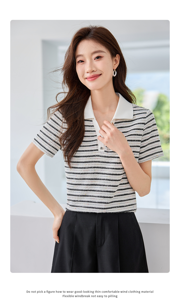 【专属特价】熙世界小香风条纹针织T恤短袖204夏季新款优雅气质POLO翻领上衣