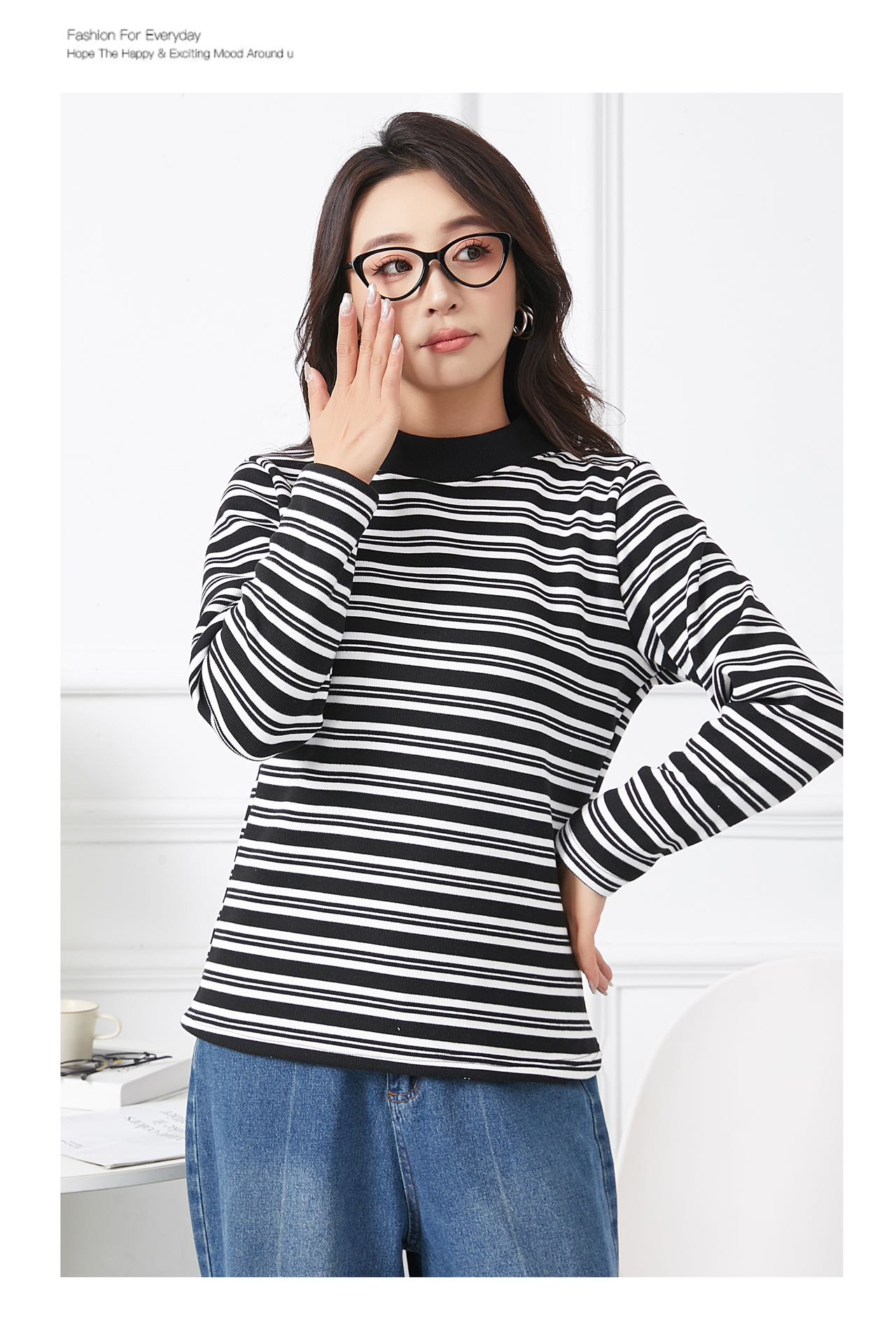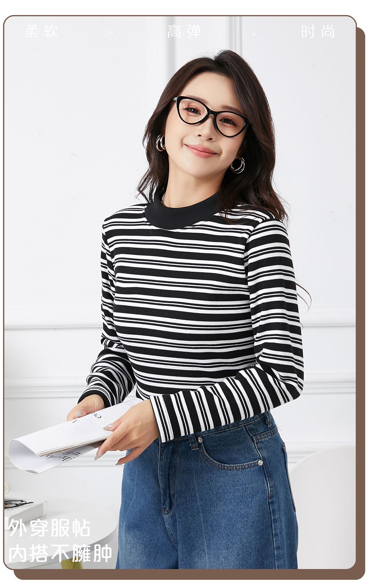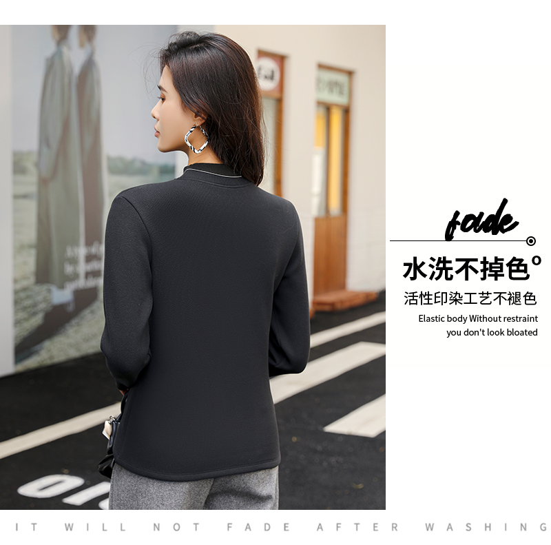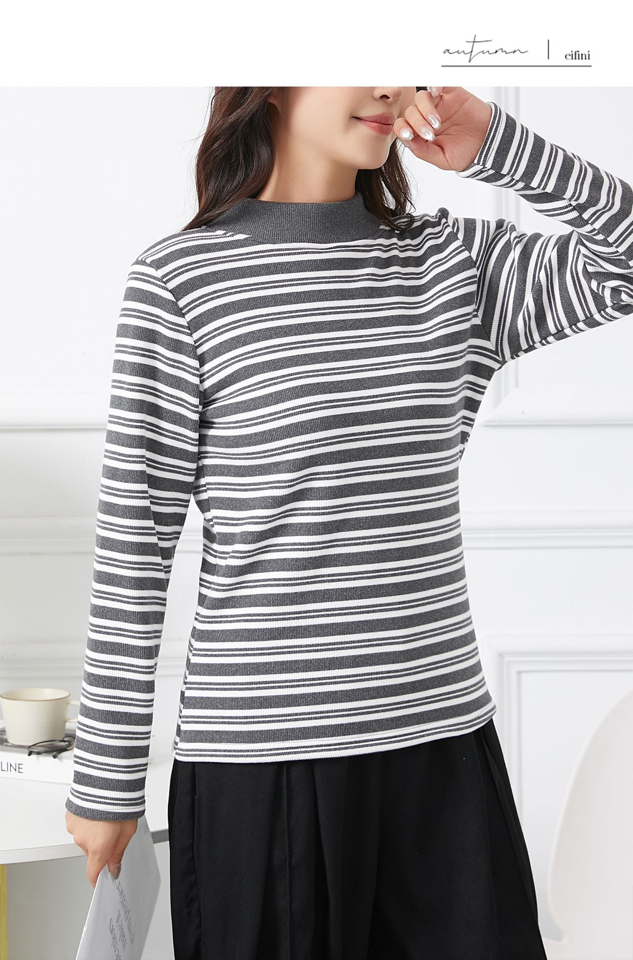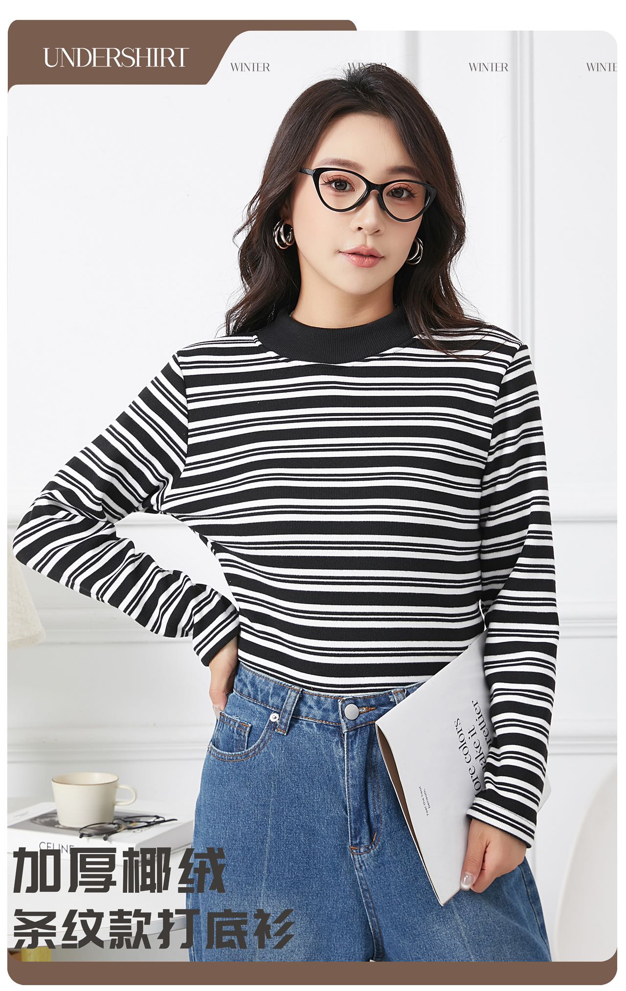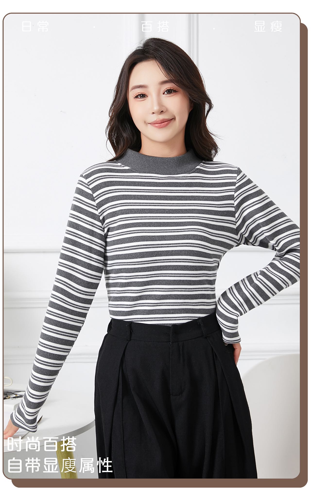 420g考拉绒罗纹椰绒云感衣条纹黑白保暖衣打底衫加绒加厚女士中领T09/2805/M287